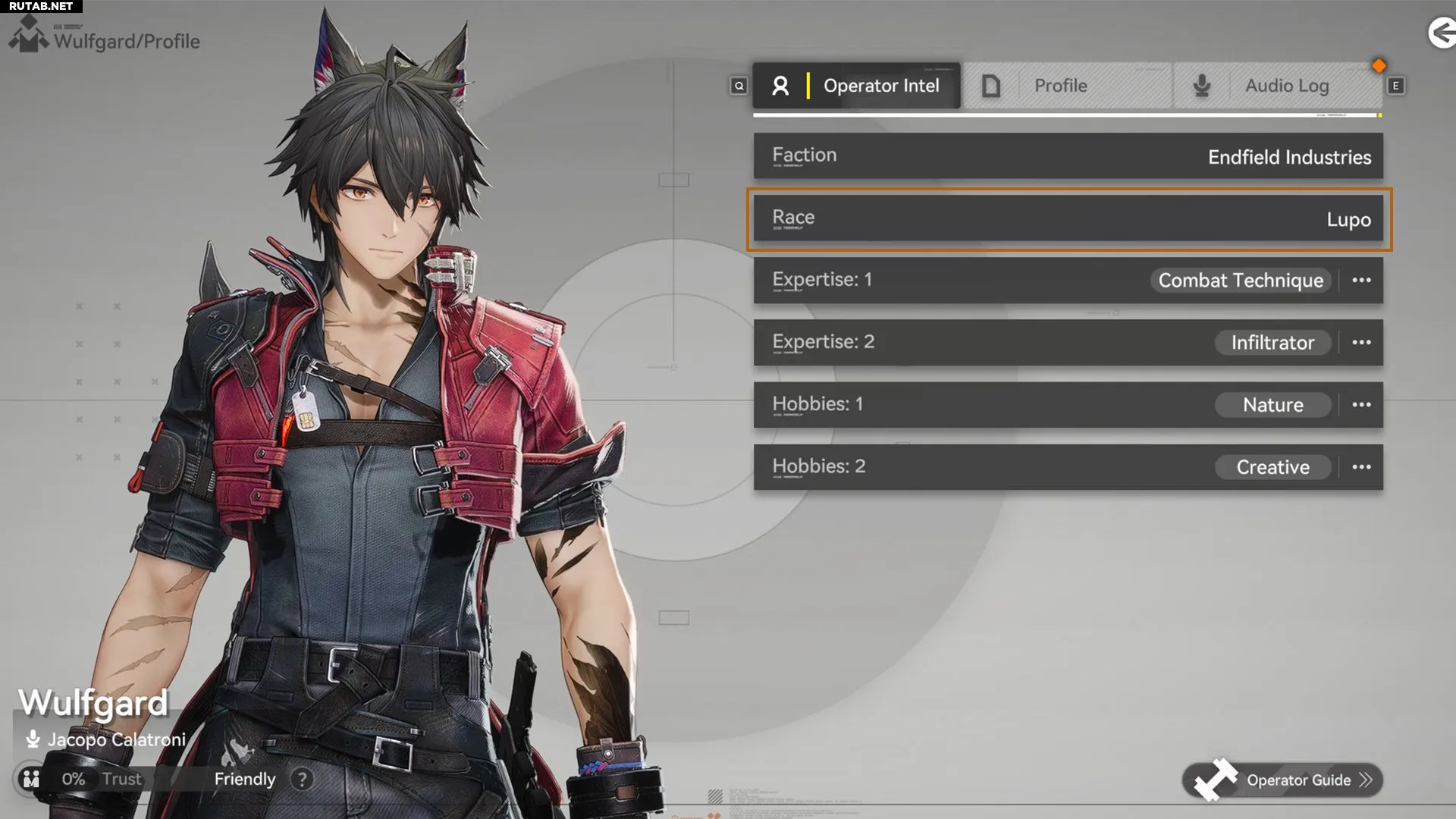Лупо — это одна из рас в мире Arknights. Узнать расу оператора можно на странице его обзора, нажав кнопку профиля в правом нижнем углу. На данный момент, для выполнения задания события Карли, единственным доступным игроку оператором расы Лупо является Вульфгард.