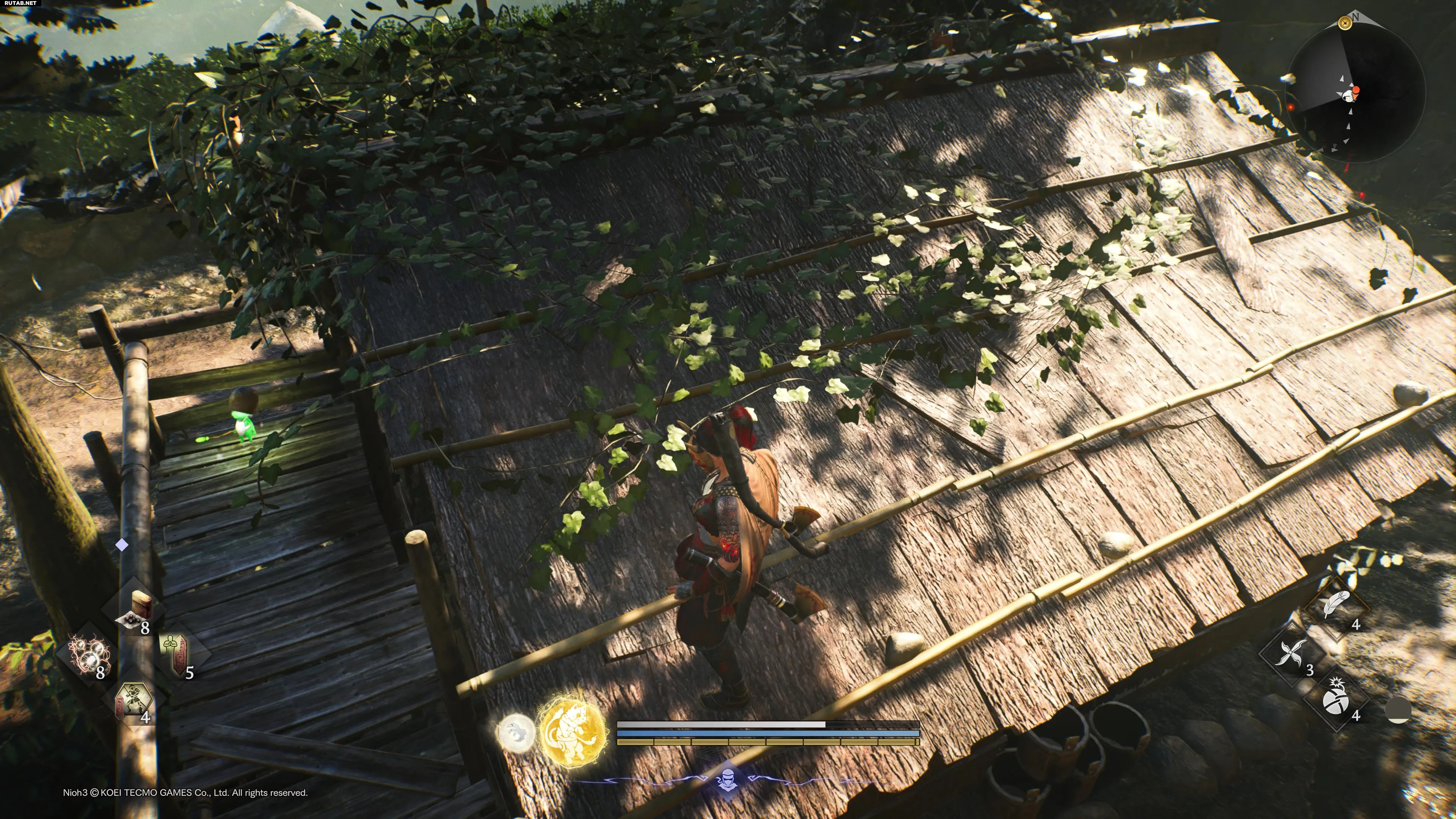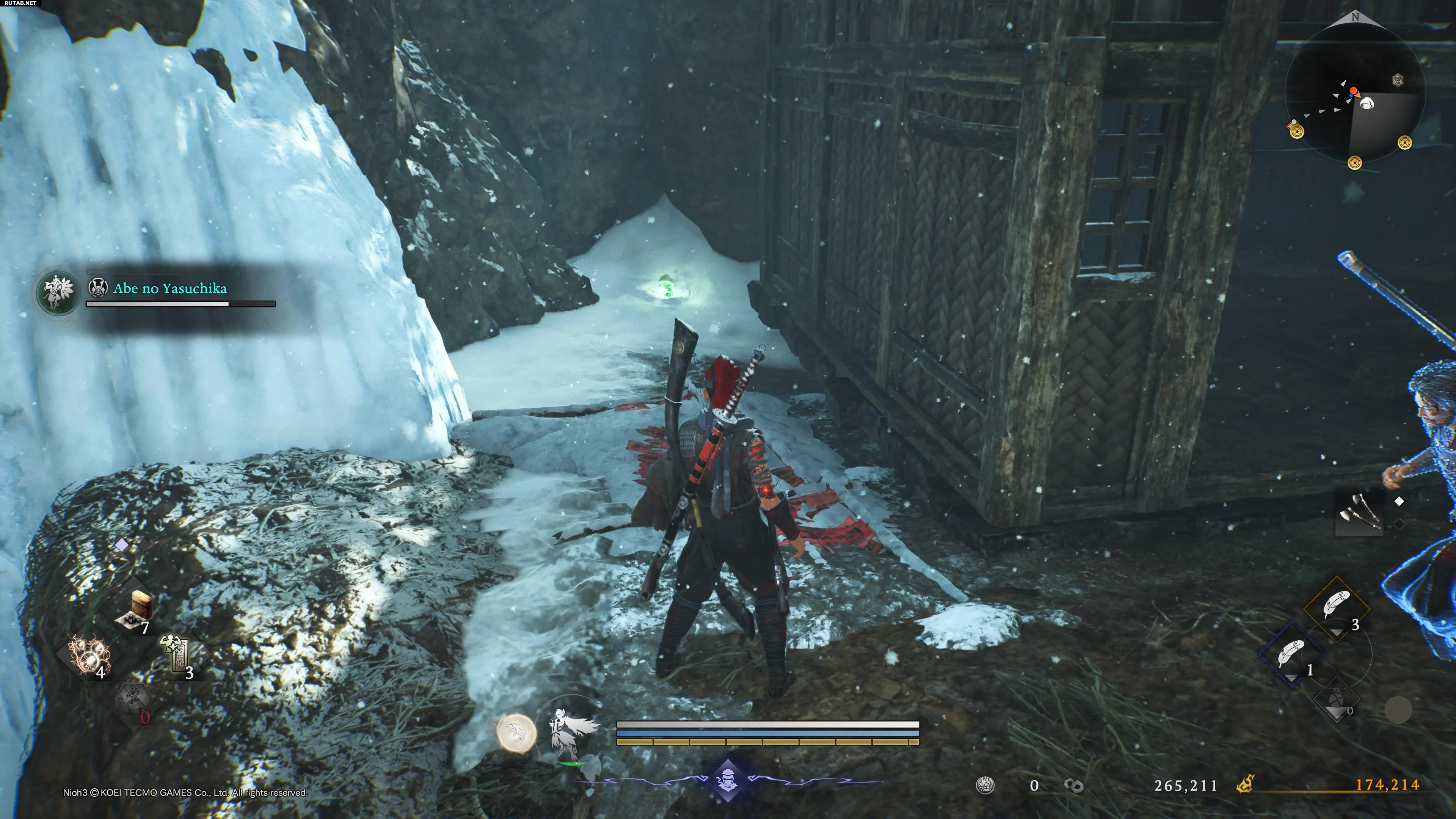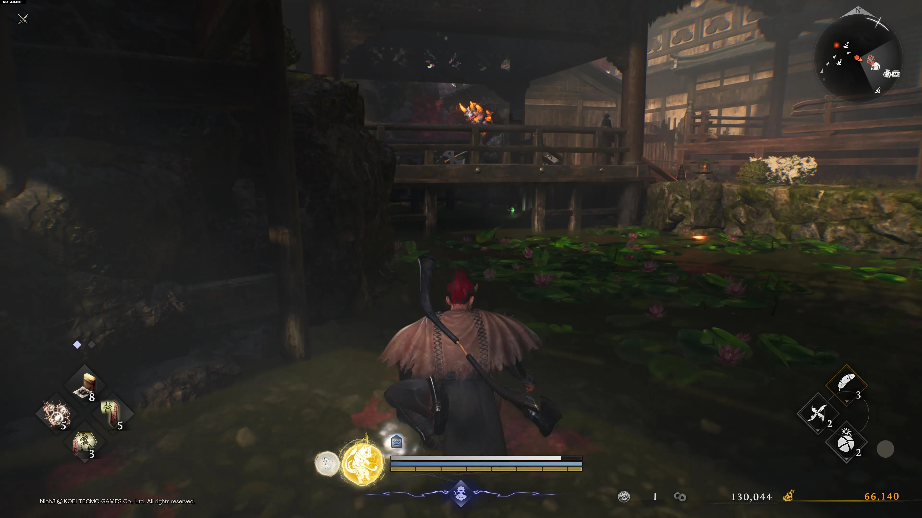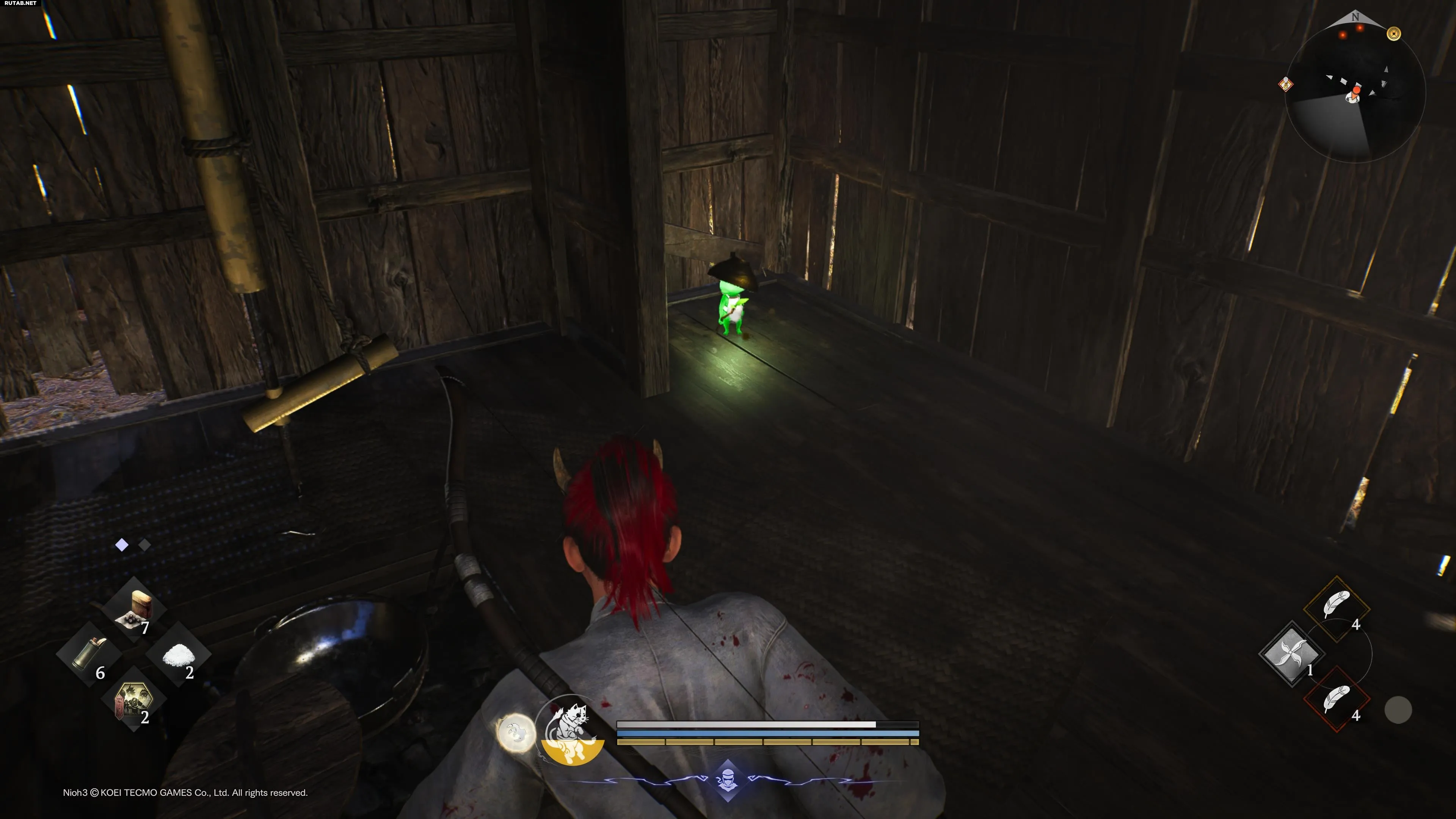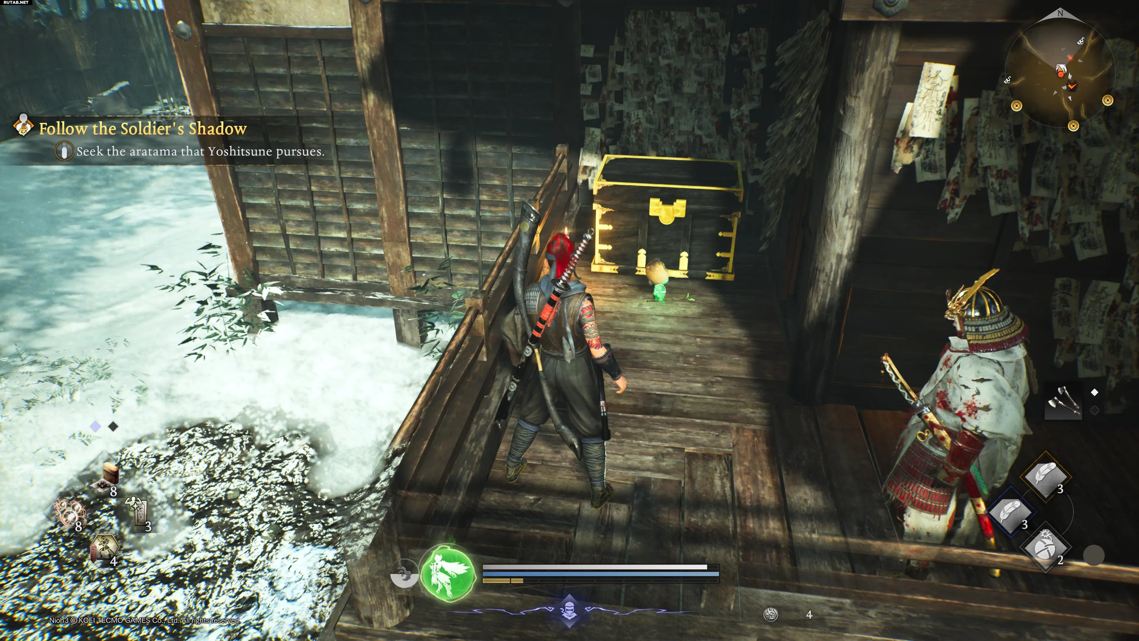 Проследуйте за Ямаину, пока он не остановится у моста. Затем сверните налево и пройдите между домами. Разберитесь с ёкаями в этом месте и пройдите в небольшой проход, где виден каменный фонарь.