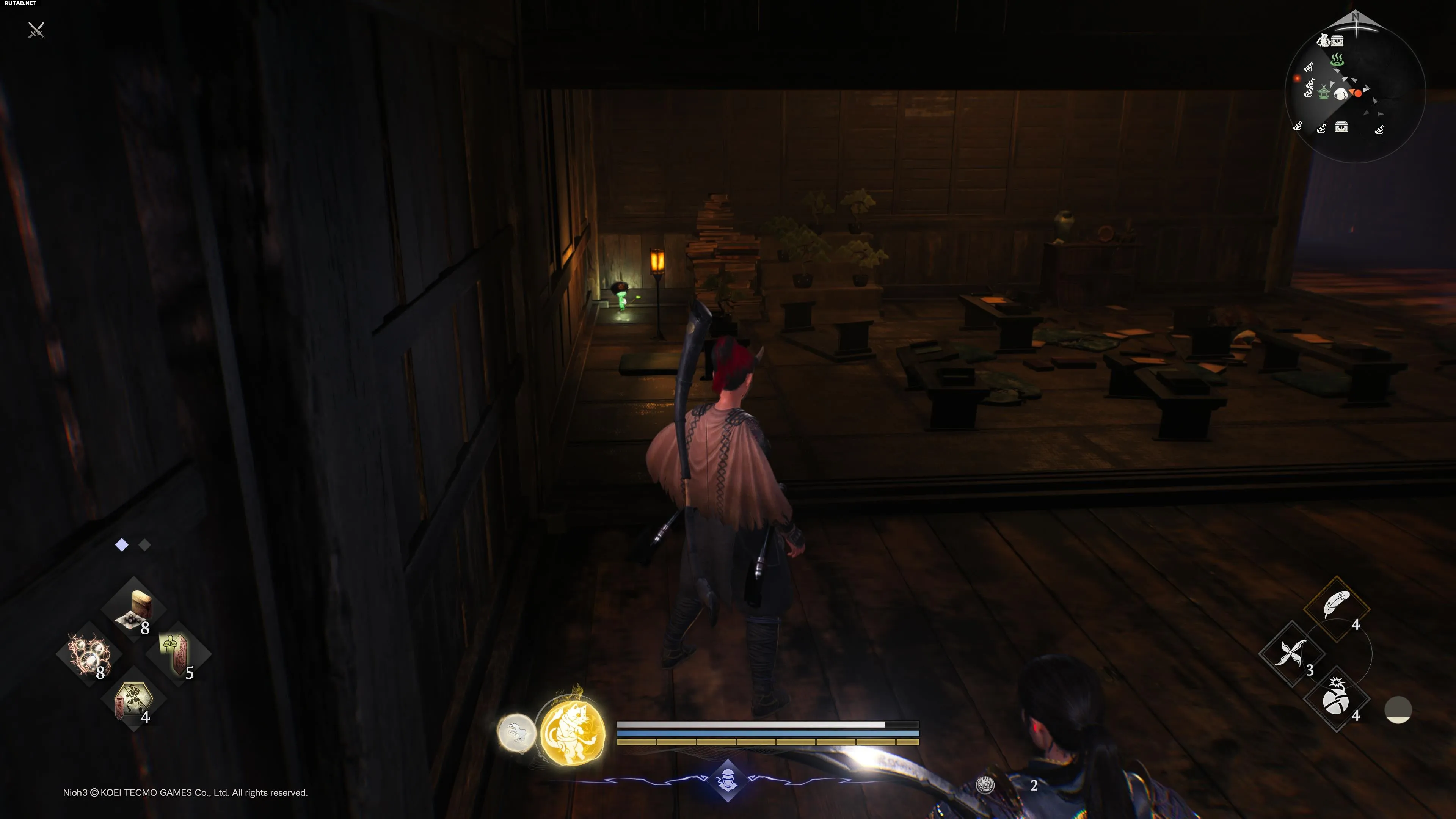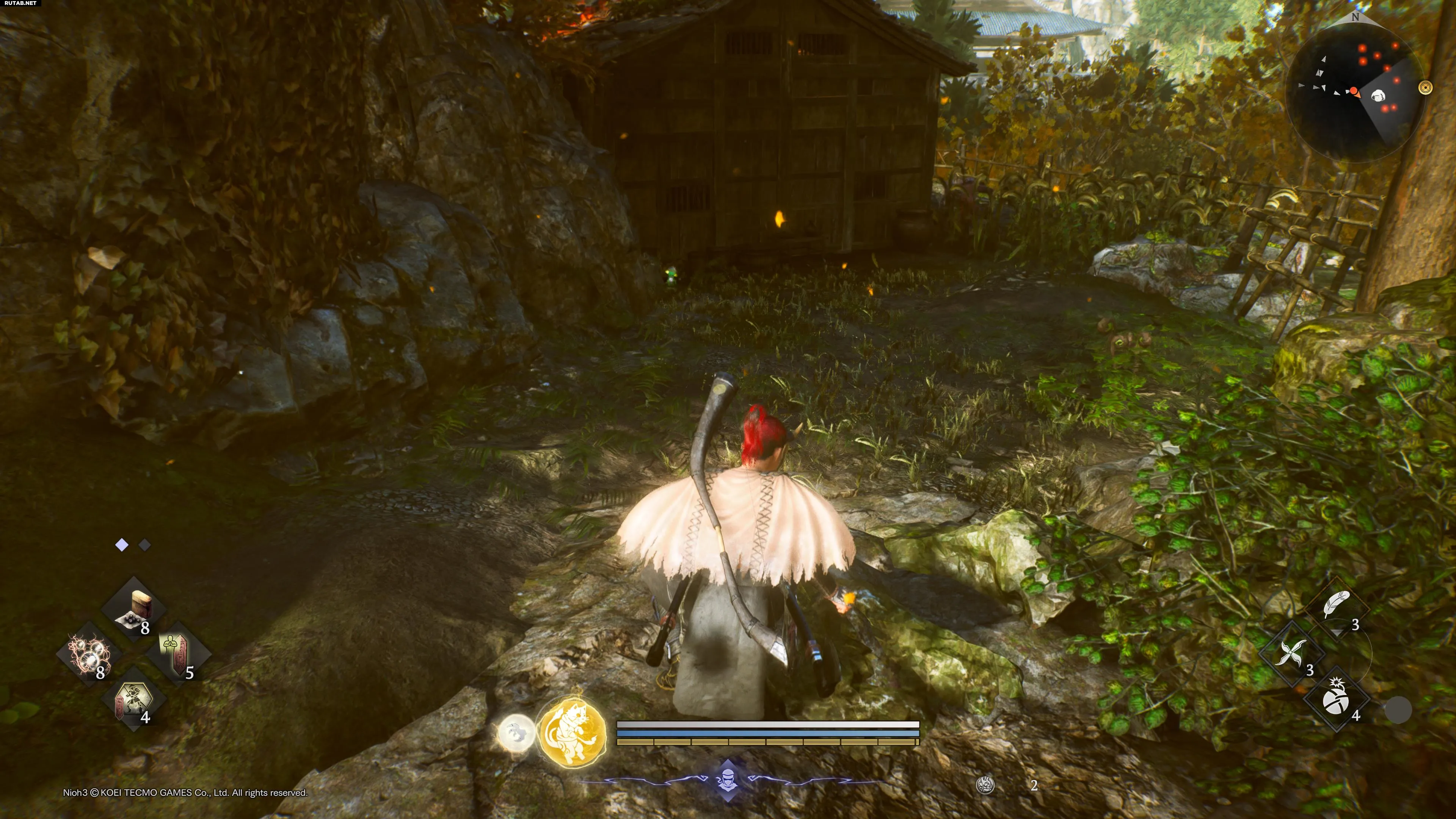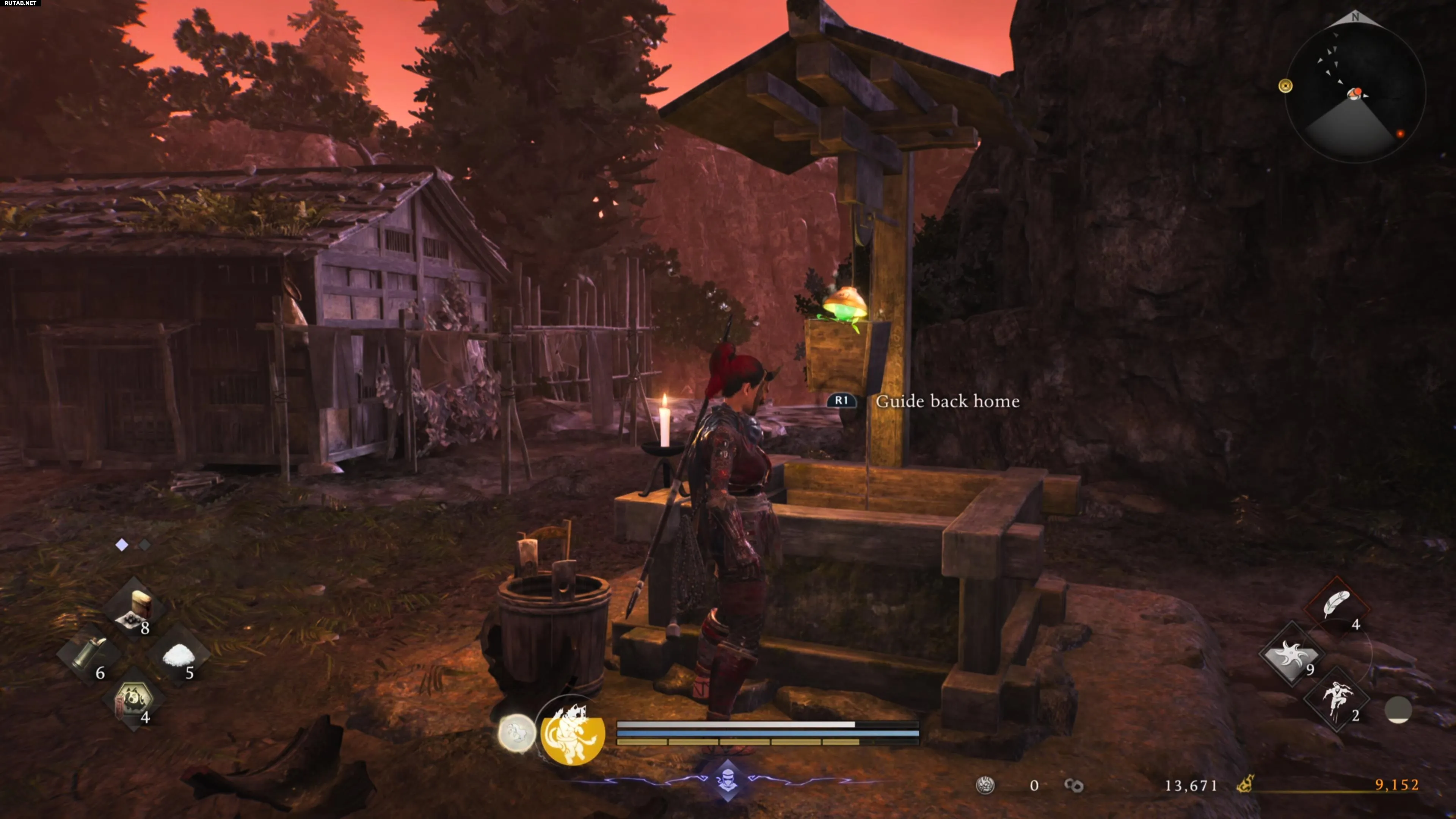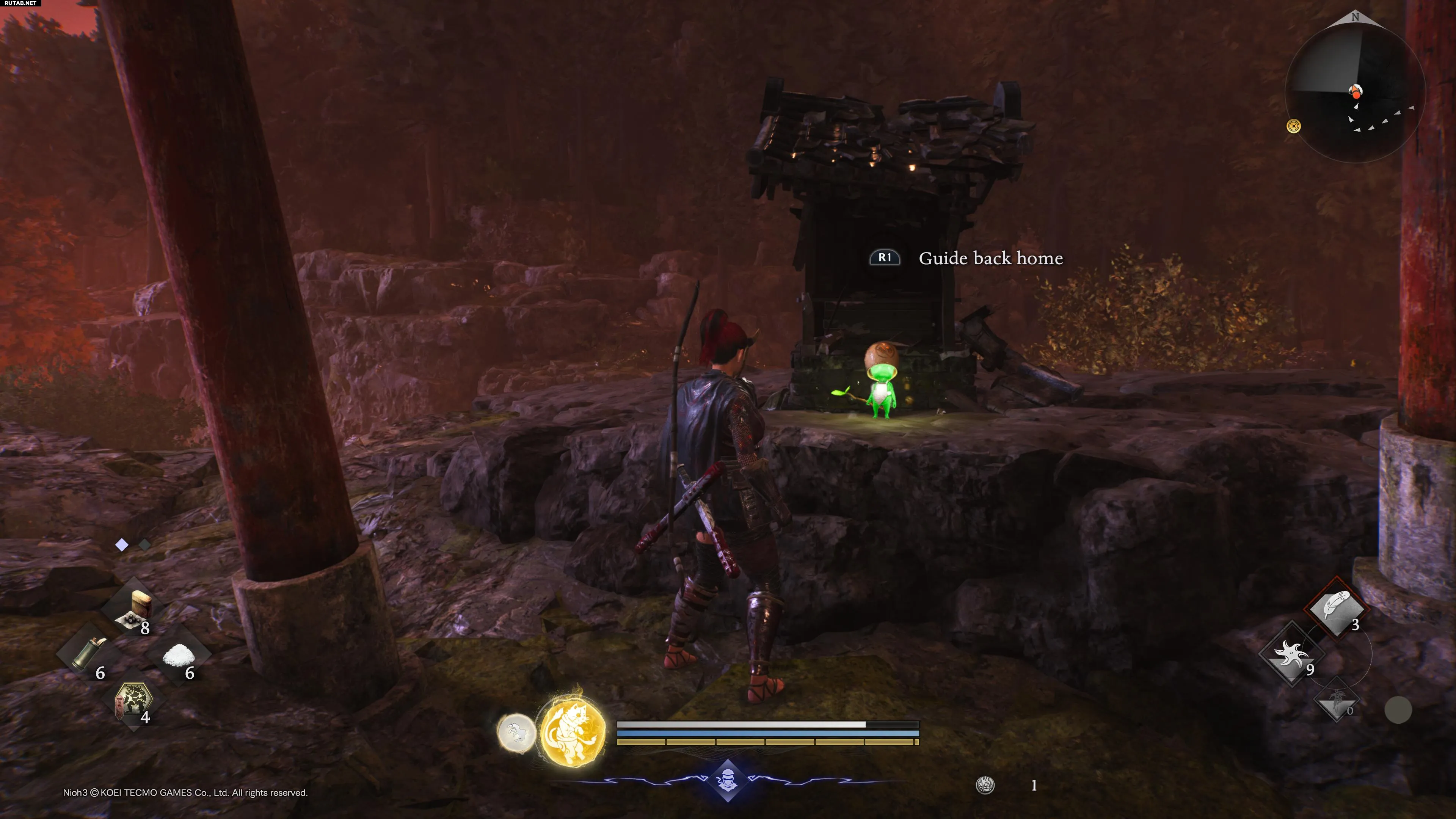 Проследуйте за Ямаину, пока он не остановится у моста. Затем сверните налево и пройдите между домами. Разберитесь с ёкаями в этом месте и пройдите в небольшой проход, где виден каменный фонарь.