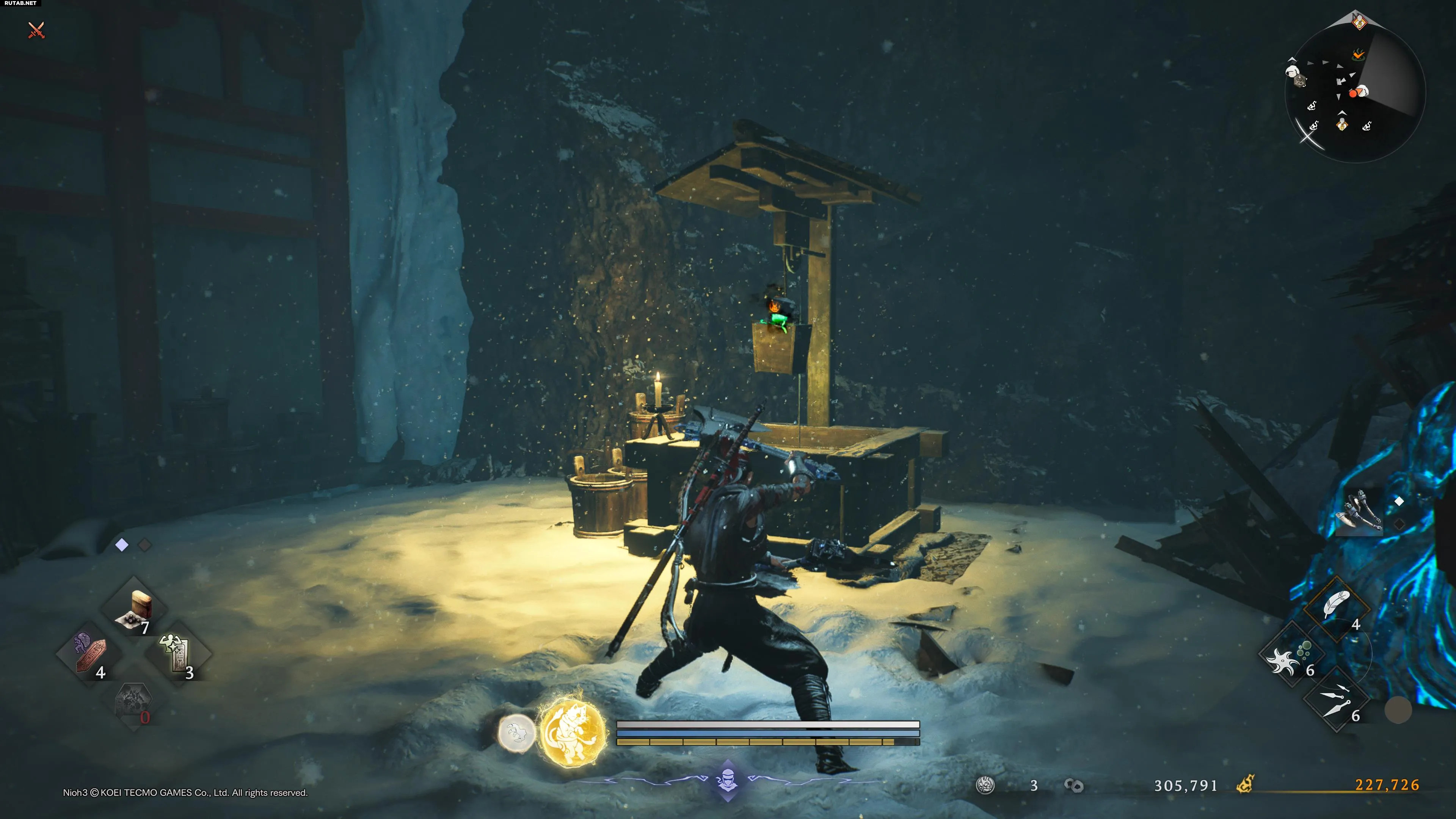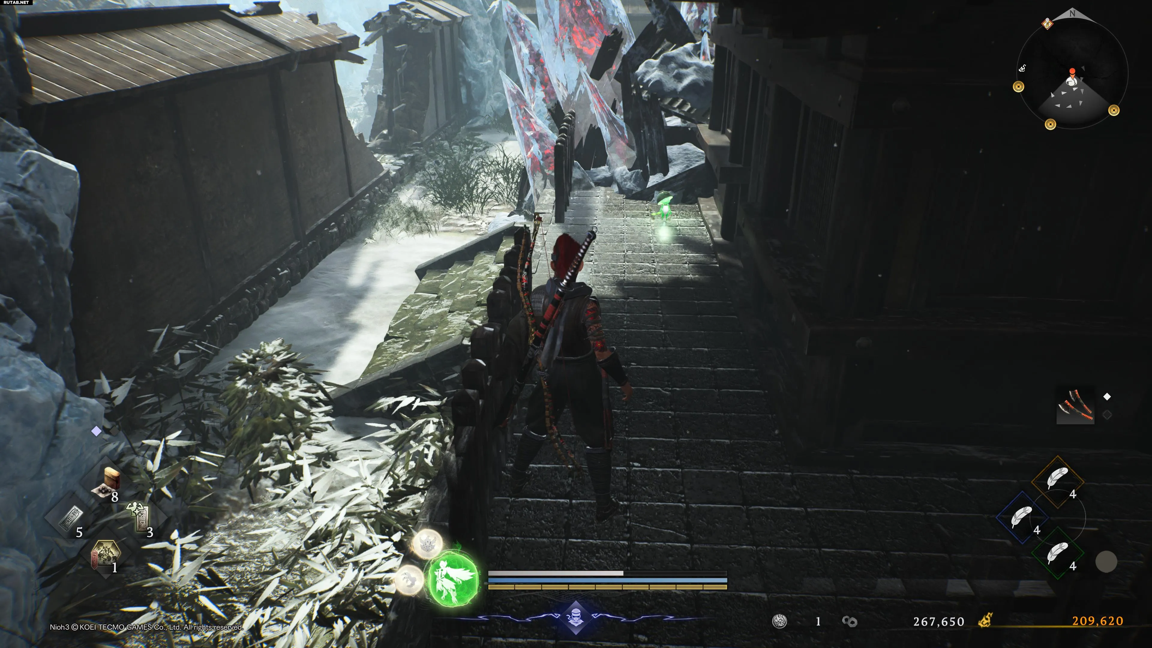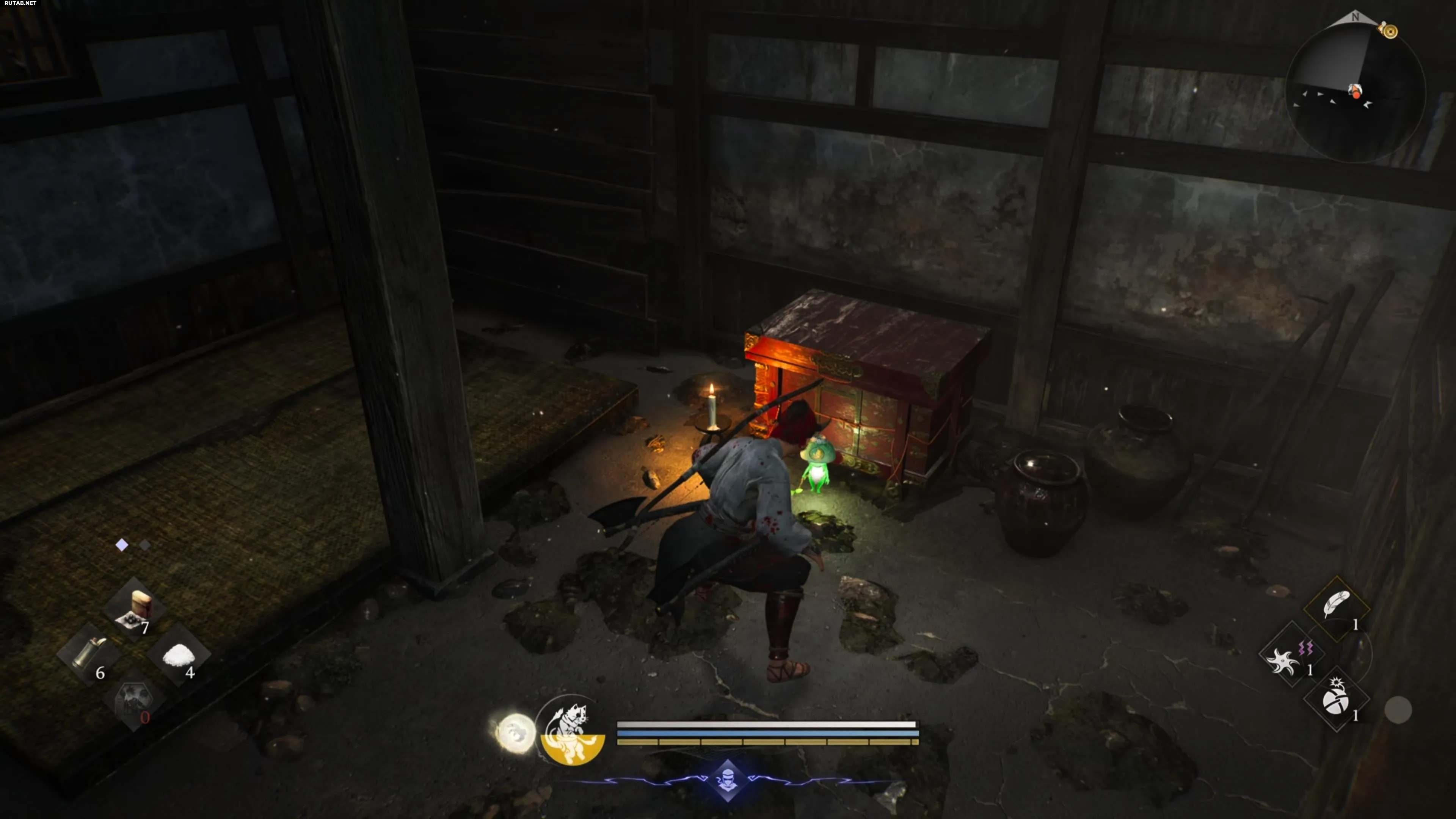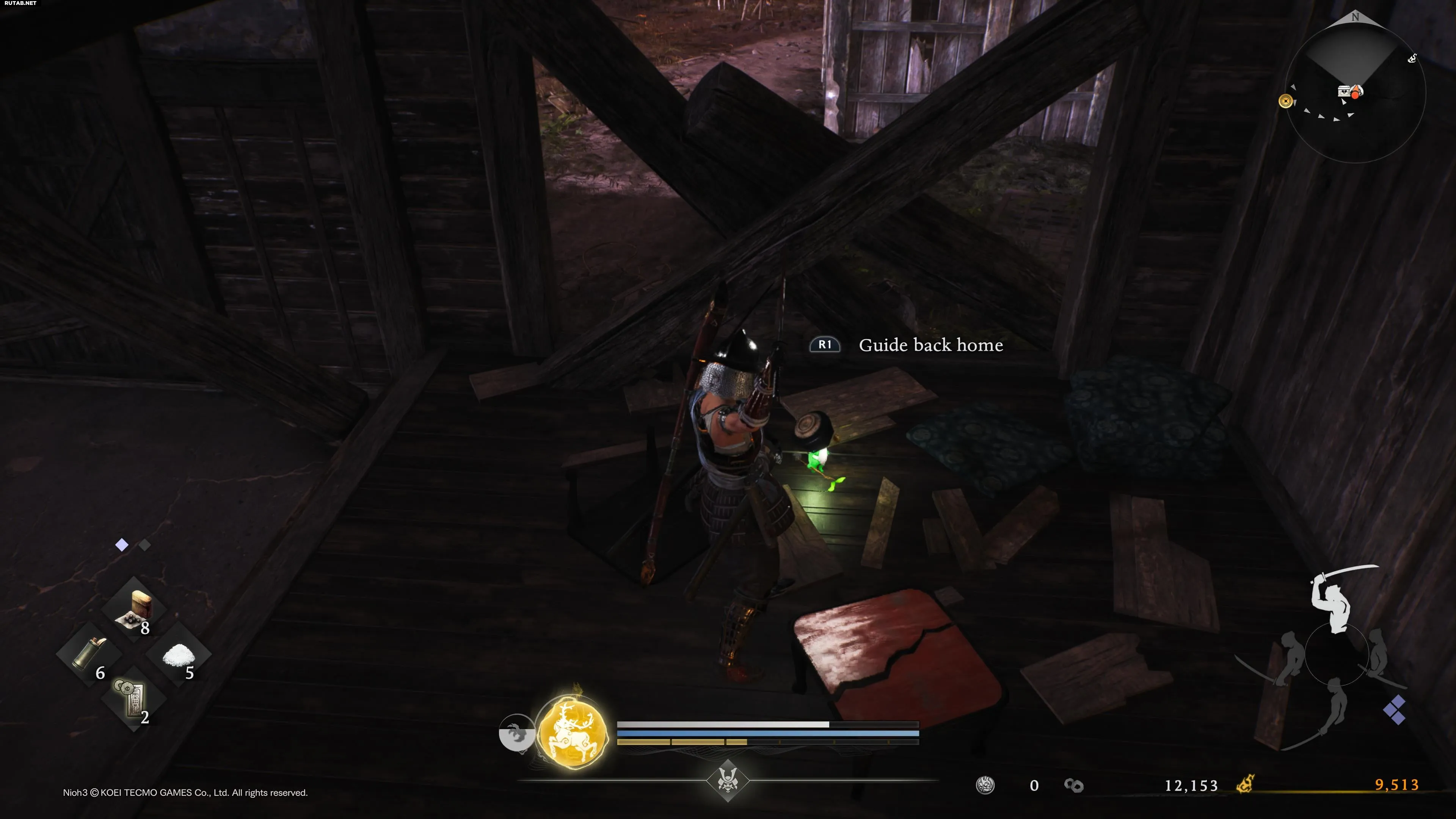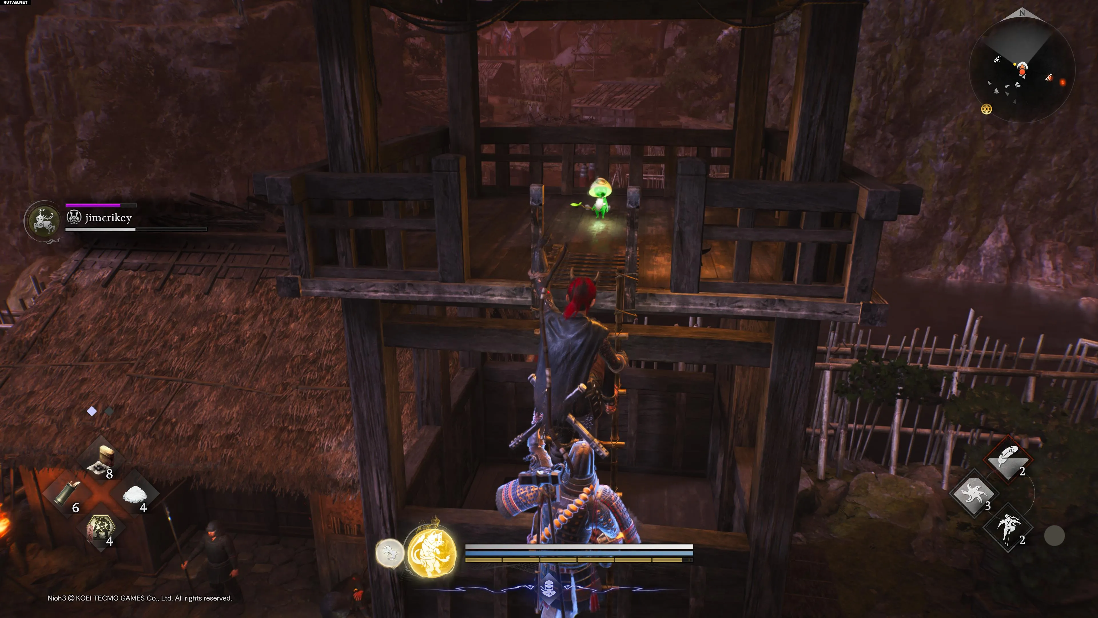 Проследуйте за Ямаину, пока он не остановится у моста. Затем сверните налево и пройдите между домами. Разберитесь с ёкаями в этом месте и пройдите в небольшой проход, где виден каменный фонарь.