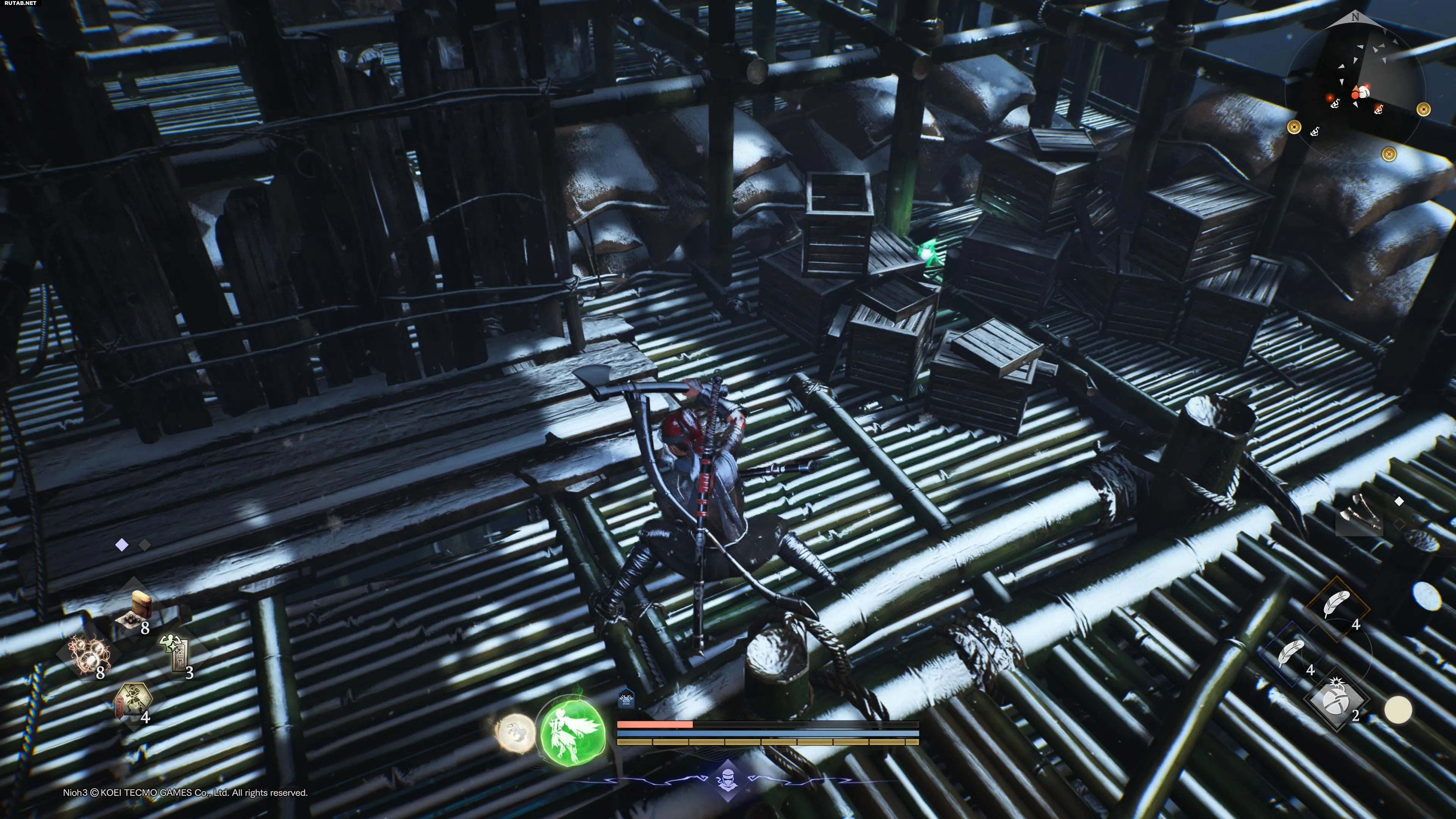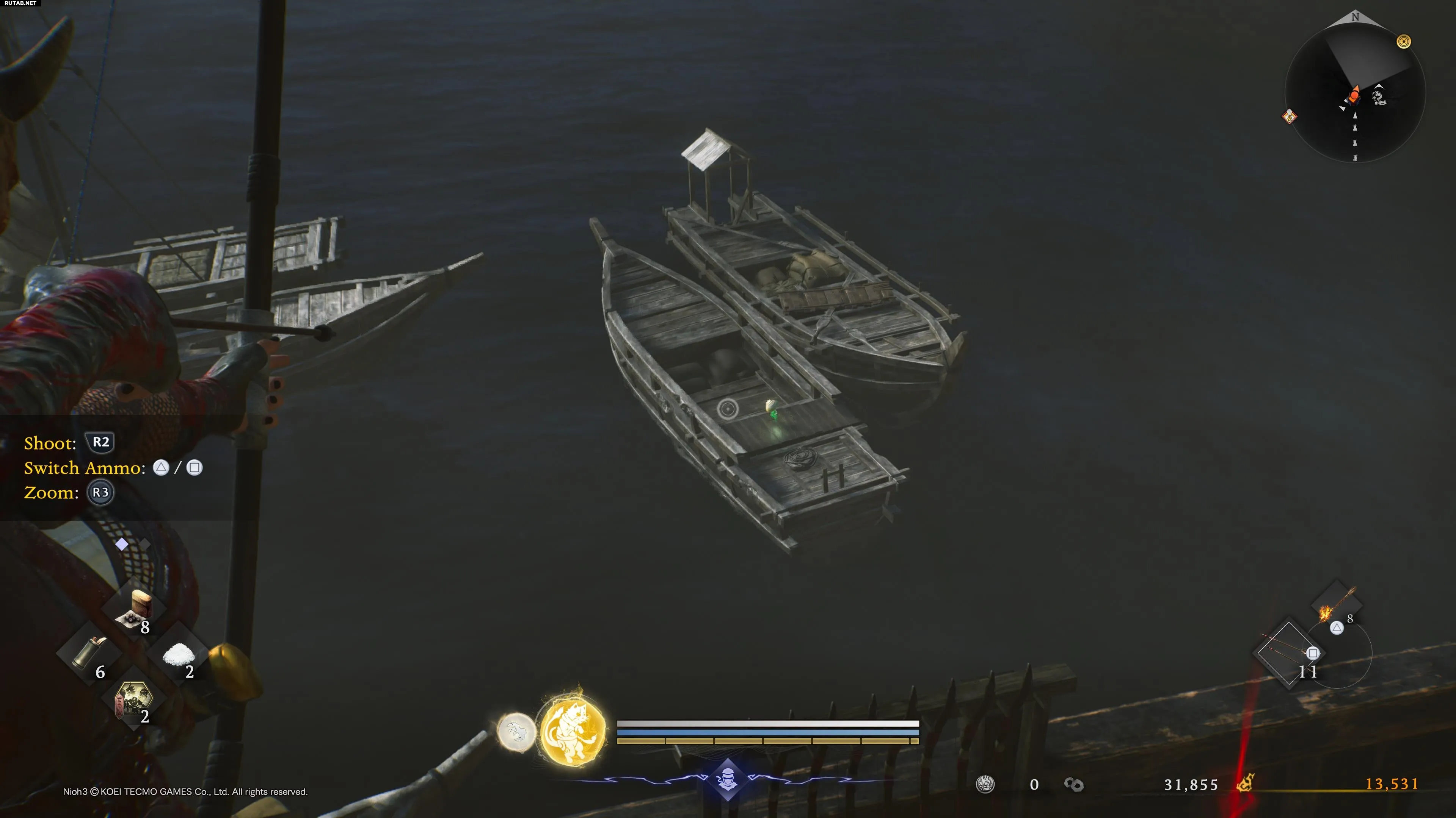 Переключитесь на стиль ниндзя и аккуратно преодолейте платформинг по этим лодкам. Кодама стоит на корме одной из них.