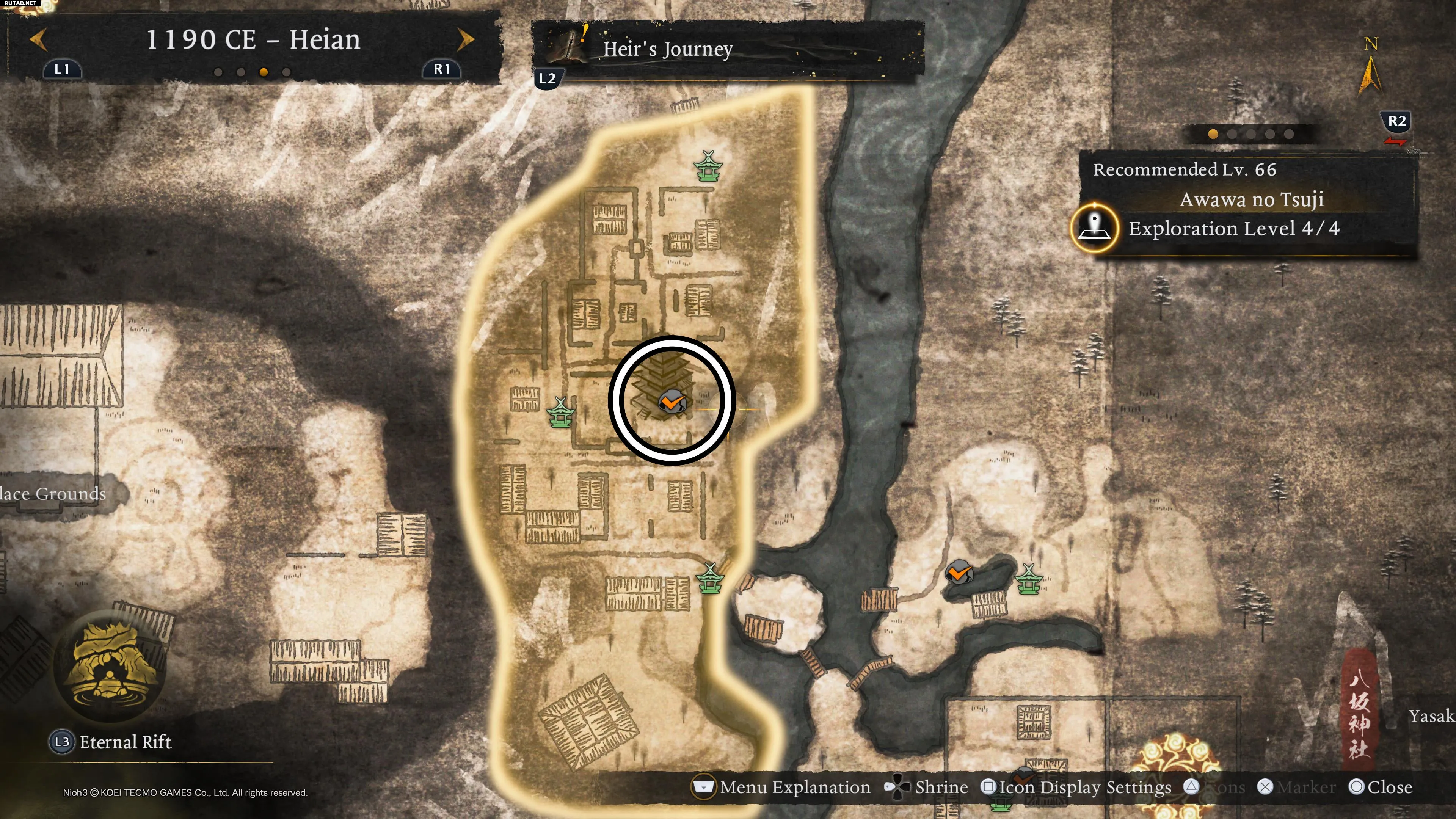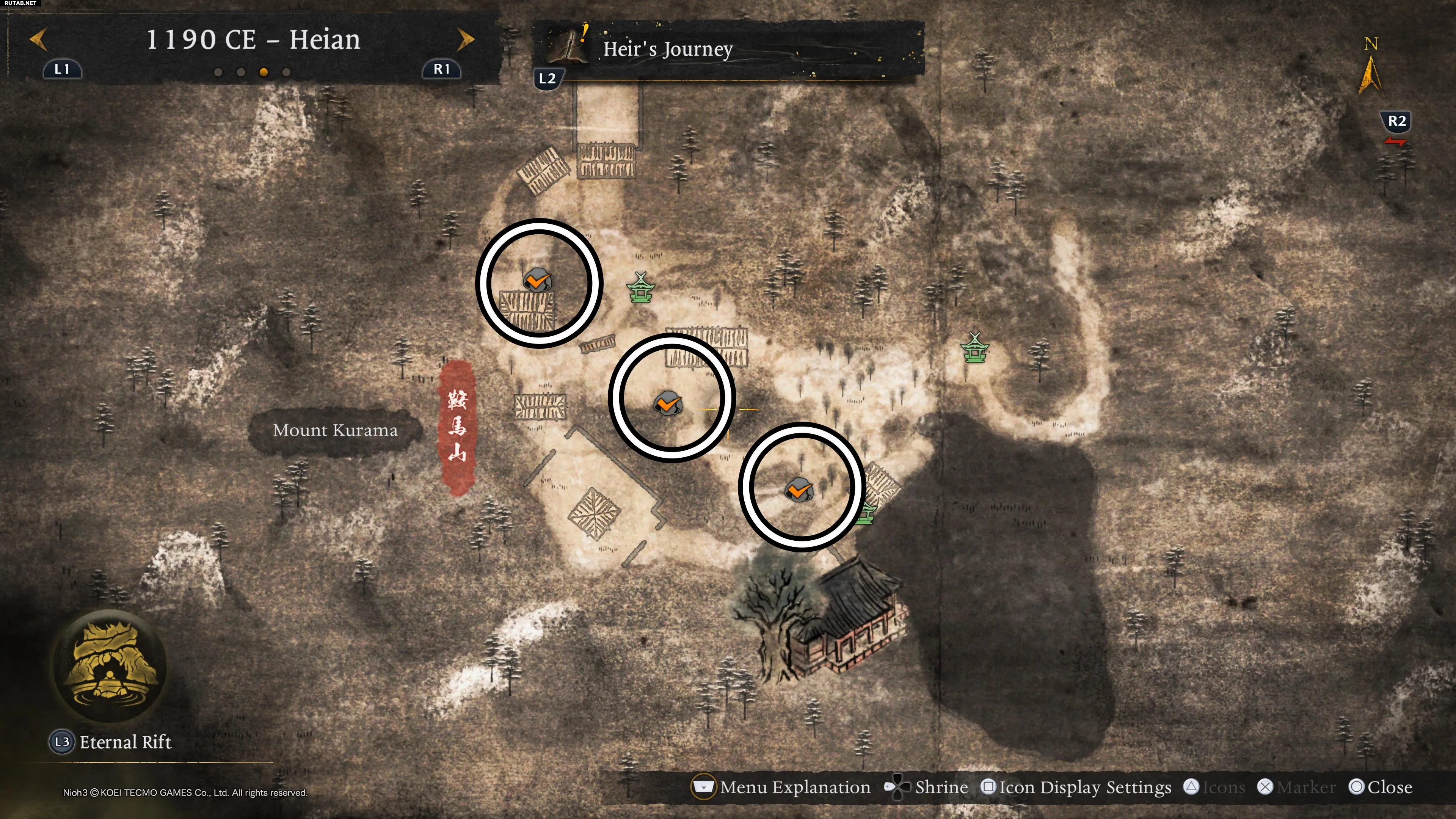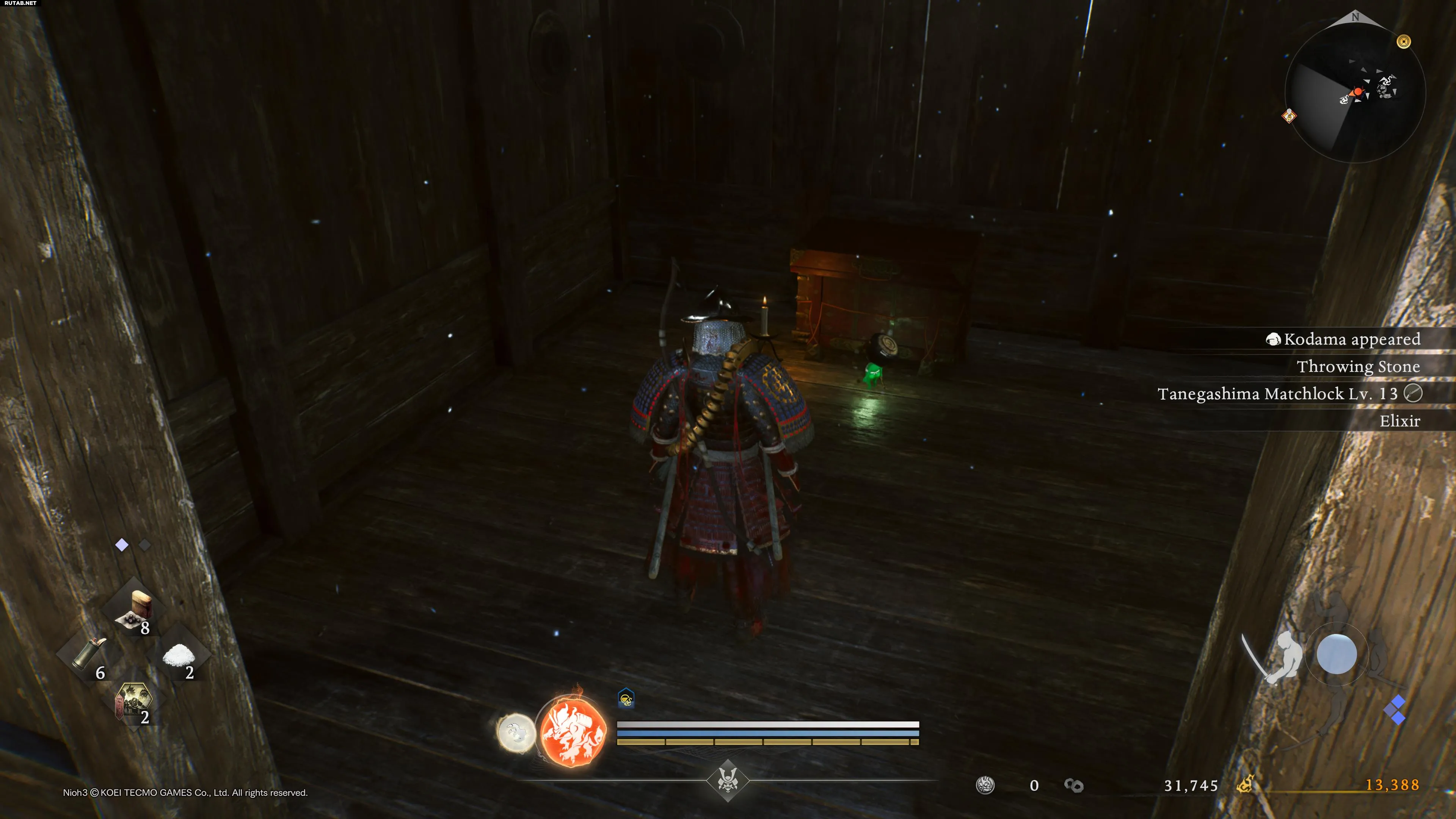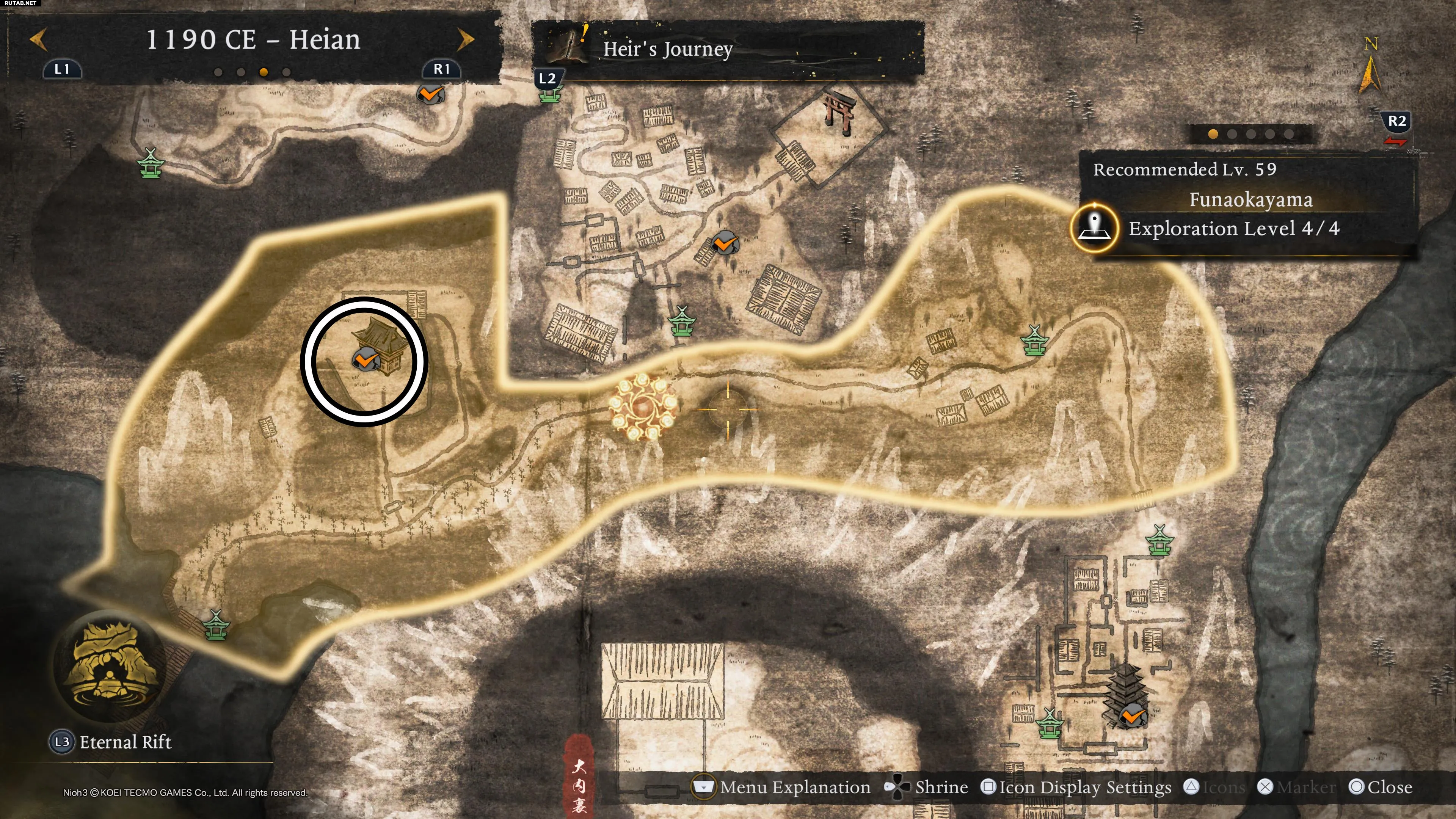 В рамках побочного квеста «Следуя за тенью солдата» Минамото-но Ёсицунэ предложит помочь вам очистить вражескую базу в левой части Фунаокаяма. После того как вы справитесь с задачей, Кодама появится перед сундуком слева от храма.