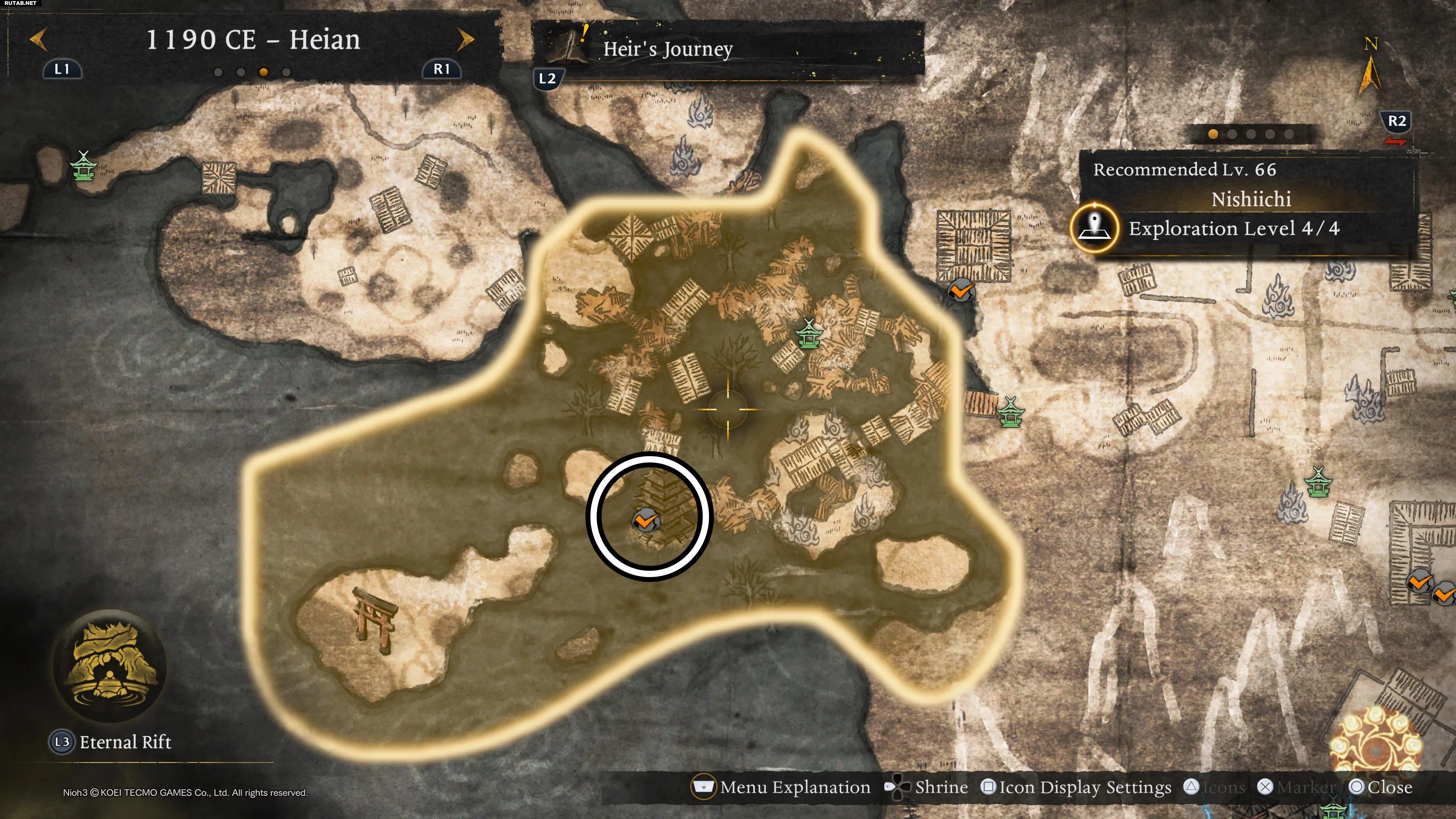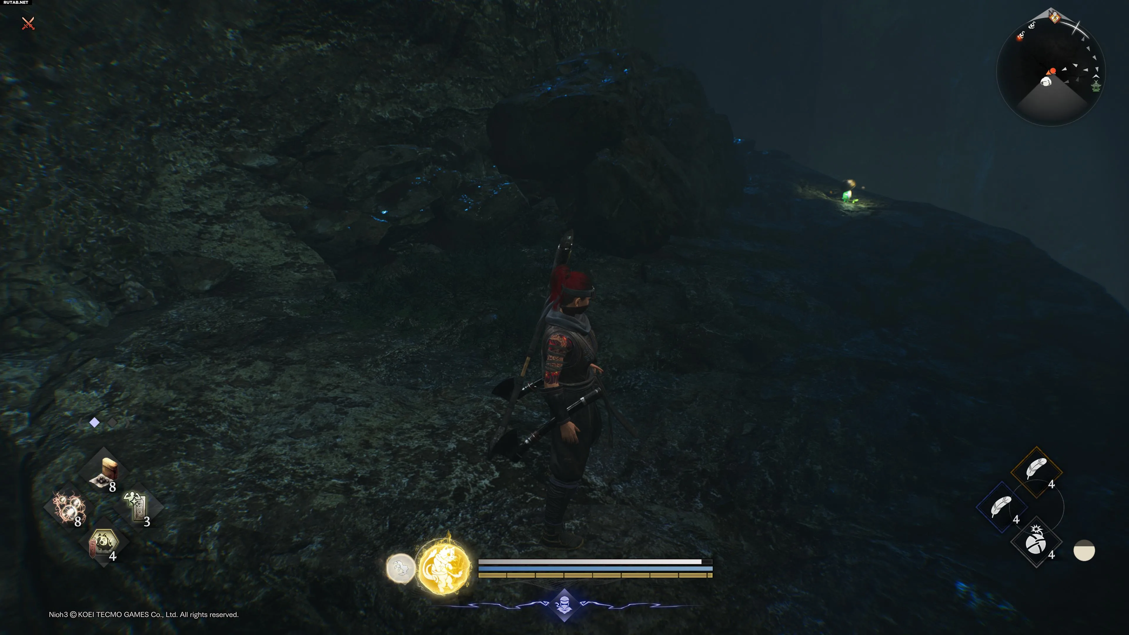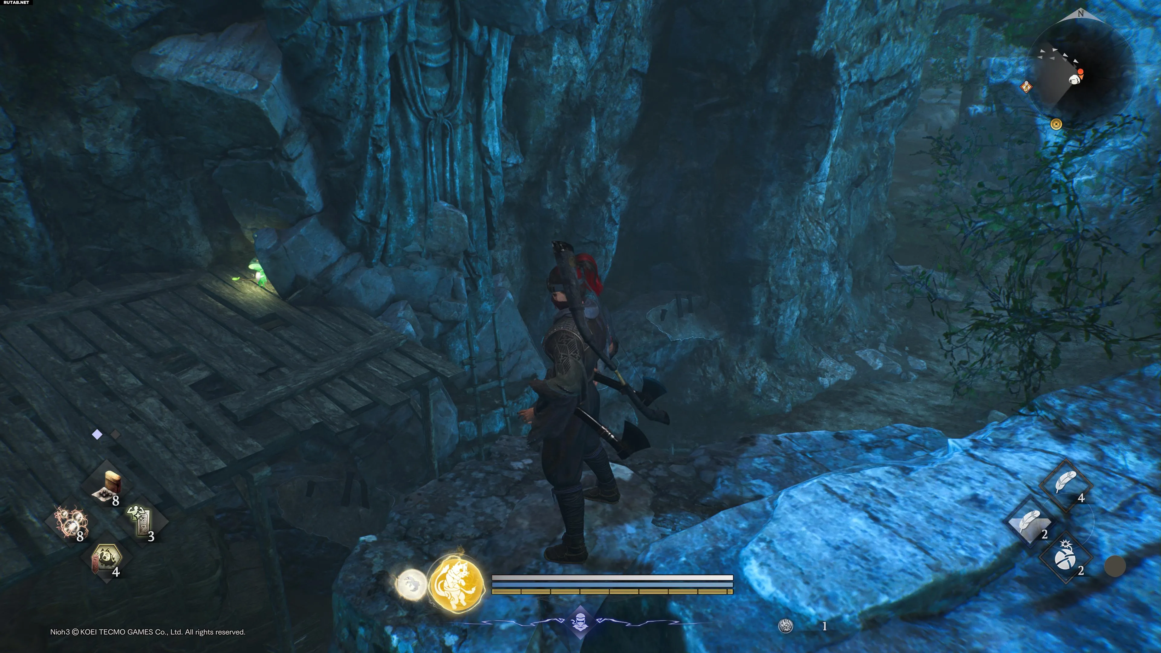От святилища Мацуо-тайся: Пещера Монахов вернитесь назад и спуститесь по тропинке вниз, где находятся ёкаи Нурэ-онна и Бакэгани. Победите их, а затем перейдите в следующую зону, где обитает более крупный Бакэгани.
