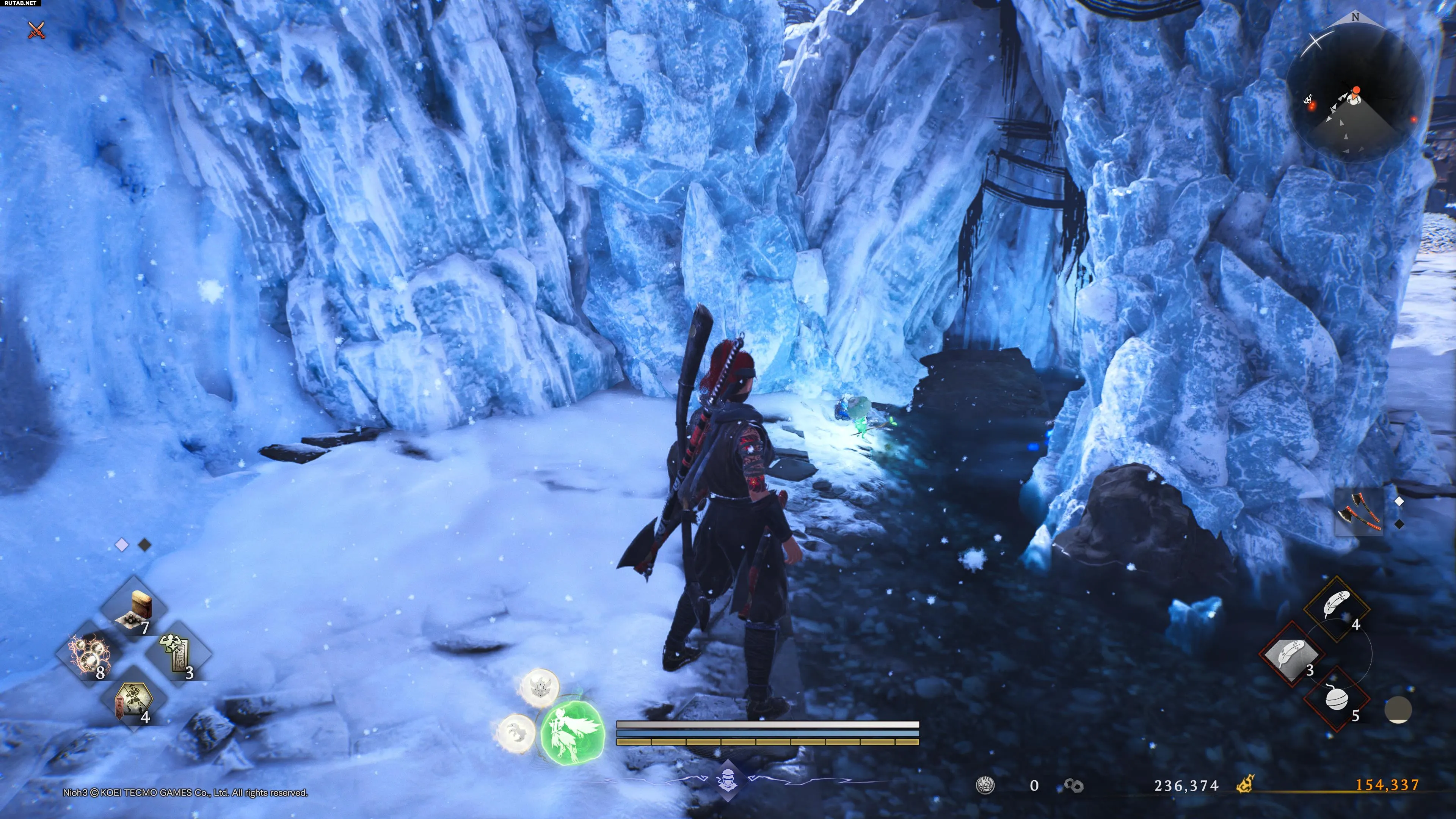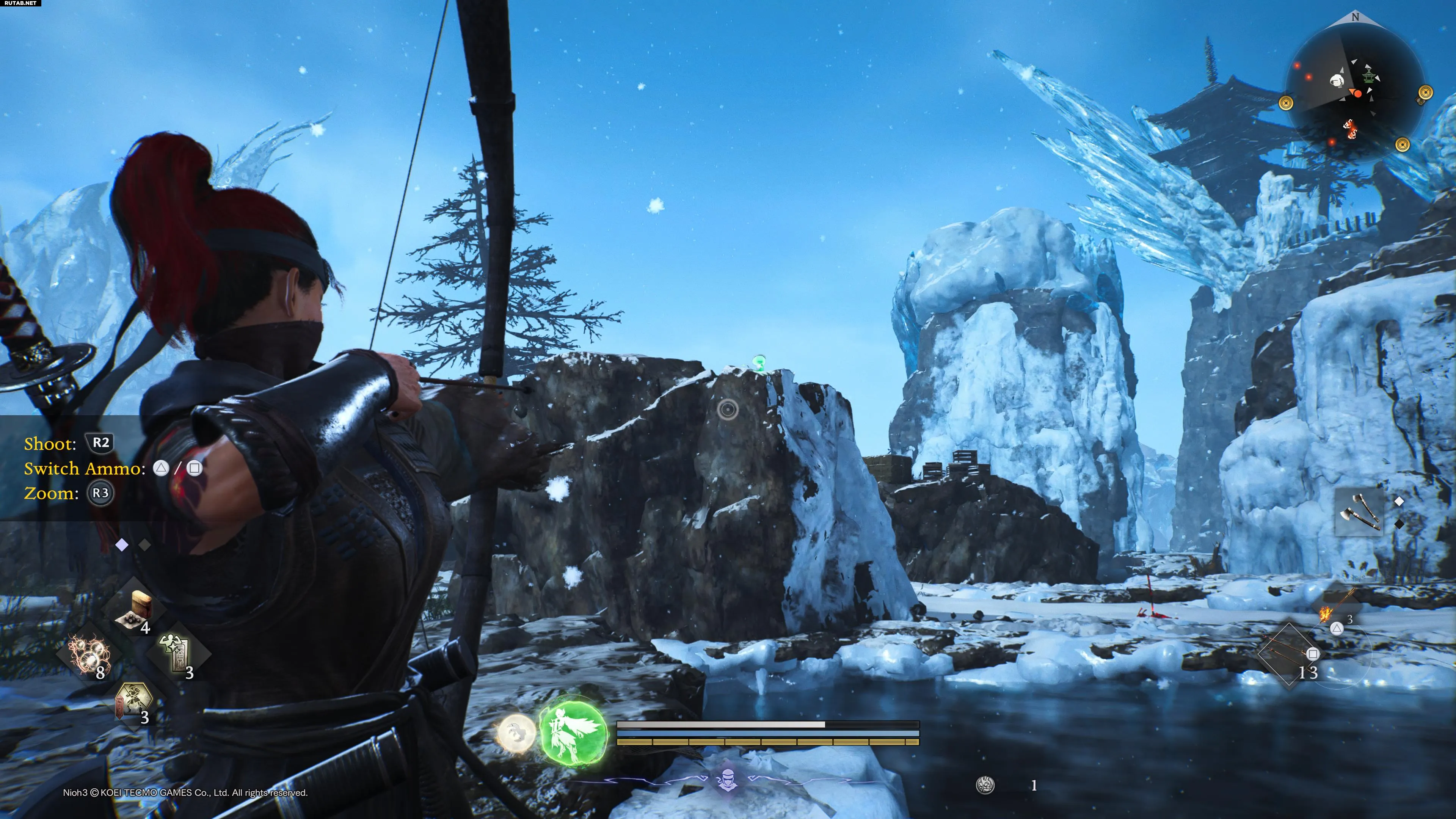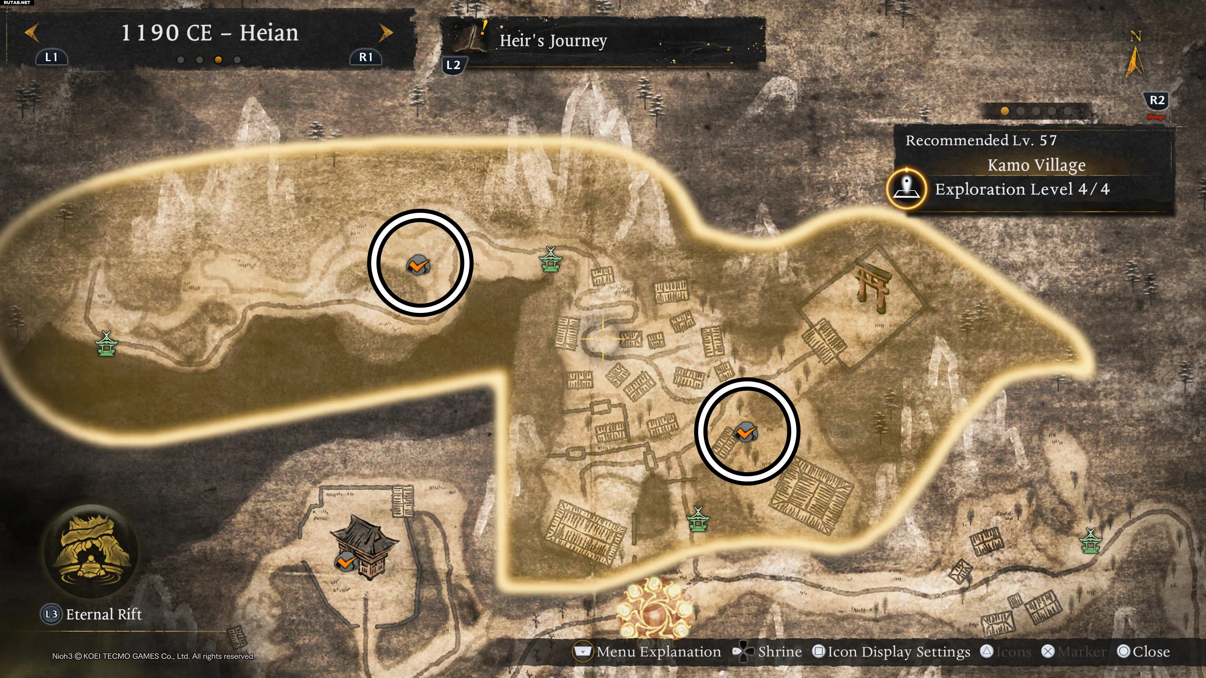 От святилища Мацуо-тайся: Пещера Монахов вернитесь назад и спуститесь по тропинке вниз, где находятся ёкаи Нурэ-онна и Бакэгани. Победите их, а затем перейдите в следующую зону, где обитает более крупный Бакэгани.