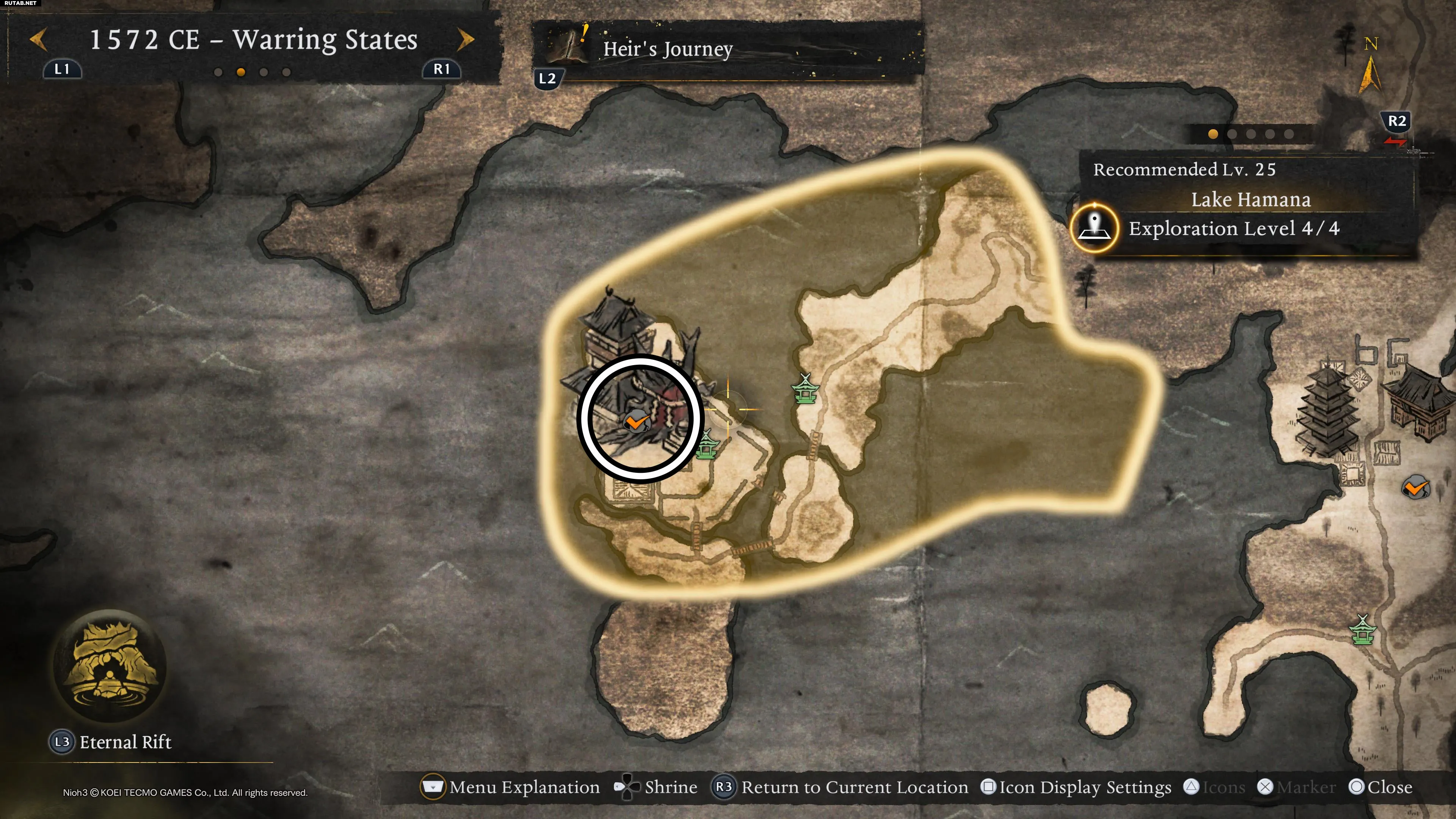 Третья Кодама на Реке Тэнрю расположена ближе к западной части карты. Доберитесь до святилища Ворота Хамамацу. Пройдите в небольшой форпост прямо к северу от него и заберитесь на правую сторожевую башню впереди, чтобы найти этого духа.