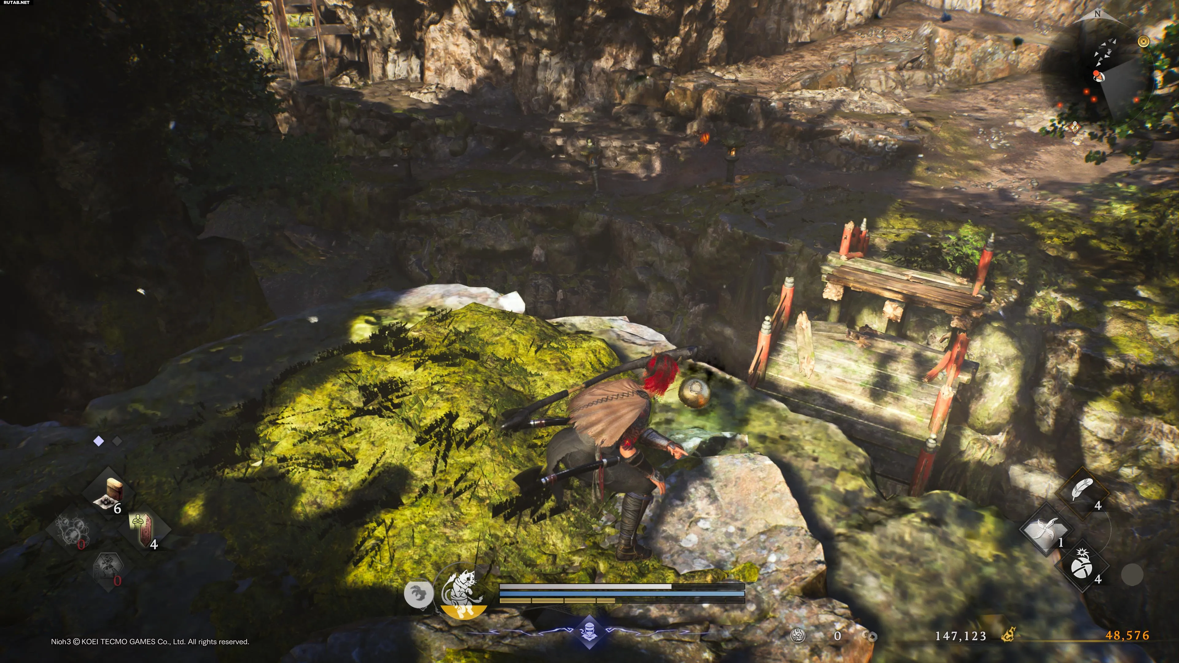 Спрыгните с левой стороны моста впереди и пройдите по Жиле духа. Запрыгивайте на скалы, пока не достигнете ворот тории. Спуститесь по левой стороне и, преодолевая платформинг, доберитесь до поляны с большим красным деревом.