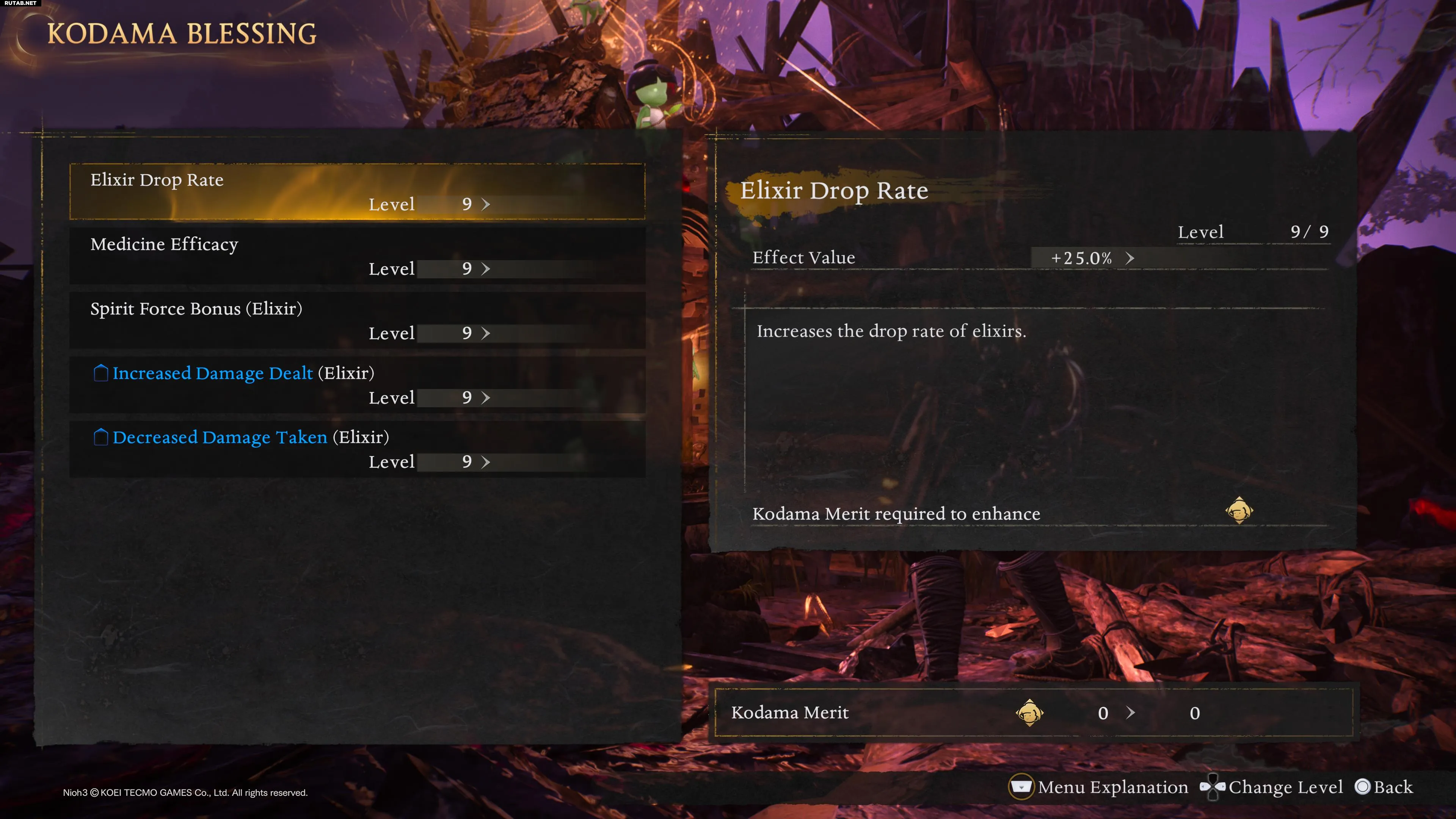 Их можно обменять в святилище, чтобы повысить шанс выпадения эликсиров, усилить их лечащий эффект и два дополнительных баффа, которые они могут дать. Улучшения начисляются постепенно в виде процентов, но их будет тем больше, чем больше Кодама вы соберёте.