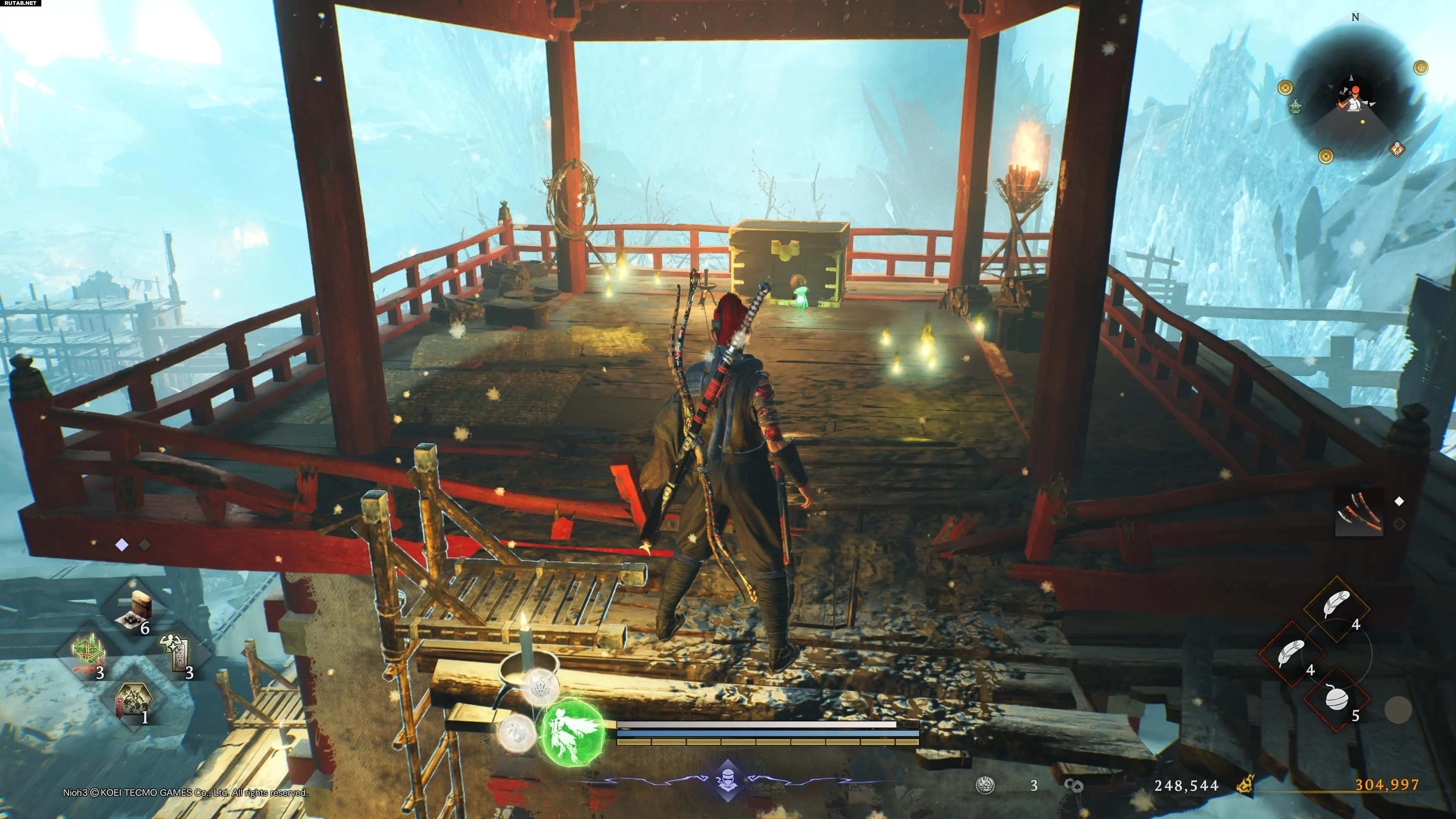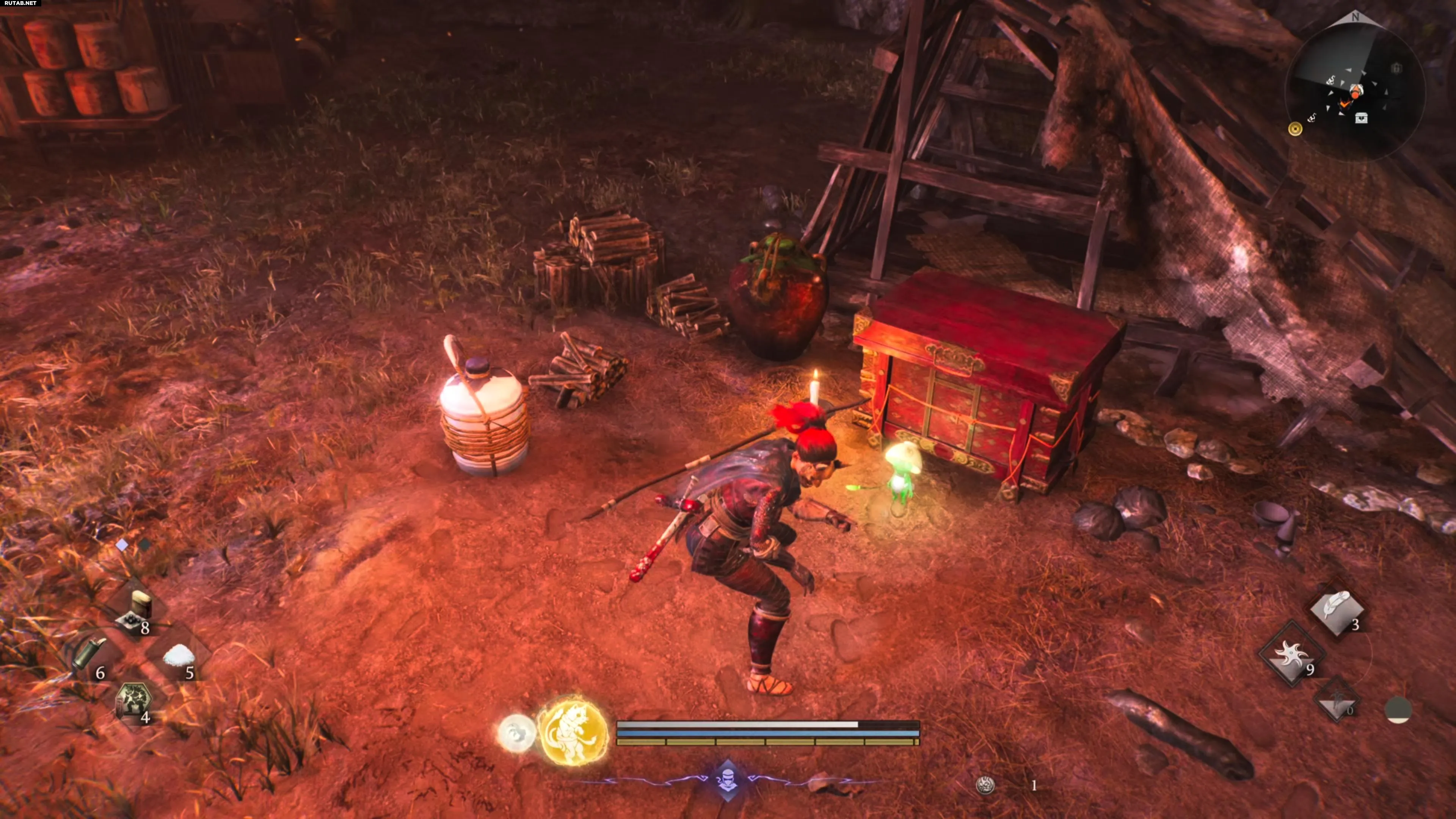 Уничтожьте каждого противника внутри, чтобы появилось сообщение о появлении Кодамы. Направляйтесь к красному сундуку в центре лагеря — она будет ждать вас перед ним. Не забудьте также проверить небольшой сундук чуть юго-восточнее, чтобы найти текст секретного навыка «Жизненный дух».