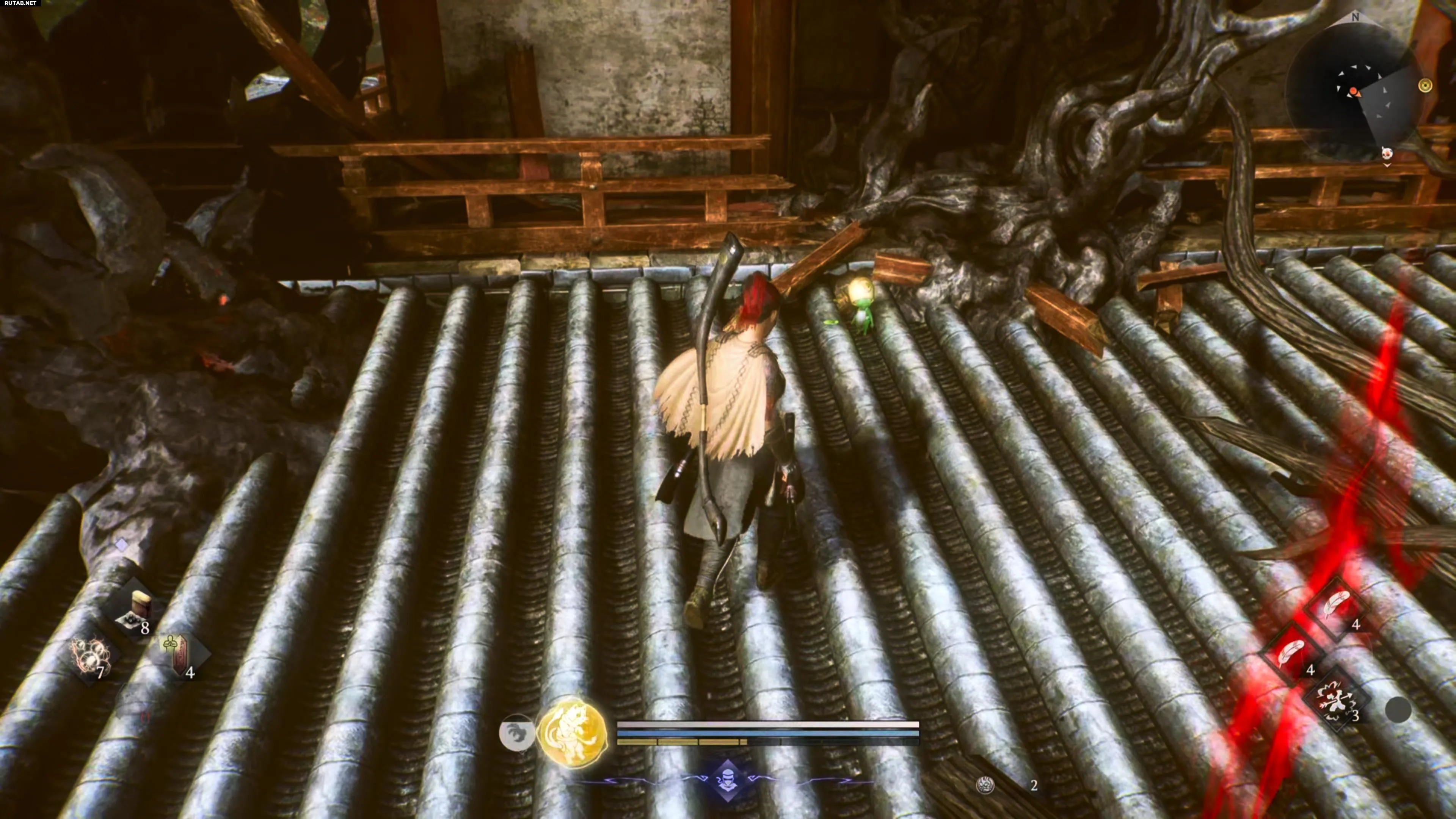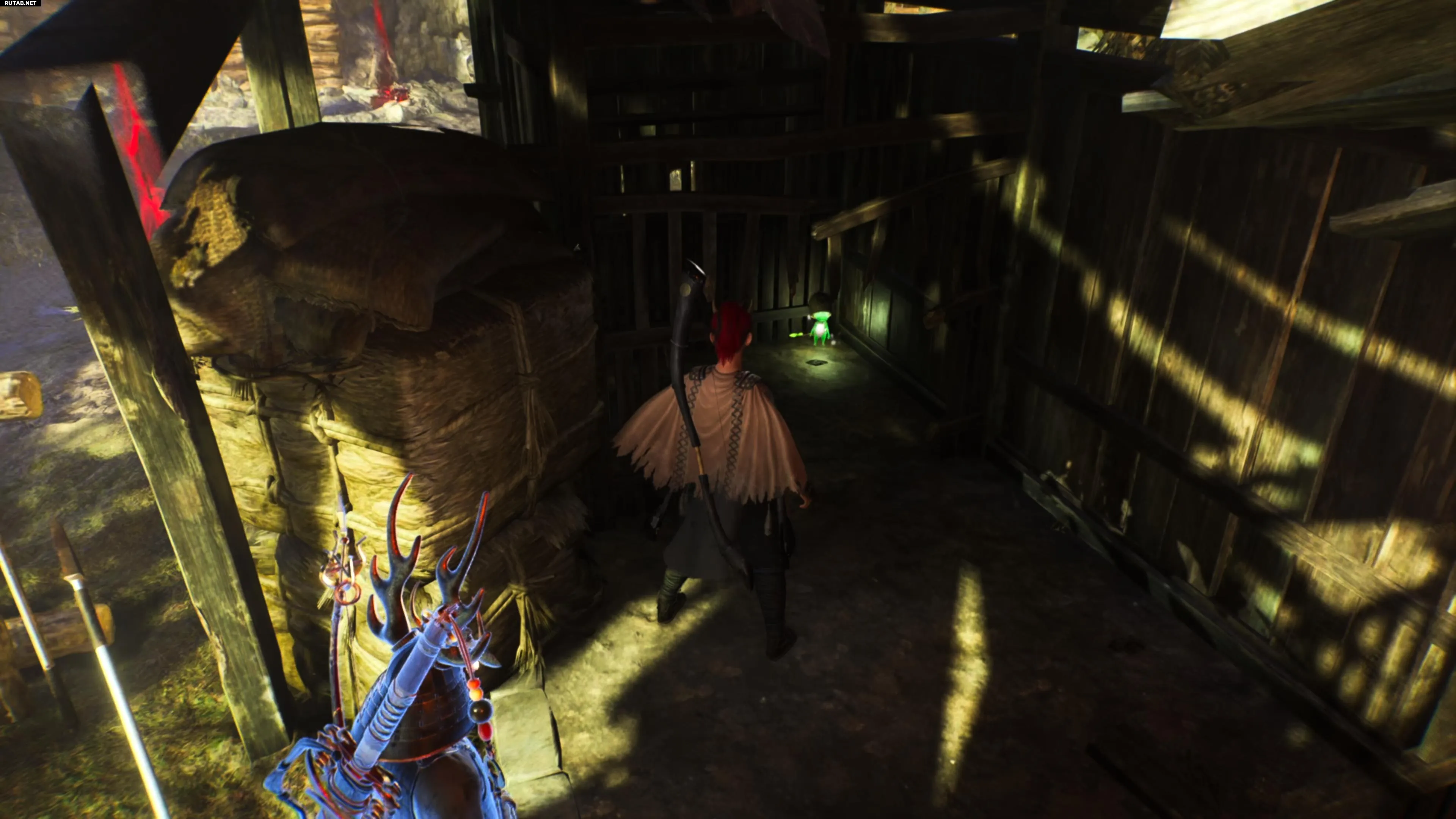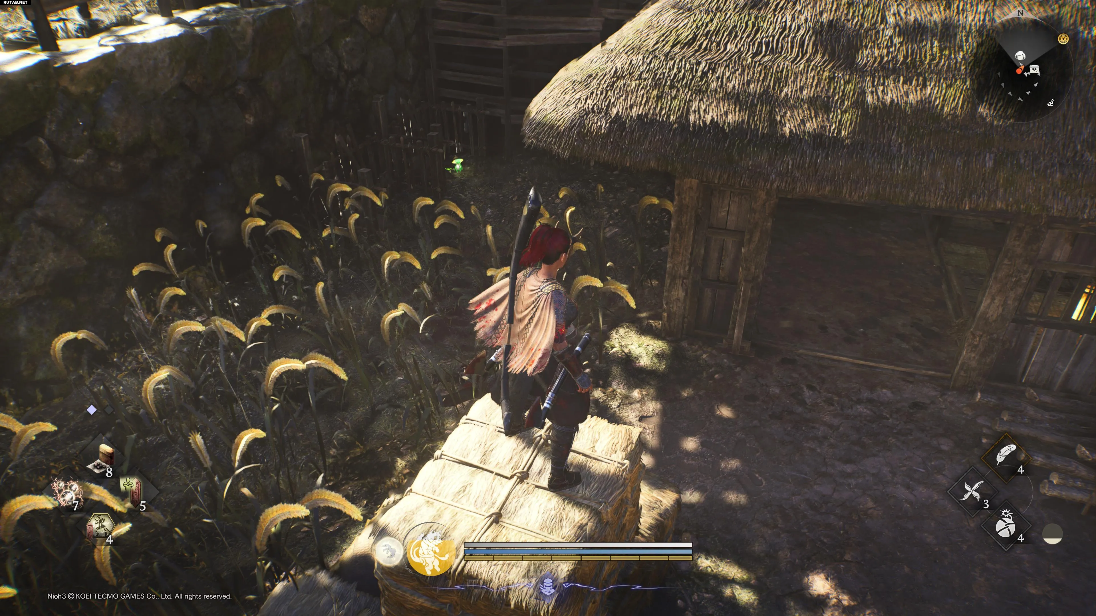 Выпрыгните в окно и поверните налево. За углом, на краю крыши, будет стоять Кодама. Запрыгните на стог сена, а затем используйте двойной прыжок, чтобы до неё добраться.