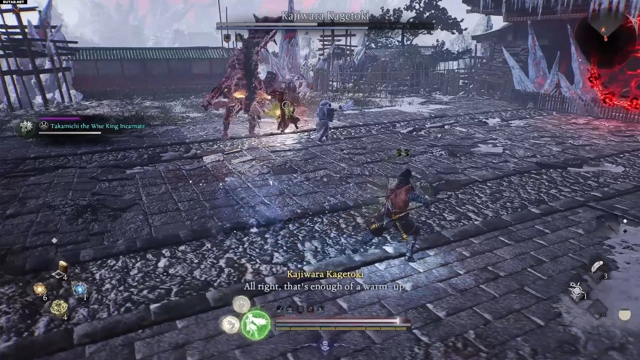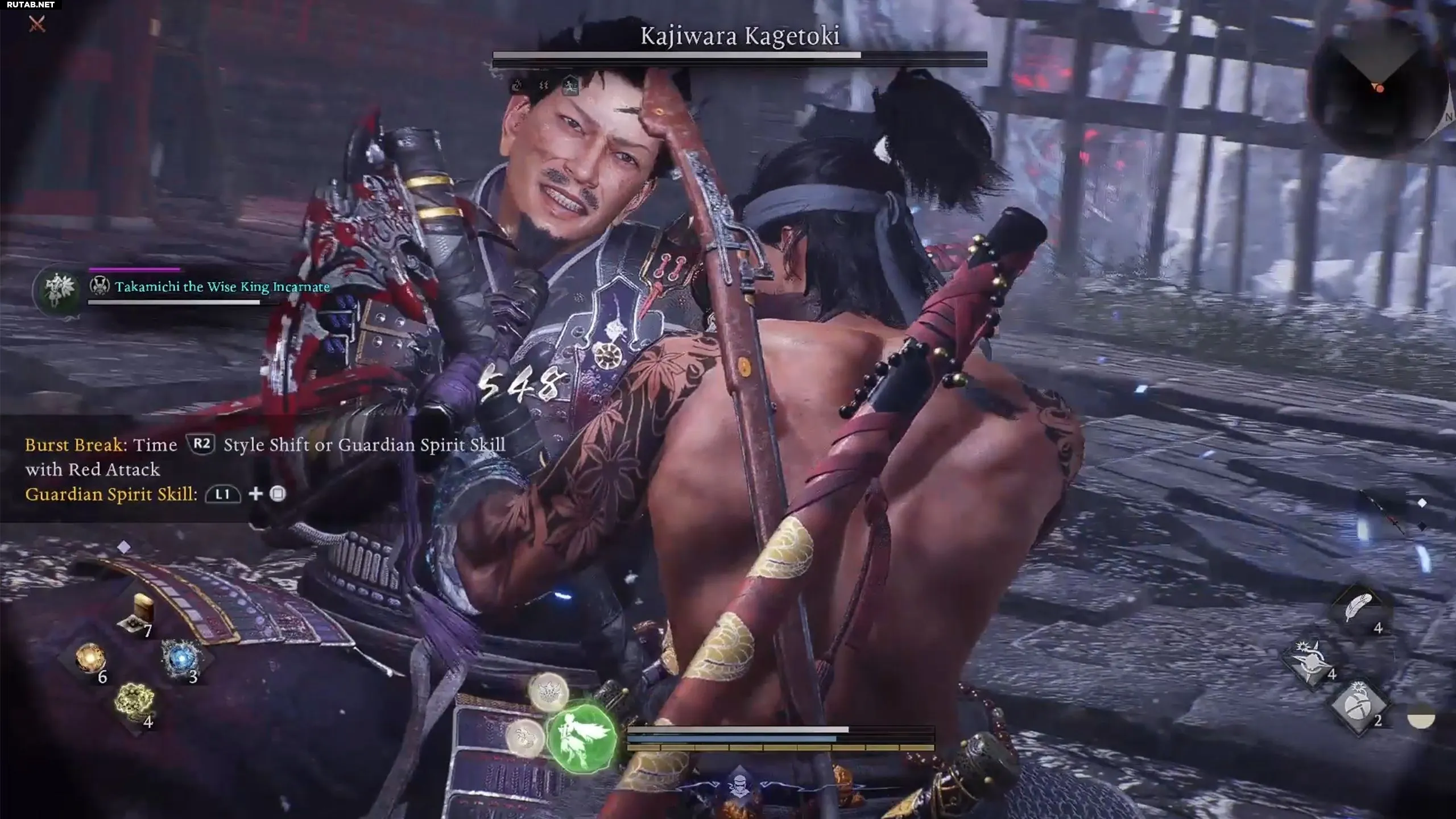 Кайдзивара часто использует красные атаки, которые легко парировать с помощью «Взрыва стойкости». Это быстро истощает его ки, делая босса уязвимым на несколько секунд и позволяя нанести значительный урон. Бой станет проще, если призвать союзника, используя чашу Отико.