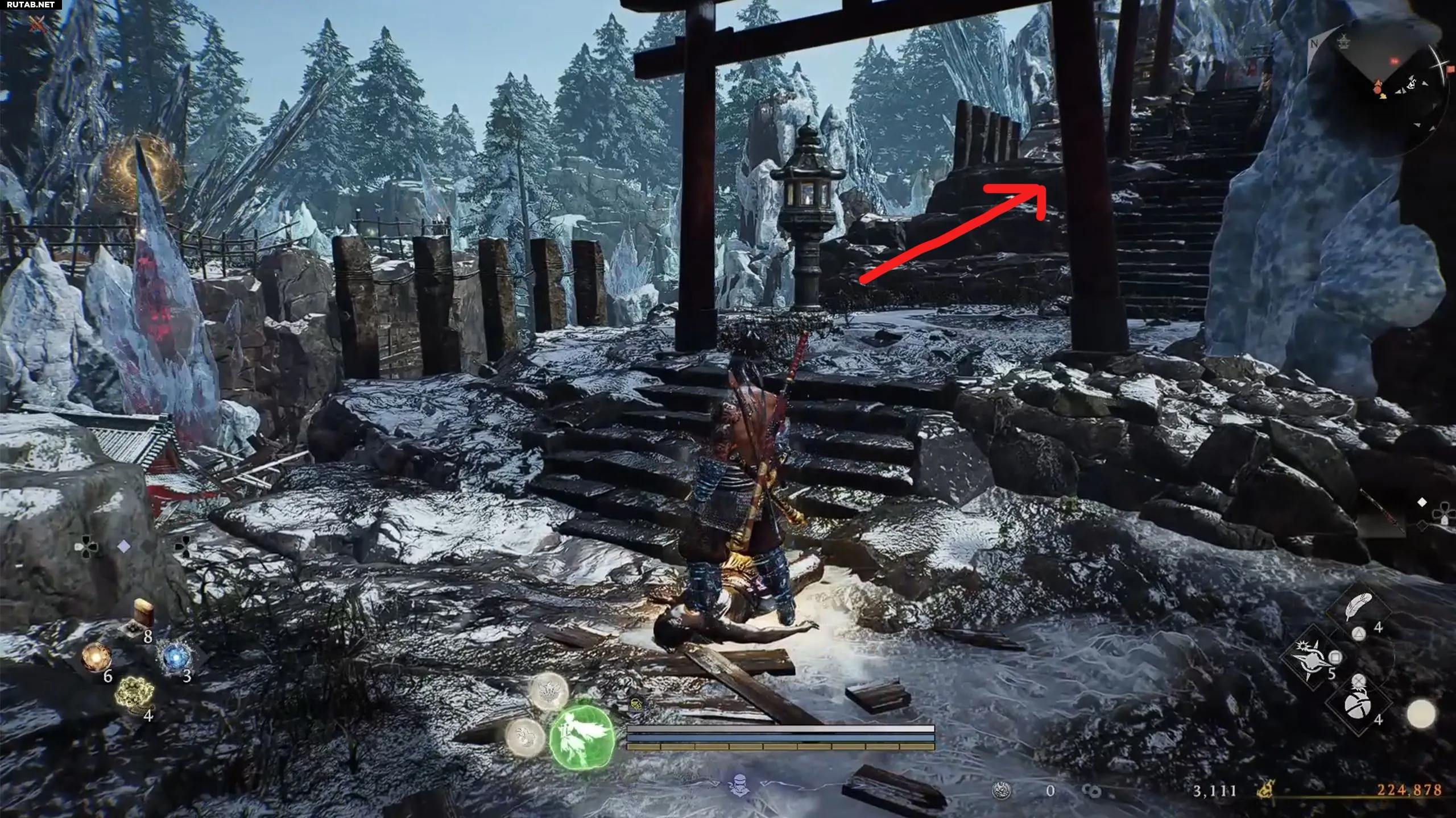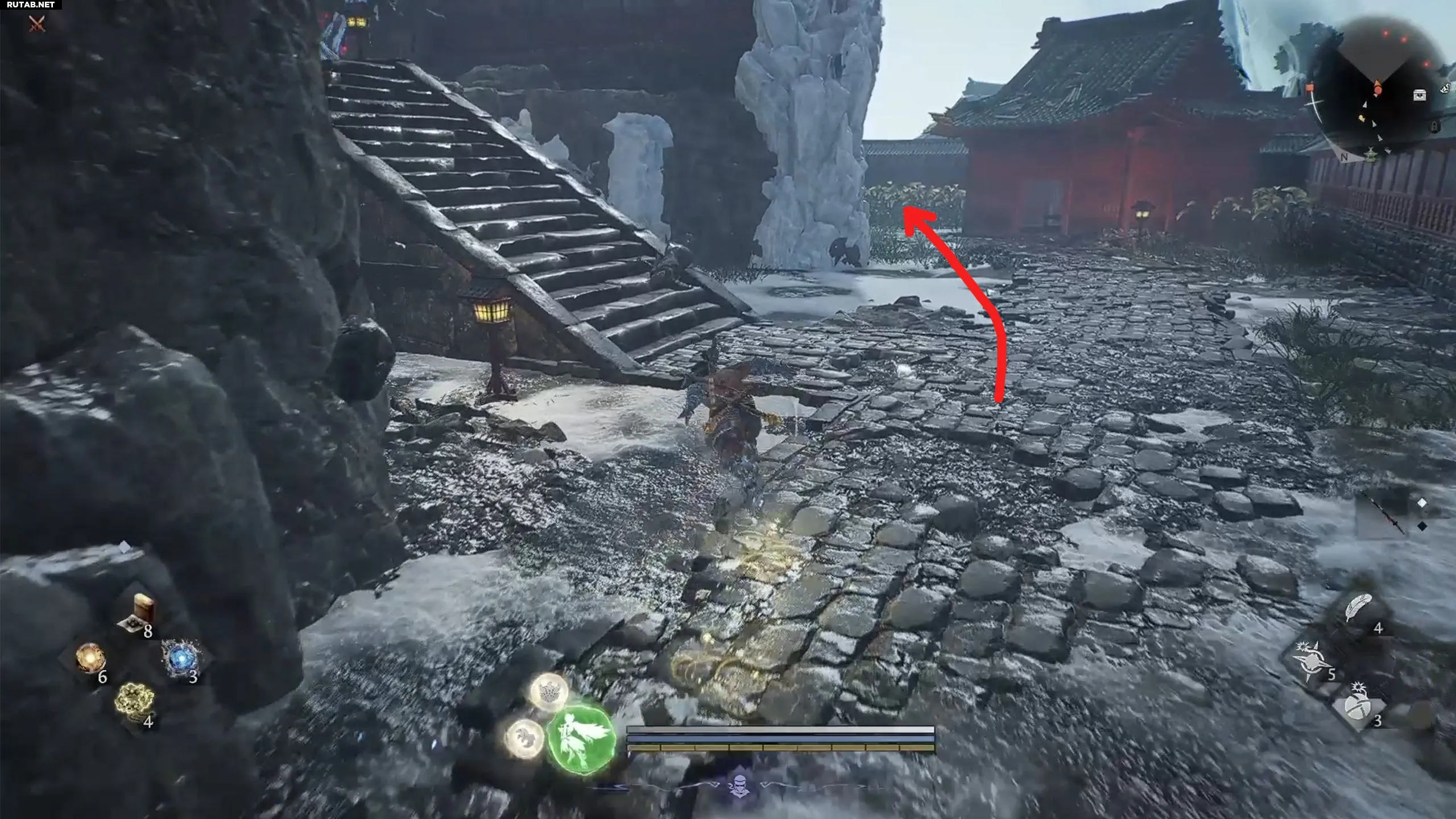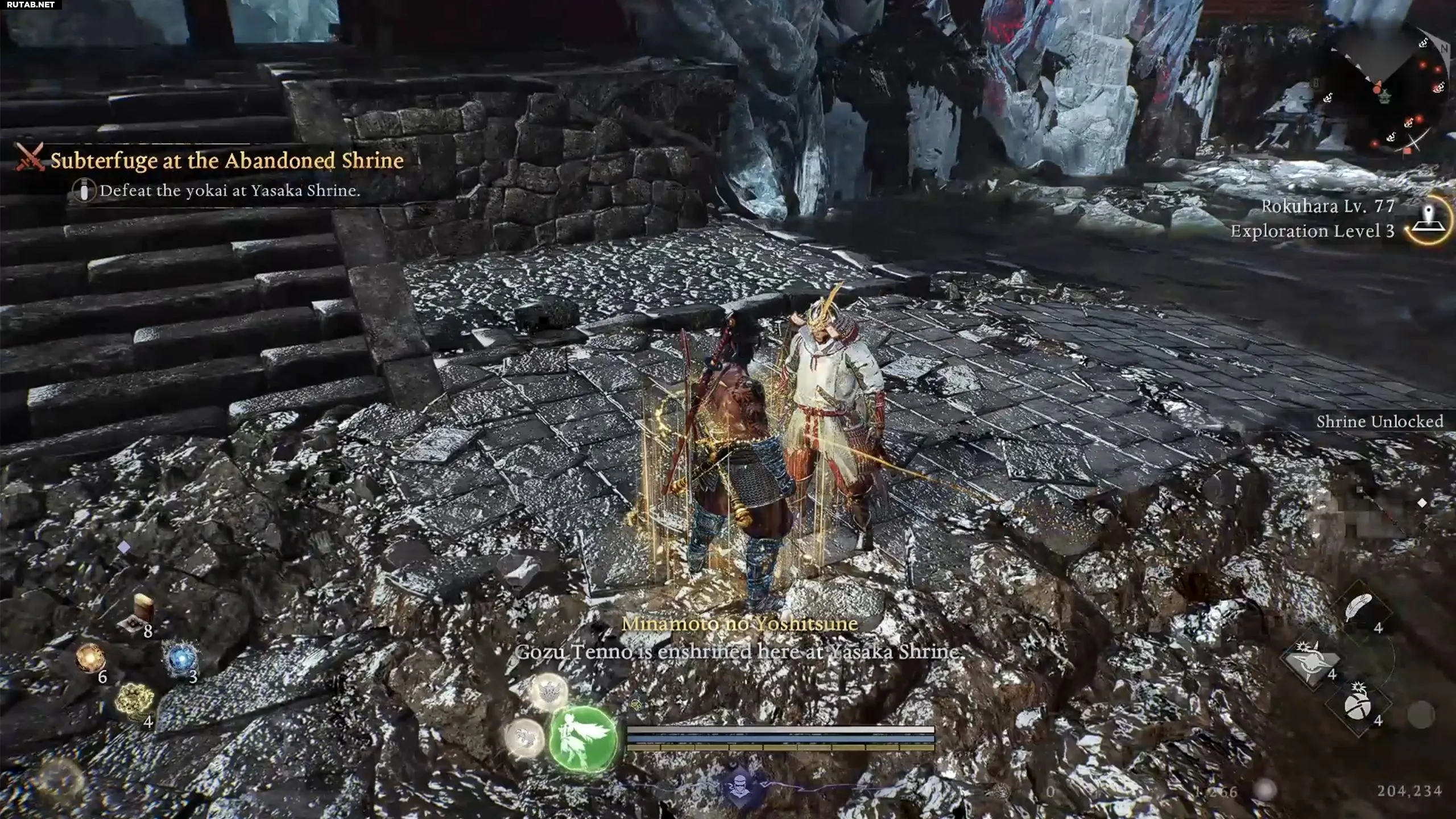 По прибытии в святилище путь к барьеру неочевиден. Сначала поговорите с Ёсицунэ, чтобы он присоединился к вам. Затем поднимитесь по лестнице, расправляясь с врагами. Пройдите под аркой, продолжайте подниматься и в итоге вы окажетесь на крышах небольших строений.