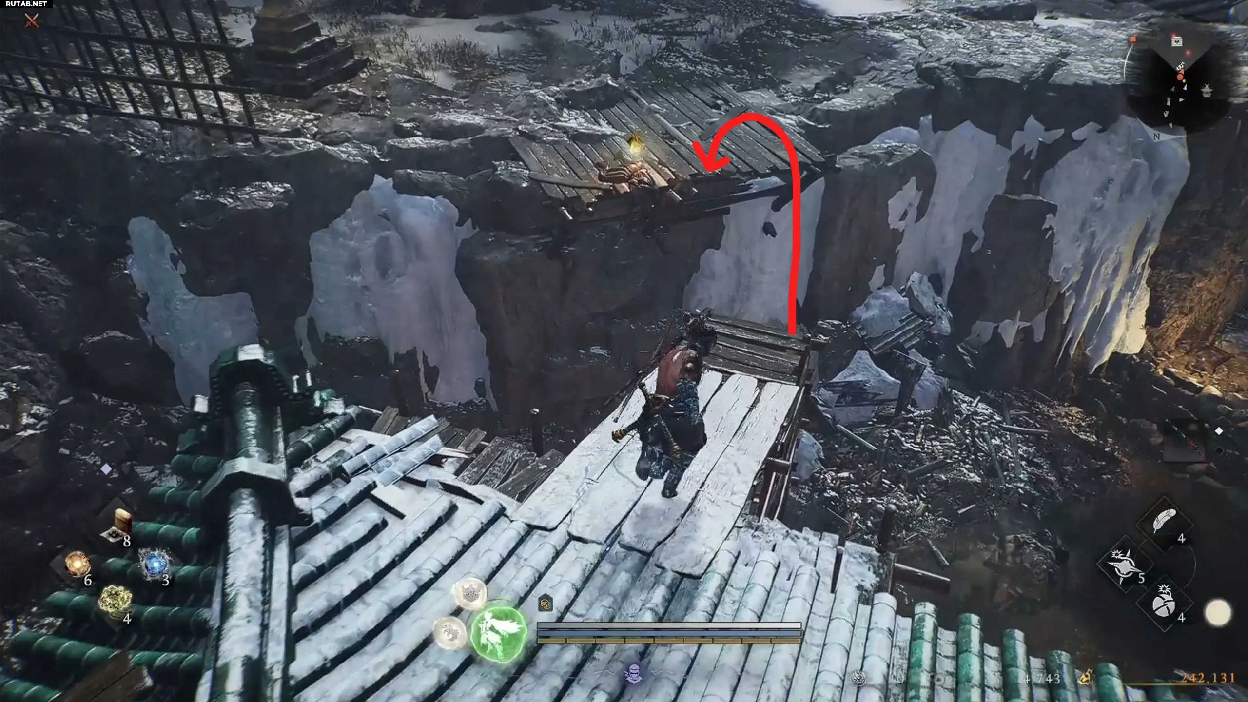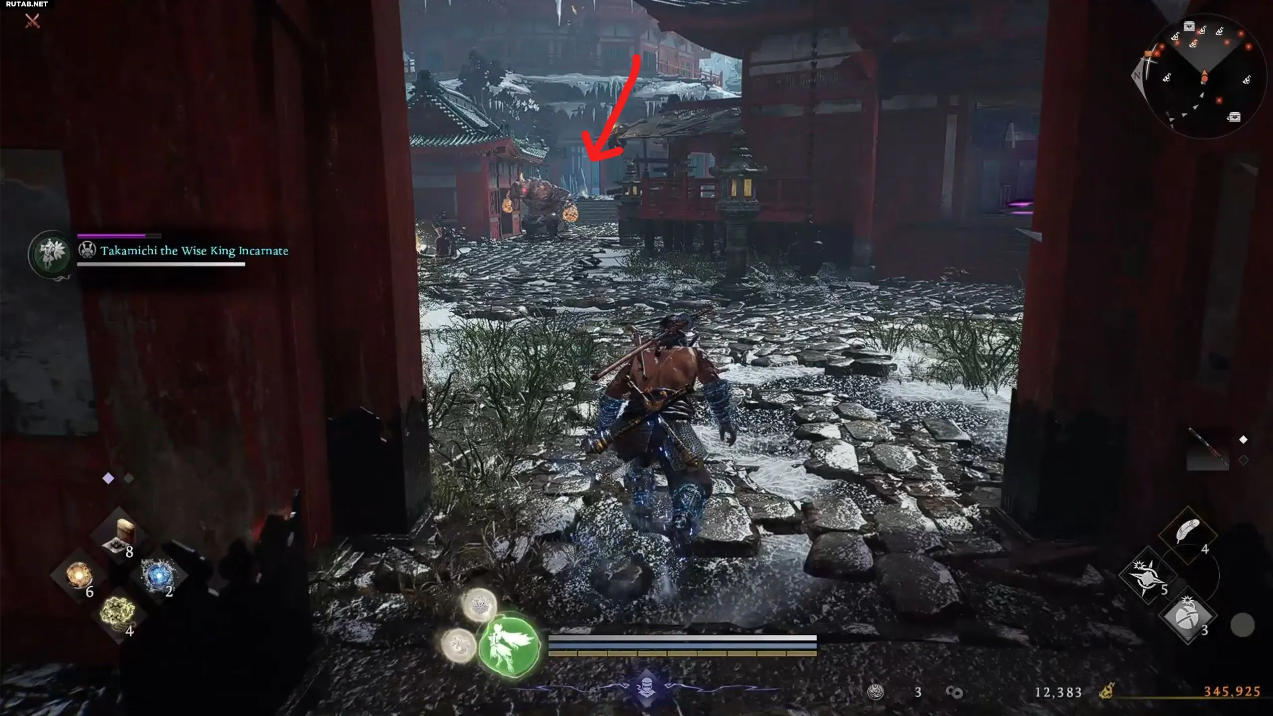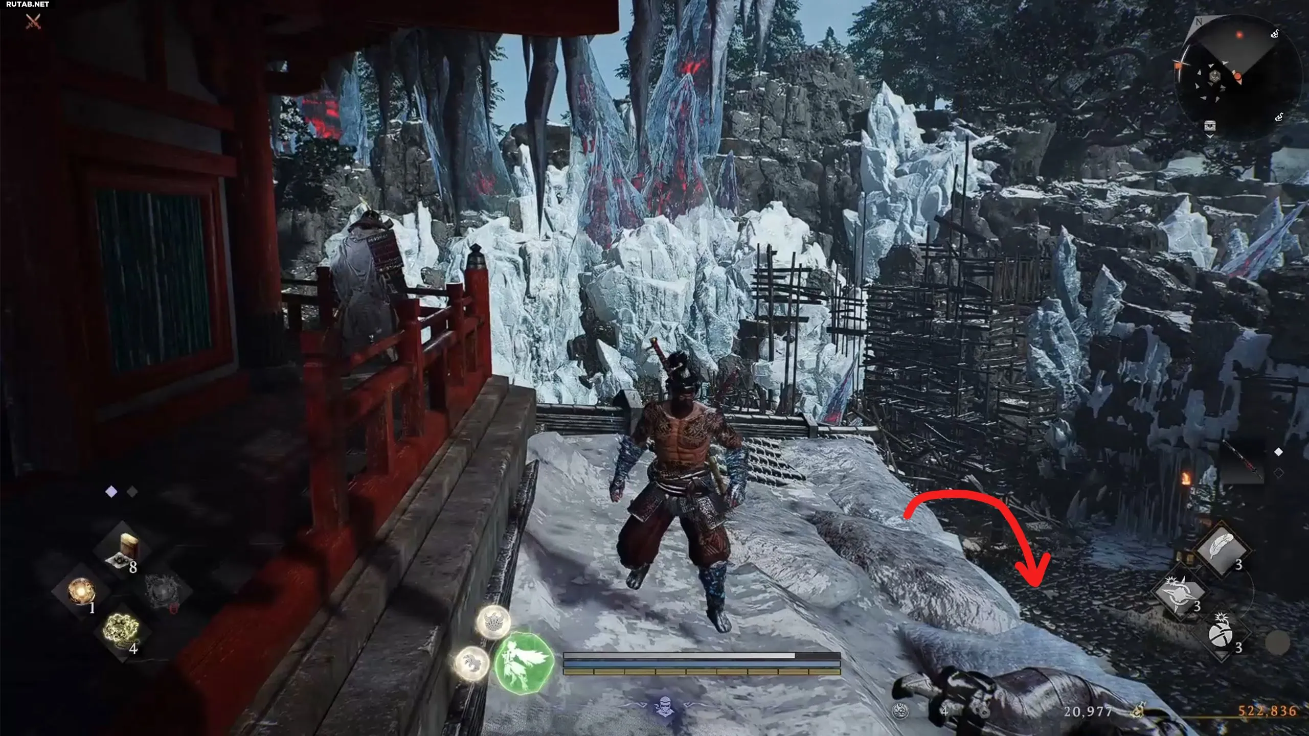 По прибытии в святилище путь к барьеру неочевиден. Сначала поговорите с Ёсицунэ, чтобы он присоединился к вам. Затем поднимитесь по лестнице, расправляясь с врагами. Пройдите под аркой, продолжайте подниматься и в итоге вы окажетесь на крышах небольших строений.