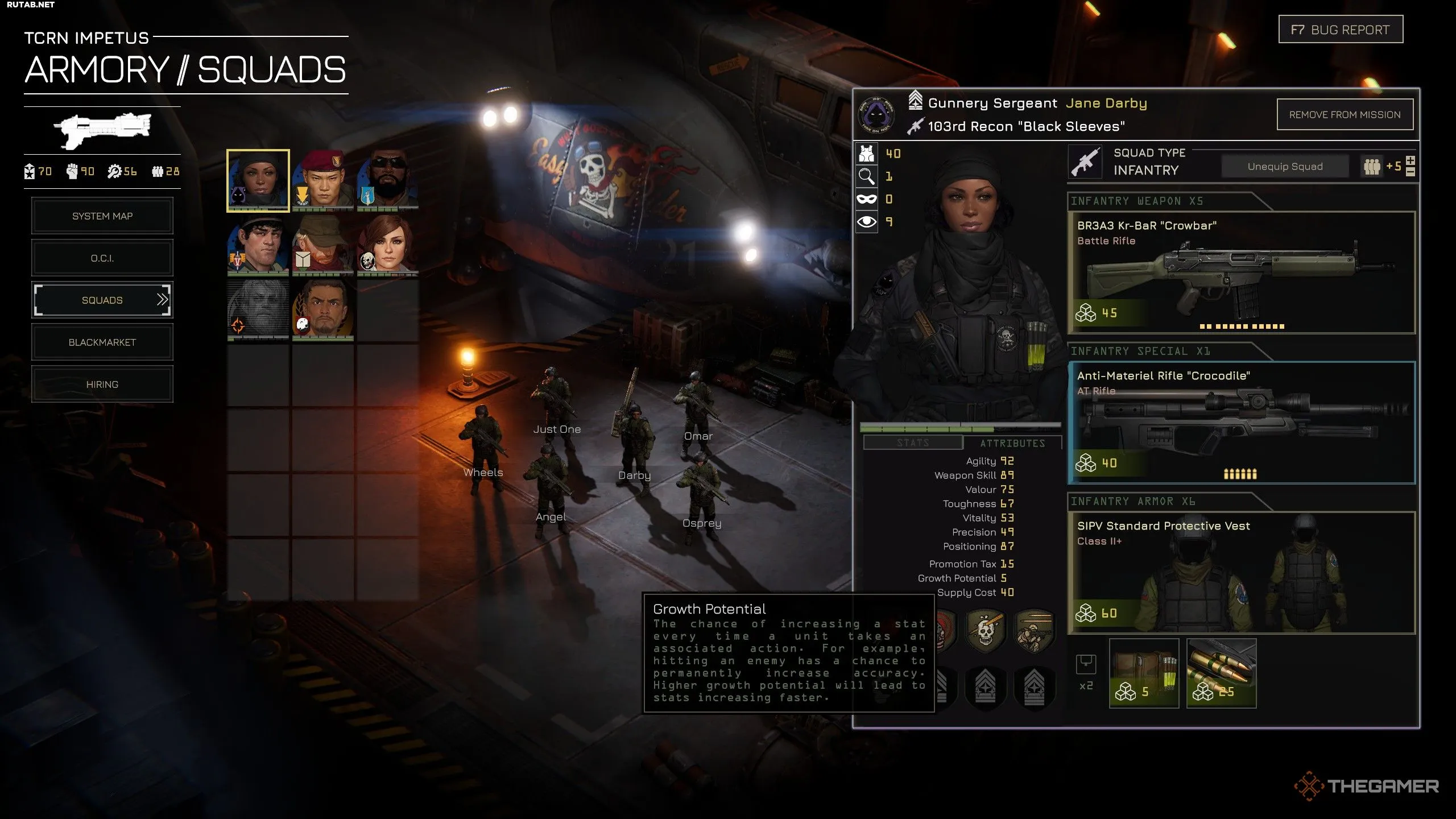 Потенциал роста — интересная характеристика, потому что на неё почти невозможно повлиять напрямую. Она устанавливается для каждого командира отряда по умолчанию, хотя её можно изменить с помощью определённых перков. Некоторые командиры изначально обладают уникальными перками, которые также повышают их потенциал роста.Но что же он на самом деле делает? Когда вы выполняете действия с командиром отряда, есть шанс, что его атрибуты повысятся, что, в свою очередь, увеличит и его характеристики. Каждое ваше действие имеет вероятность повлиять на соответствующий атрибут. Например, постоянное попадание по врагам может повысить ваше владение оружием, что увеличит общую меткость.