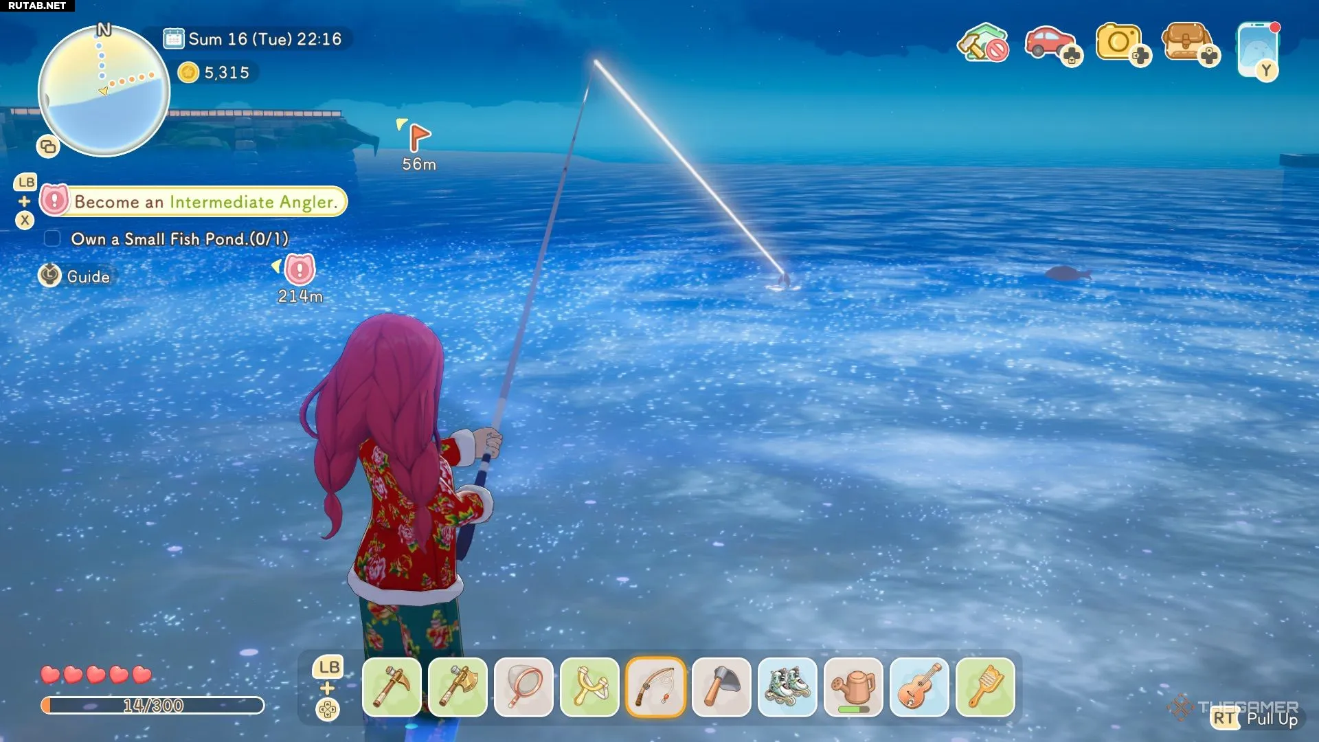 Чтобы забросить удочку, зажмите иконку рыбалки, удерживая удочку в руках, чтобы прицелиться. Отпустите, чтобы закинуть крючок в воду, и ждите, пока рыба клюнет.