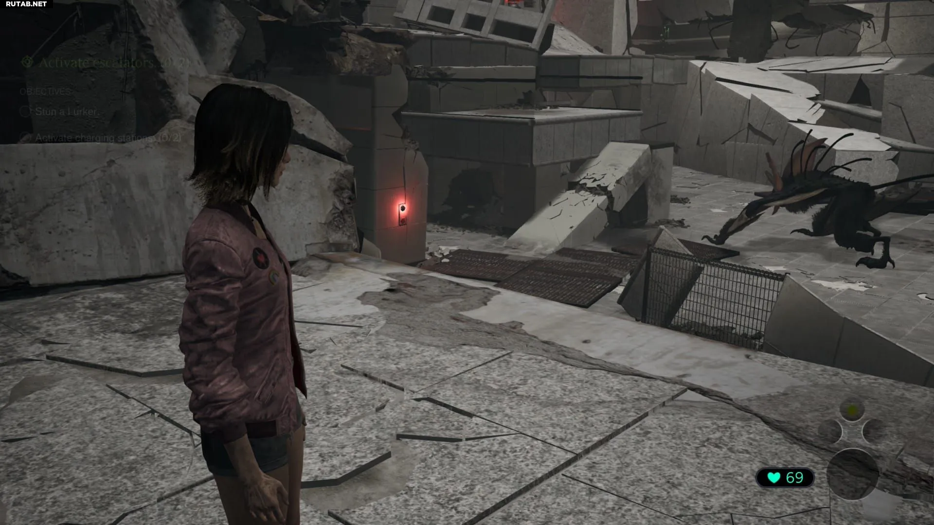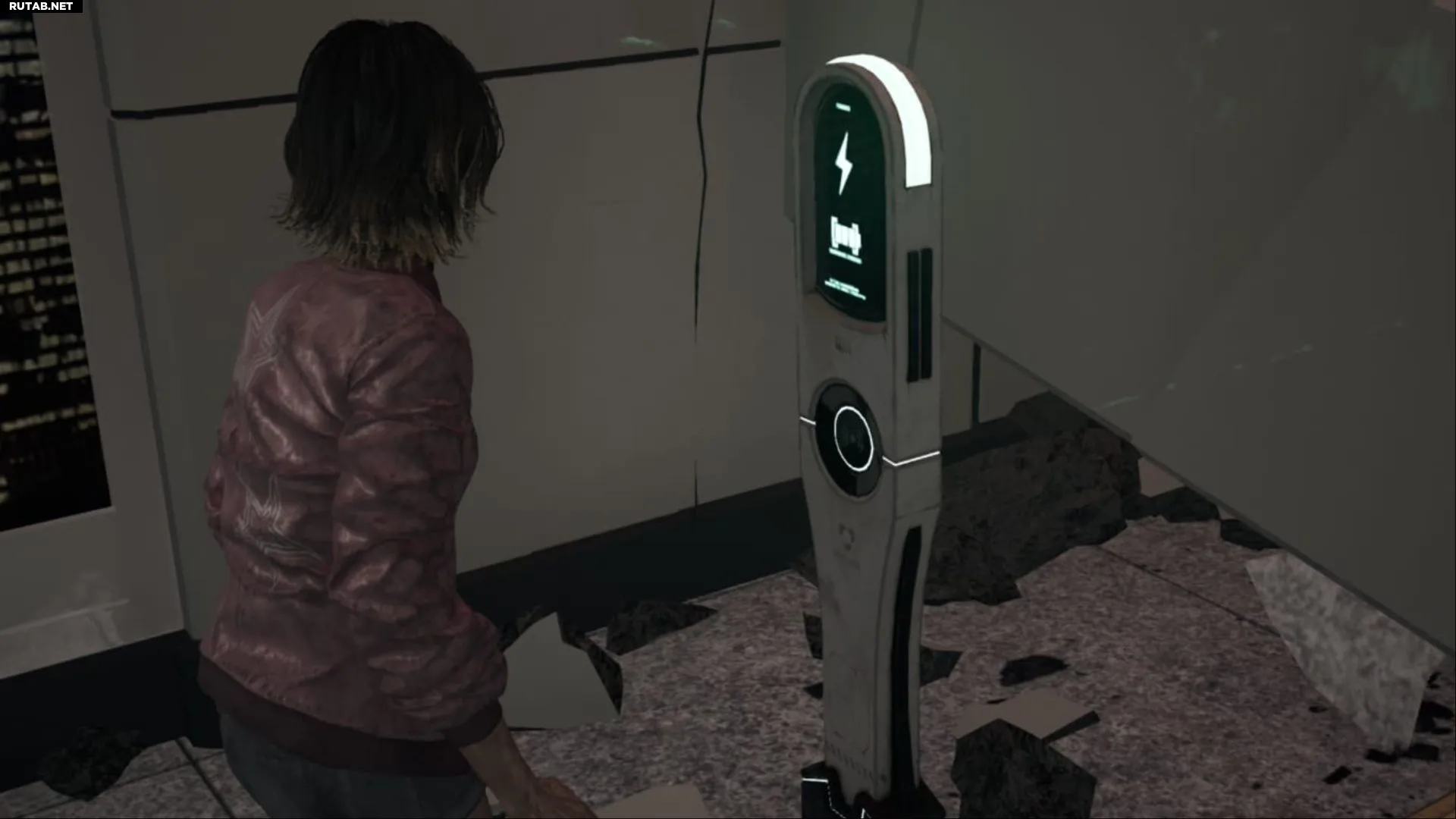 - Левая станция находится в дальнем конце первого этажа, за упавшим обломком. Чтобы добраться до неё, нужно пригнуться и пролезть под завалом, оставаясь незамеченным для Лёркера.