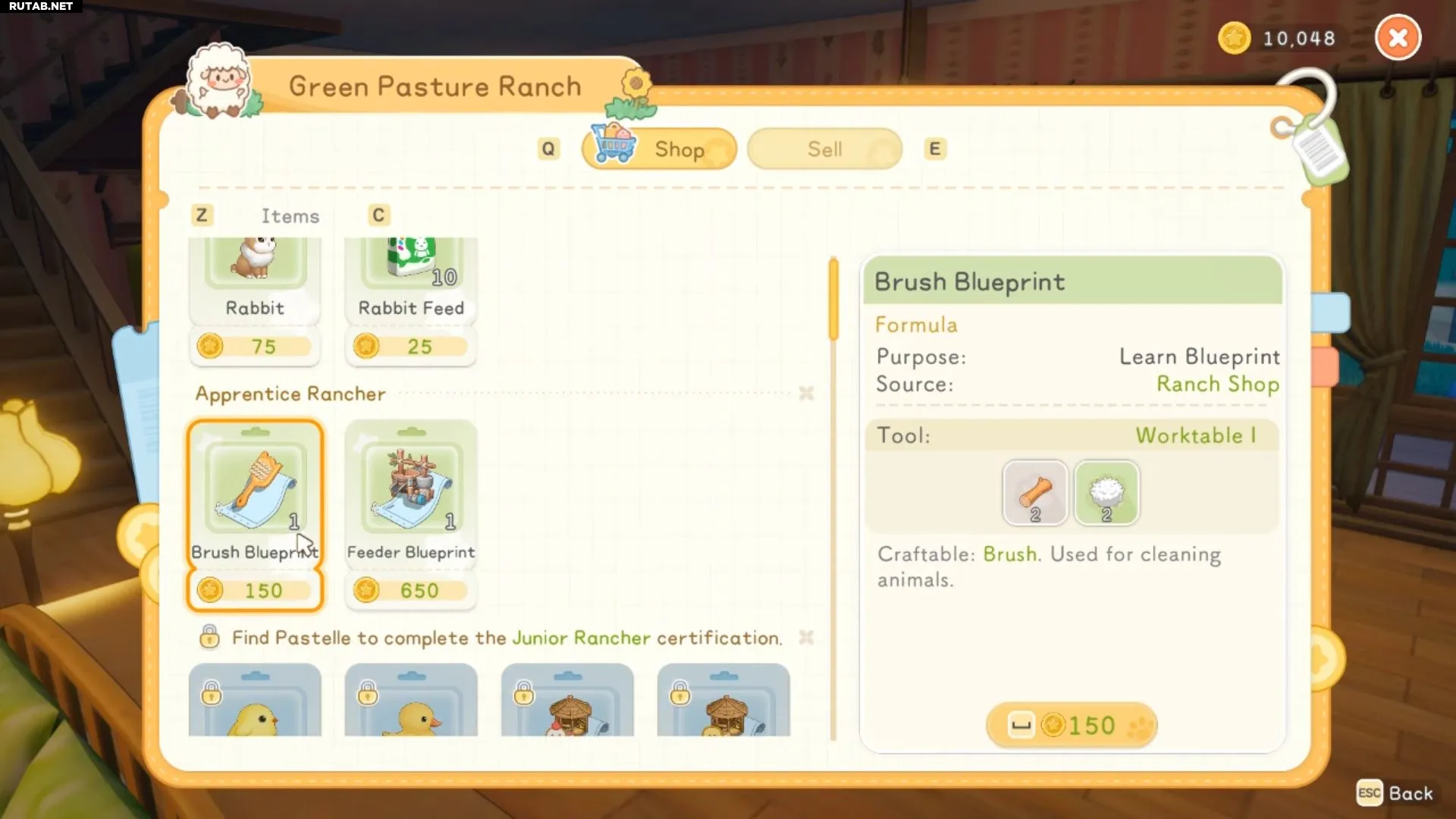 - Купить чертеж «Щетка» за 150 золота на ранчо «Зеленые пастбища».