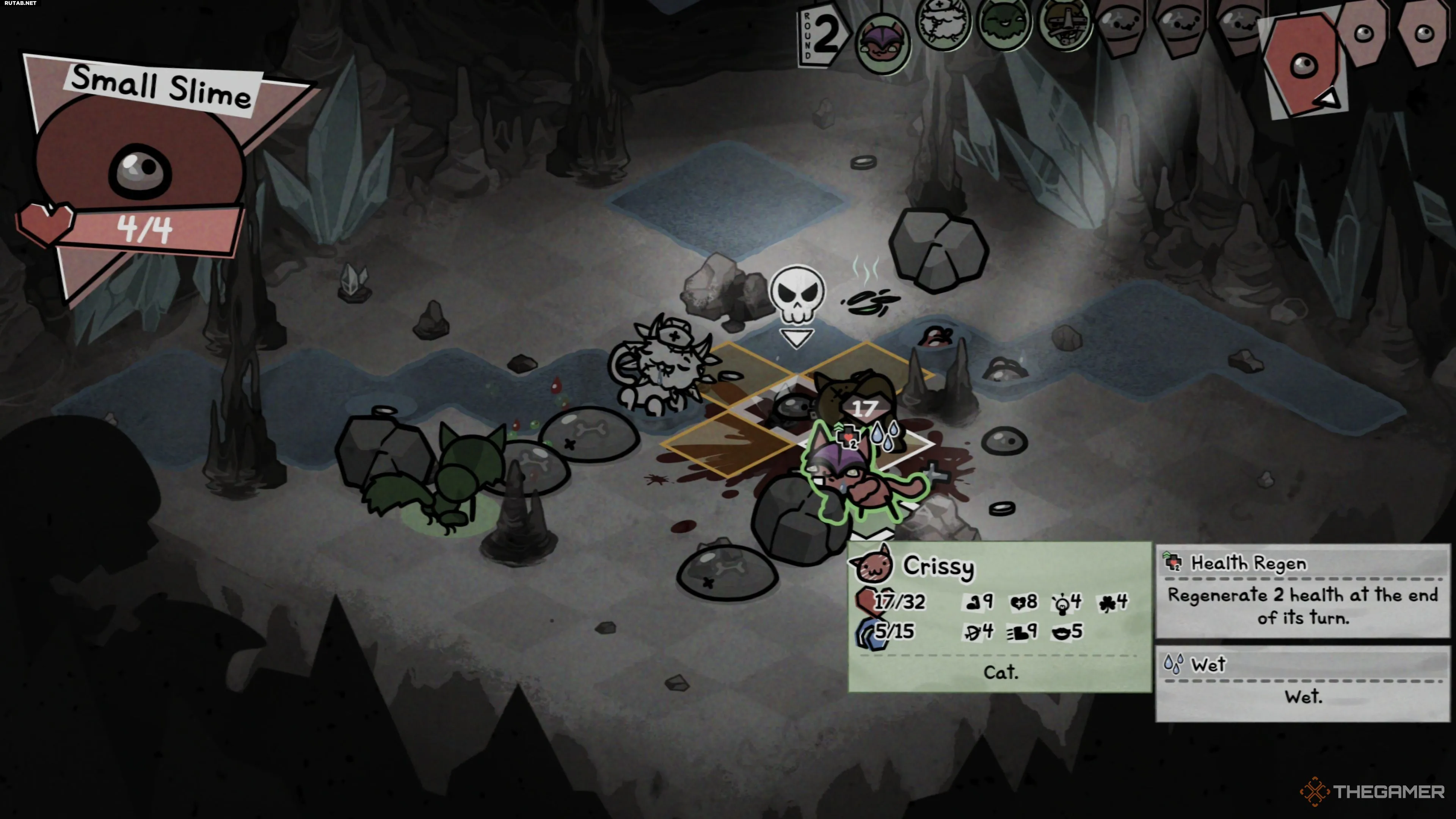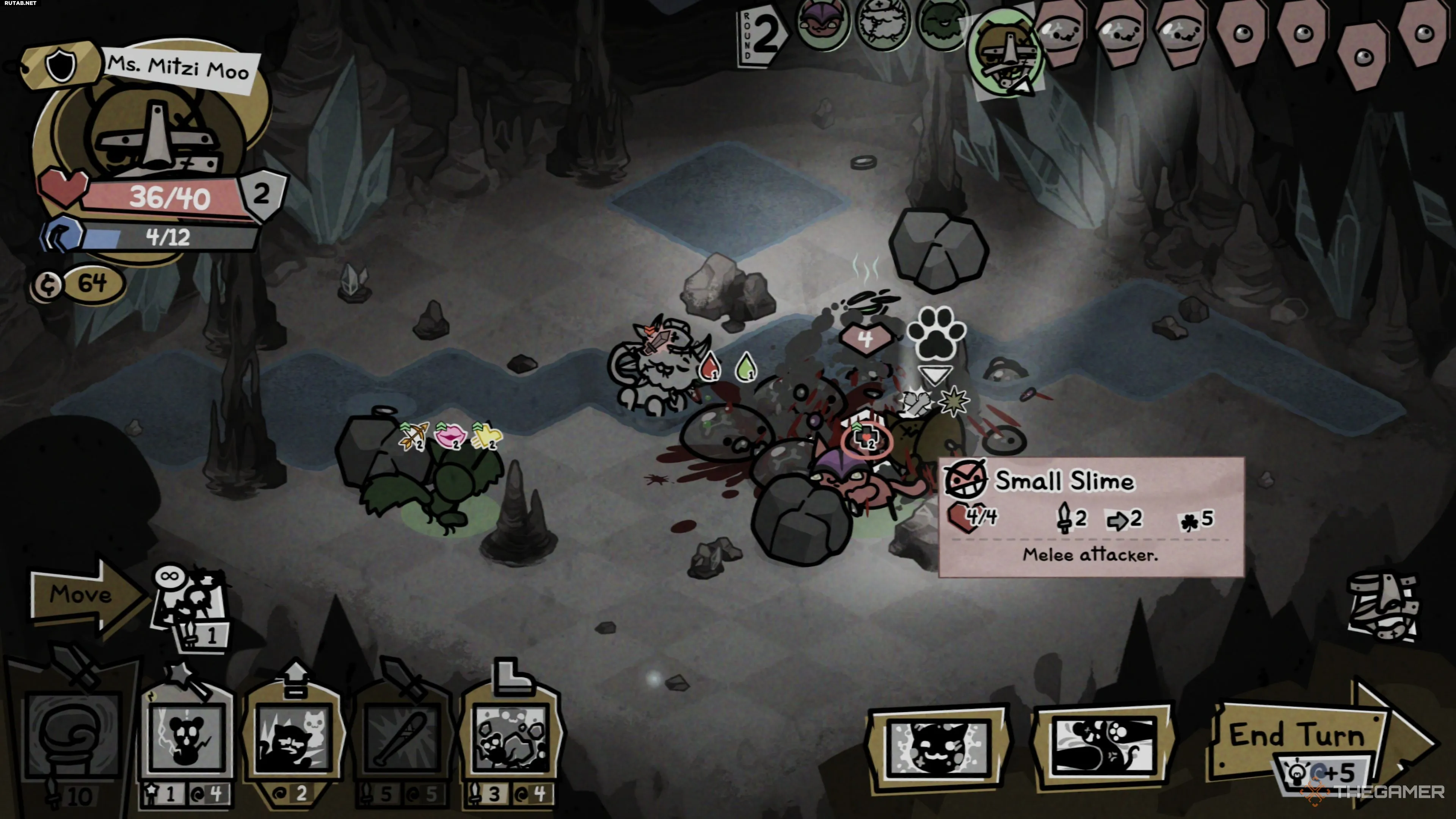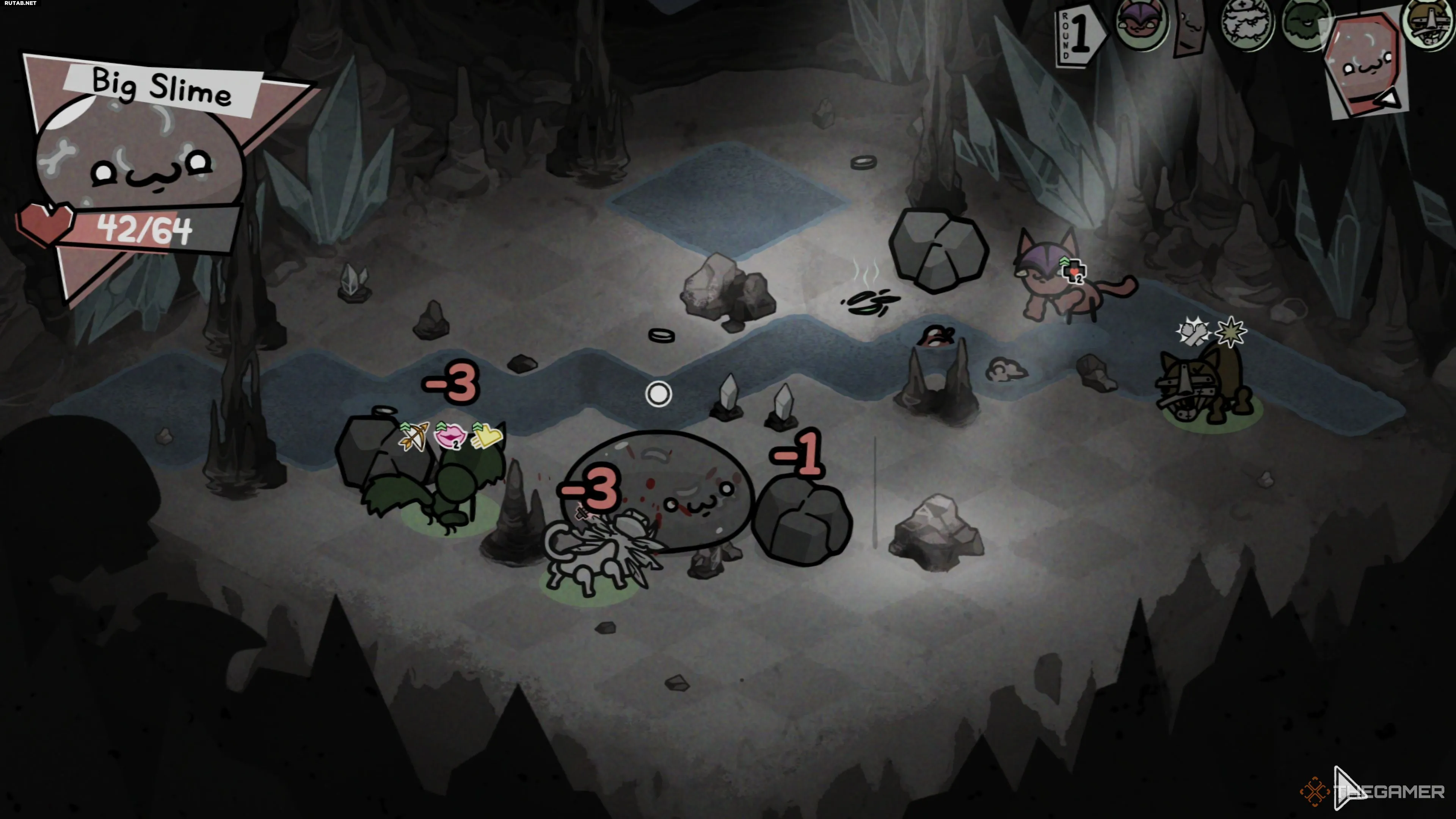 Большая Слизь встречается на полпути через регион Пещеры в первом акте и готова положить конец вашему затянувшемуся забегу в Mewgenics, заставив вас вернуться к чертёжной доске с новыми и, будем надеяться, лучшими котами. У этого мини-босса не так уж много разнообразия в атаках, но он всё же может завалить вас, если вы слишком увлечётесь, что приведёт к падению из-за вашей же жадности.