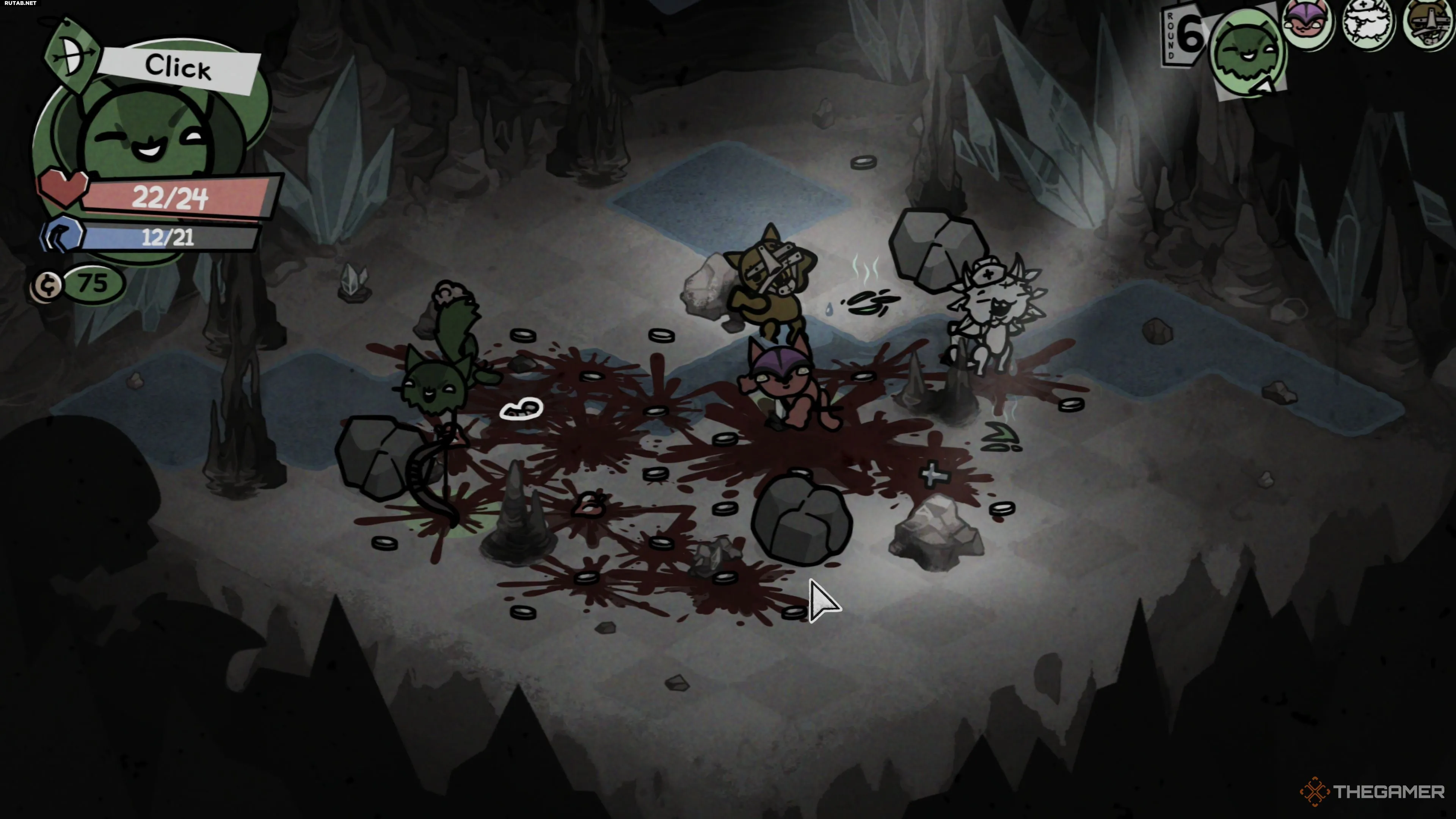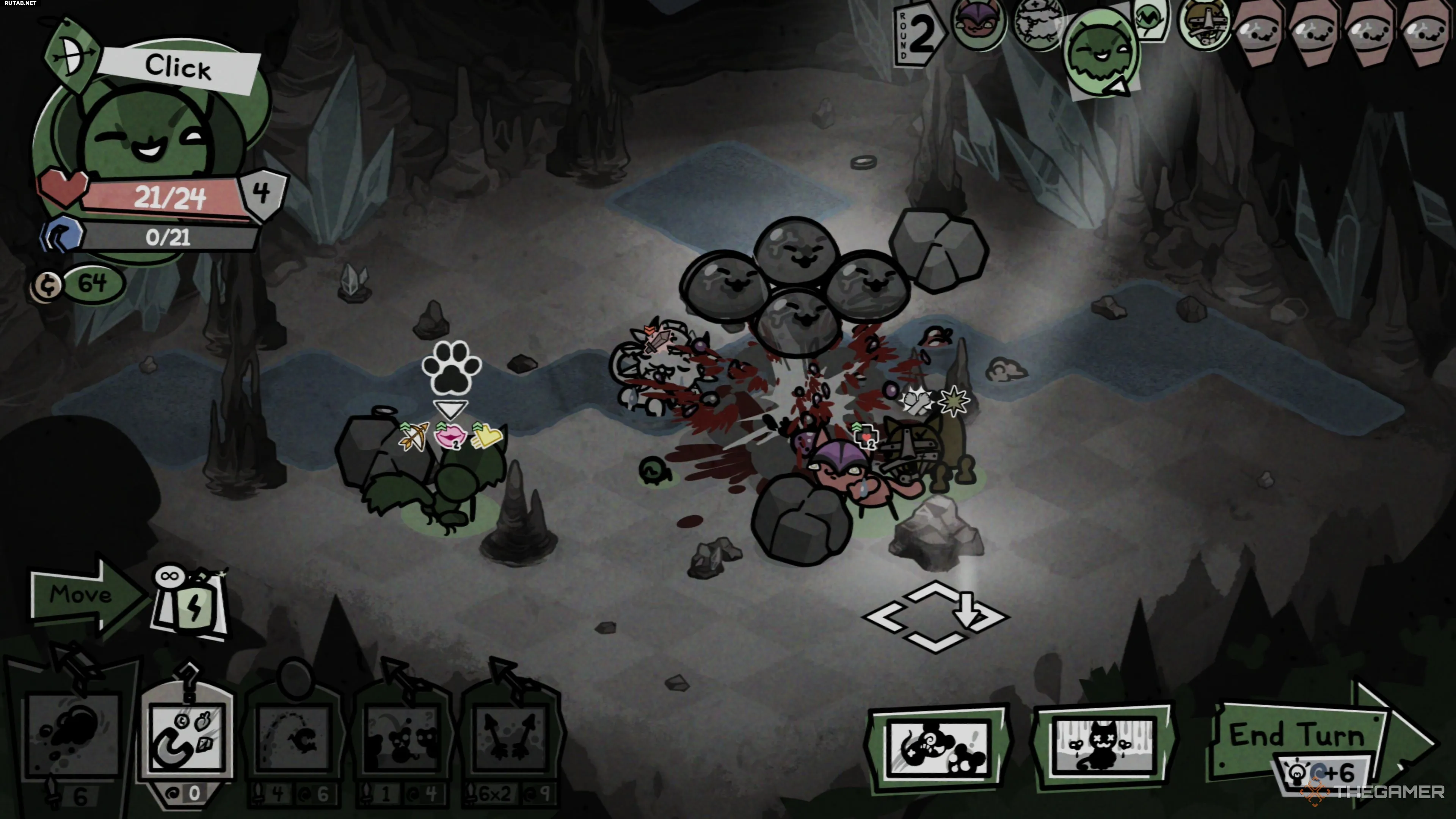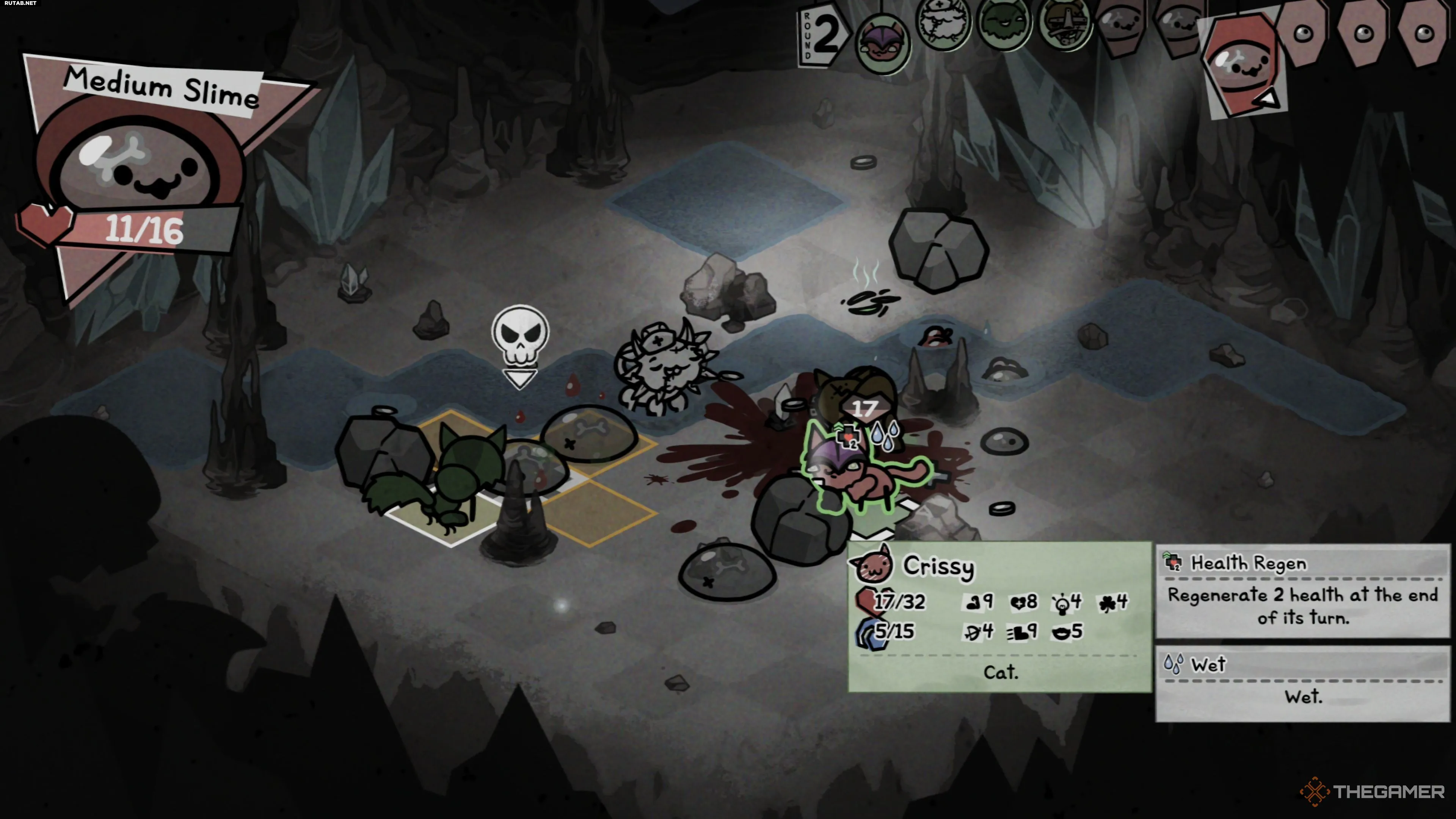 Большая Слизь встречается на полпути через регион Пещеры в первом акте и готова положить конец вашему затянувшемуся забегу в Mewgenics, заставив вас вернуться к чертёжной доске с новыми и, будем надеяться, лучшими котами. У этого мини-босса не так уж много разнообразия в атаках, но он всё же может завалить вас, если вы слишком увлечётесь, что приведёт к падению из-за вашей же жадности.