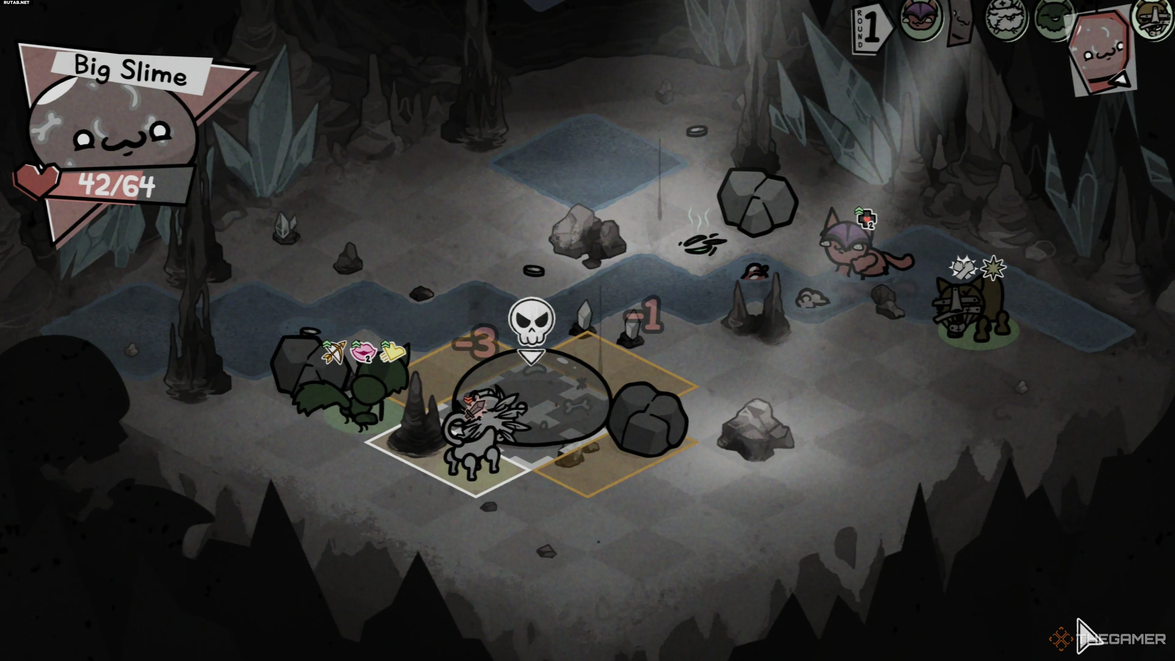 Первое, что нужно знать о Большой Слизи, — это её способ перемещения. Она может наносить урон вашим юнитам, просто наступая на клетку, которую они занимают, отталкивая их и нанося приличный урон. Как ни странно, Большая Слизь не так уж часто перемещается, что позволяет вам запереть её и воспользоваться её относительно низким показателем Скорости.