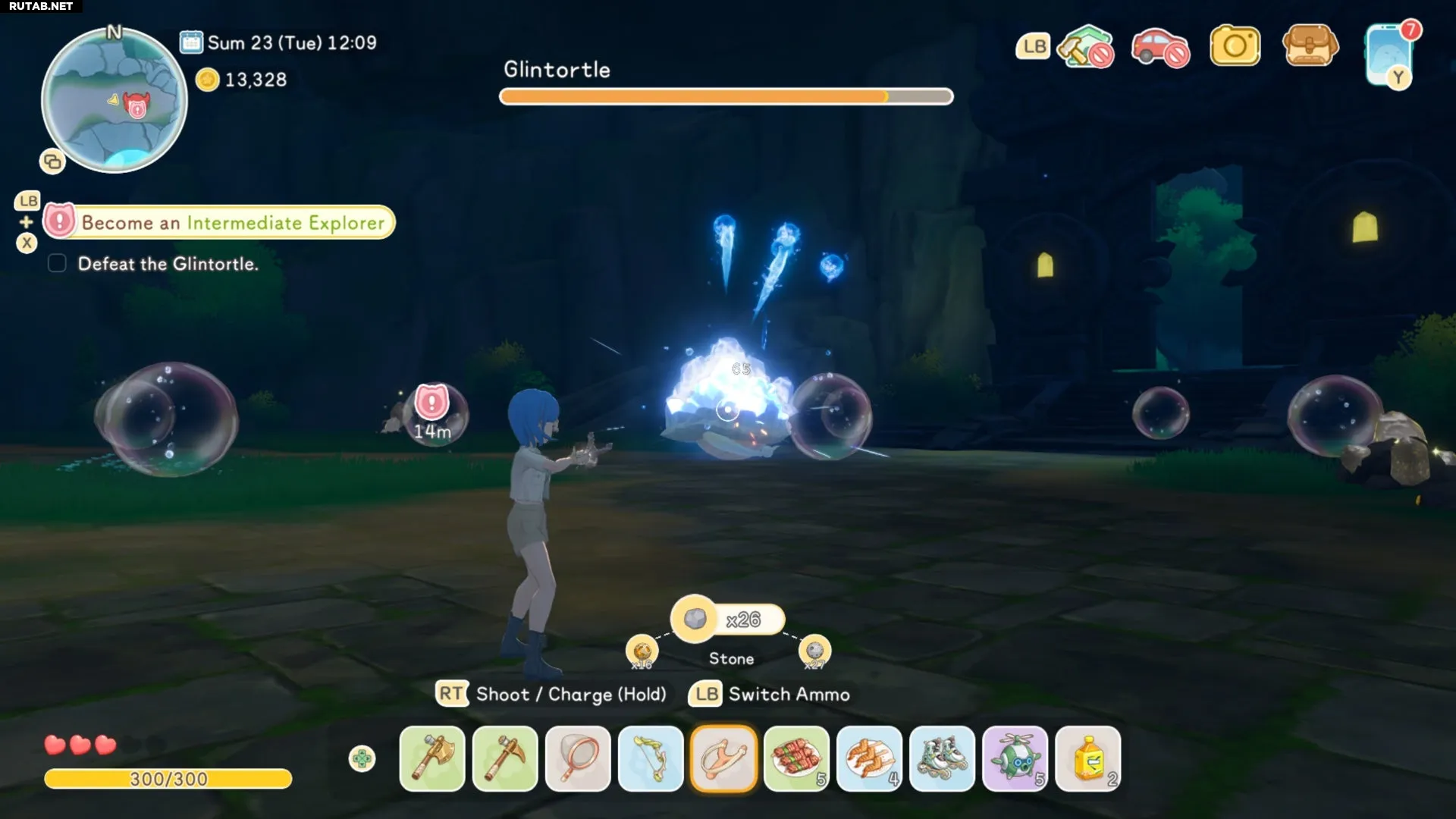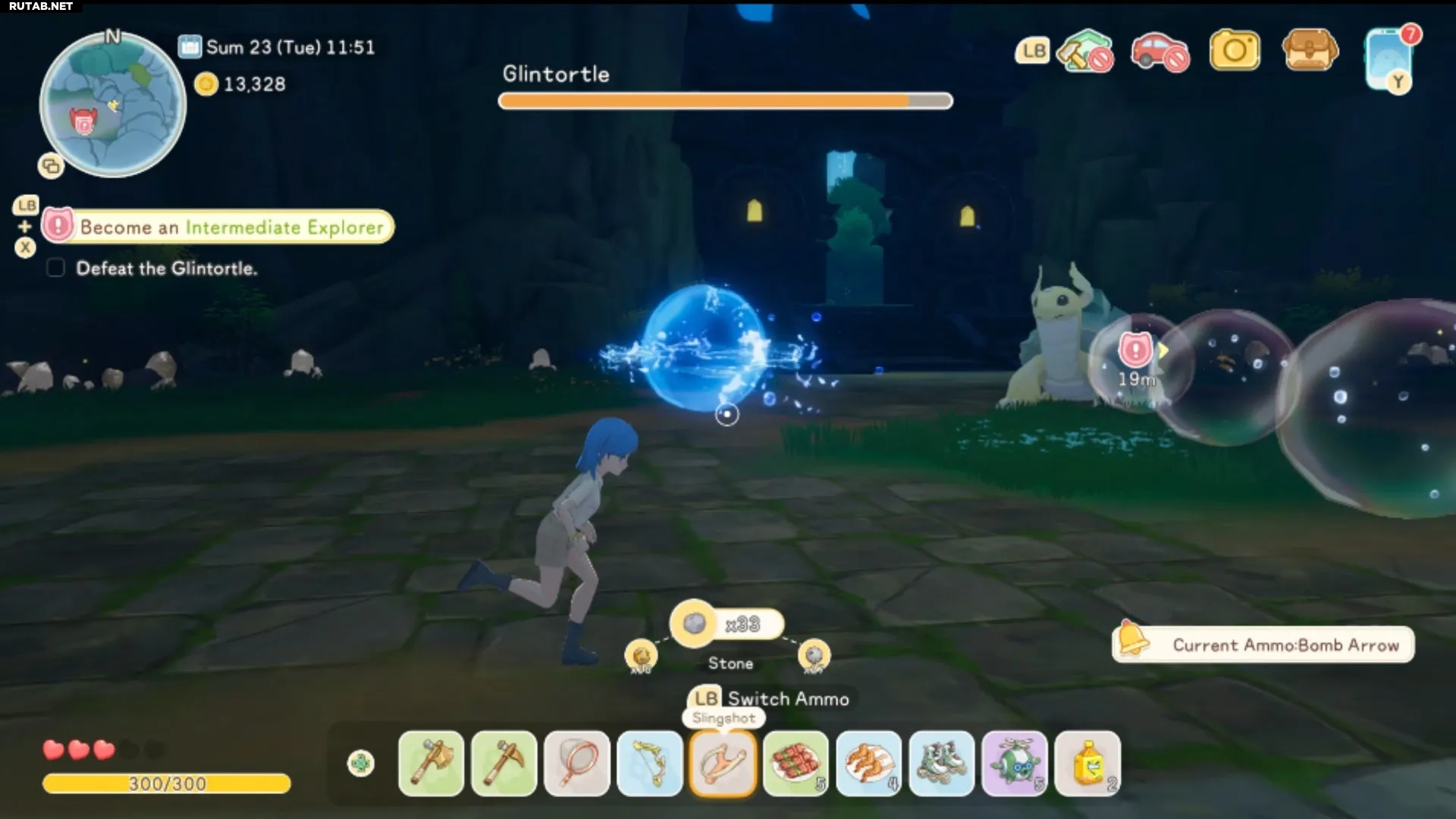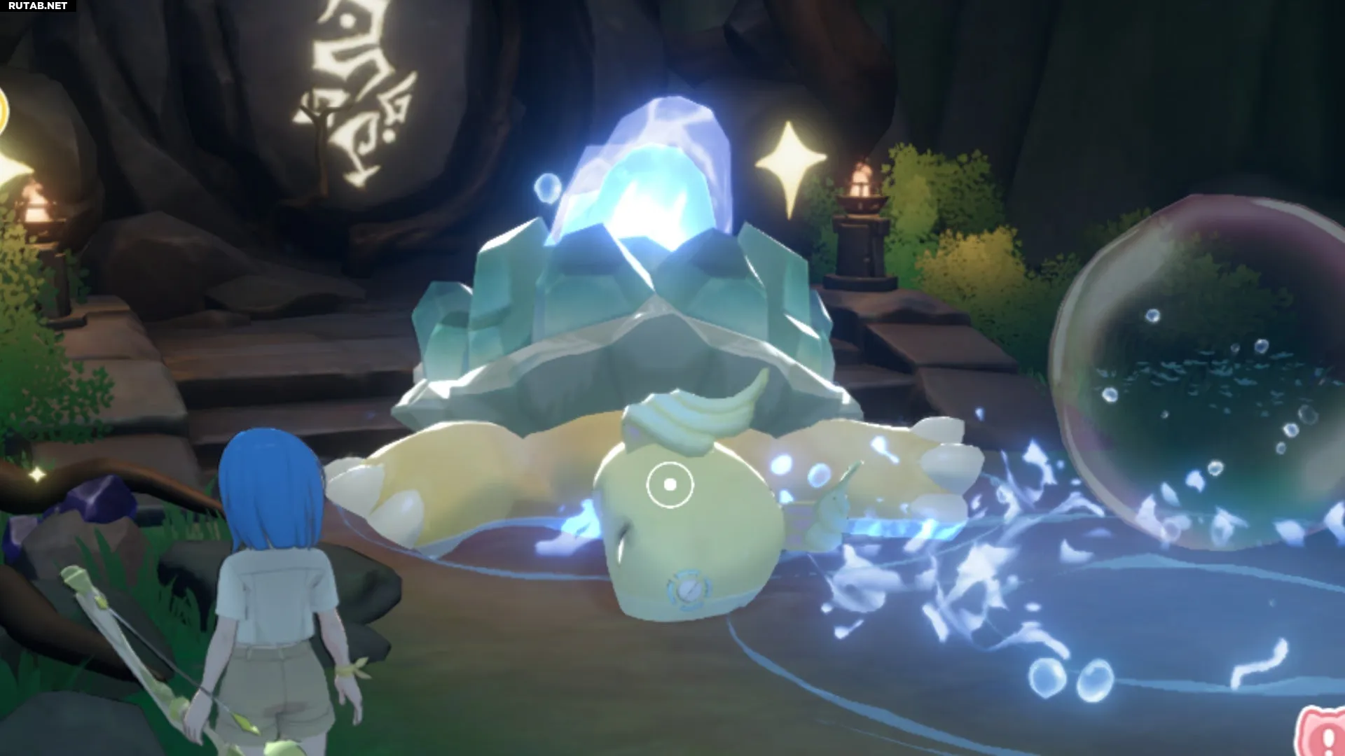 - Спрятаться, вращаться, пузыри! — Глинтортл спрячется в панцирь, начнёт быстро вращаться и двигаться в вашу сторону, оставляя за собой след из пузырей. Когда он вылезет из панциря, засветится один кристалл на вершине его слабого места. На несколько мгновений он будет оглушён. Это короткое окно для атаки, и нам показалось, что в этот момент проще попасть из рогатки.