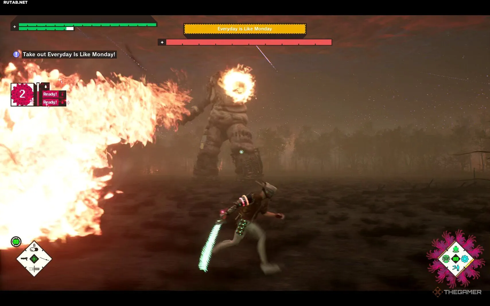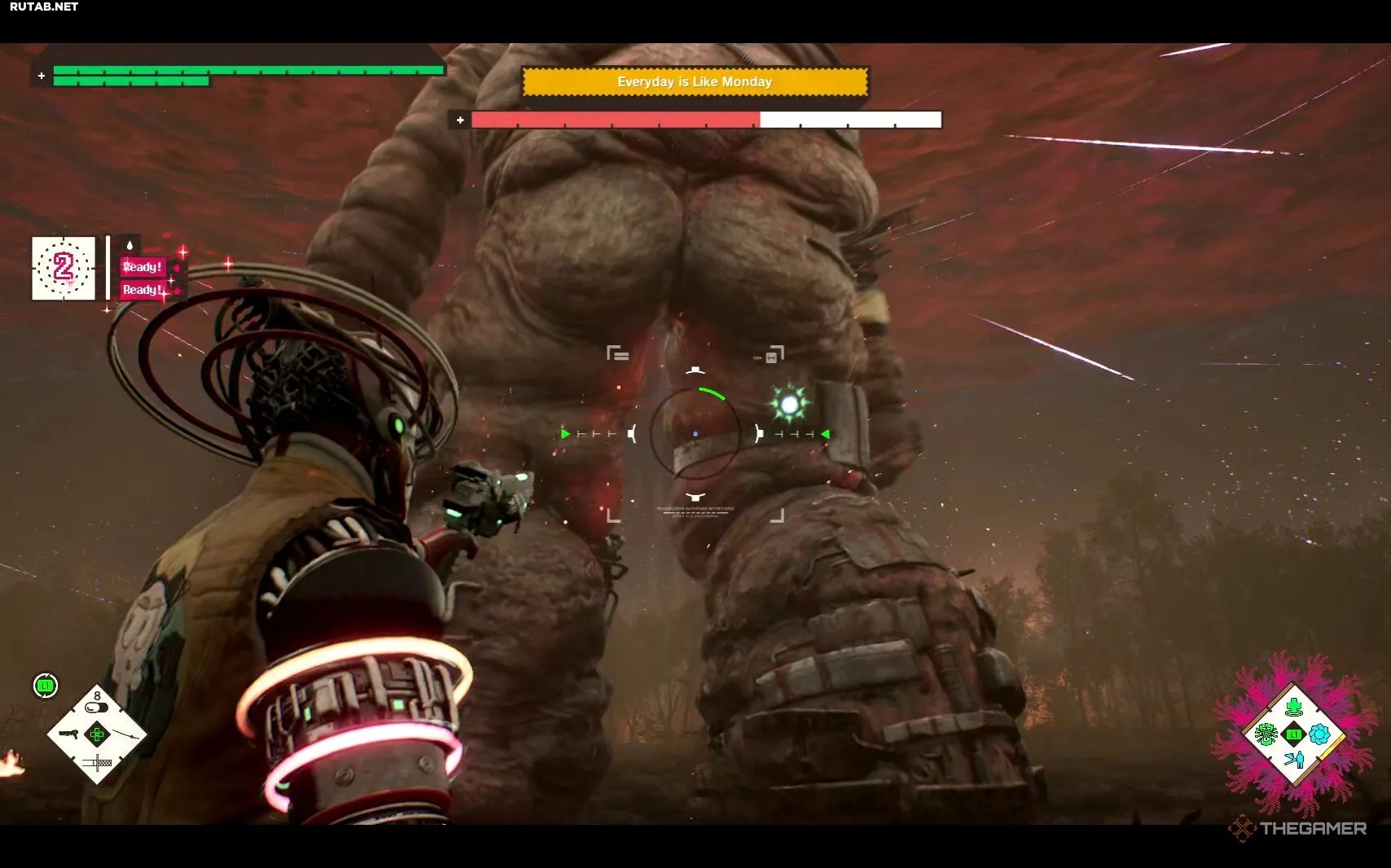 Everyday Is Like Monday — крепкий босс, но есть способы ускорить победу. Во-первых, у него есть две очень заметные уязвимые точки, в которые нужно целиться из пистолета: одна на колене, а другая — на спине.