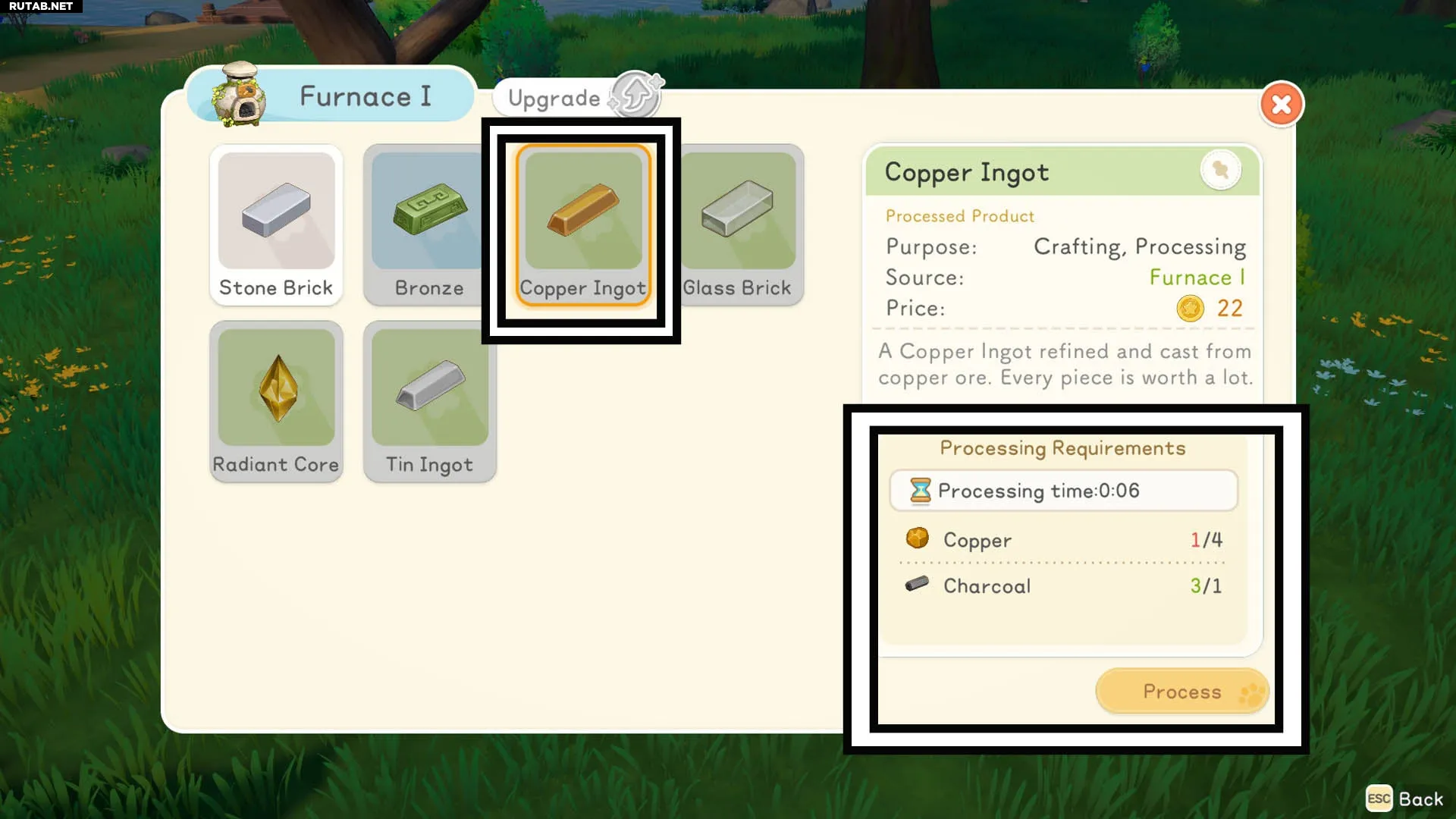 Когда все материалы собраны, подойдите к печи. Для создания одного медного слитка потребуется: