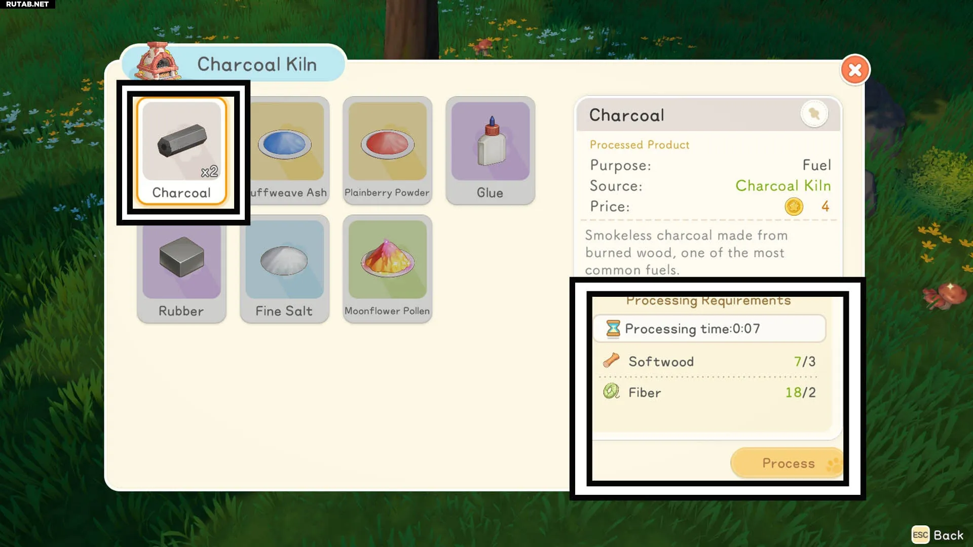 После постройки углевыжигательной печи изготовьте одну единицу древесного угля. Для этого используйте три единицы мягкой древесины и два волокна. Готовый уголь положите в рюкзак — он скоро понадобится.