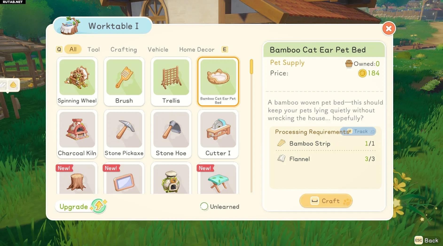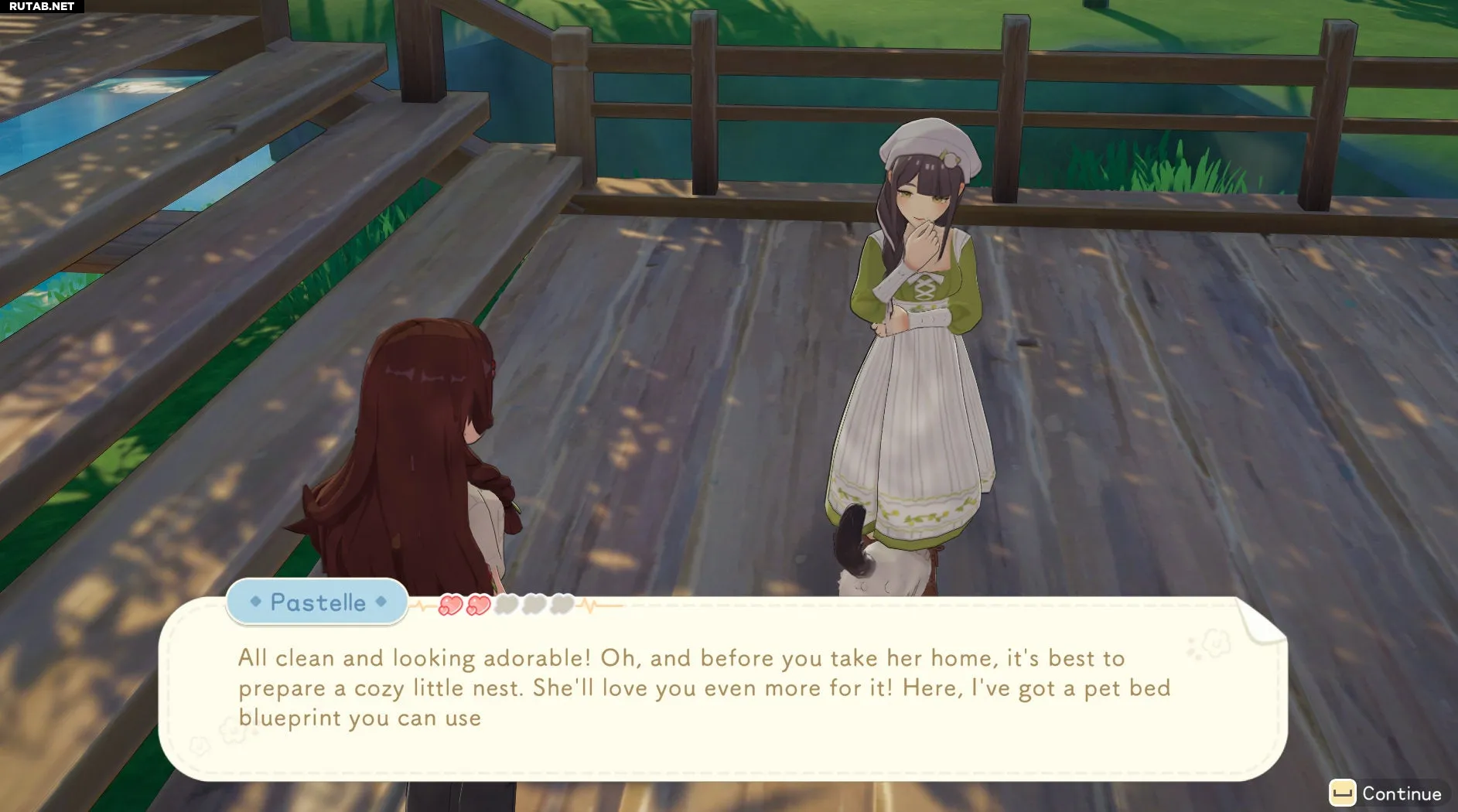 Если это произошло, то при следующей встрече Пастелла упомянет о питомце, которого вы встретили. Она выкупает его и даст вам шанс усыновить. Однако перед этим вам нужно будет сделать лежанку для питомца, и Пастелла даст вам рецепт «Лежанки для питомца с кошачьими ушками из бамбука». Если вы хотите усыновить этого питомца, вам придется сделать эту лежанку!