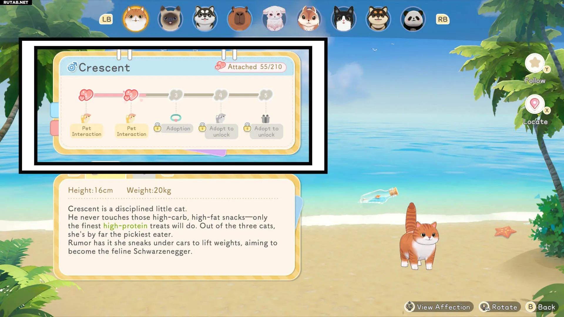 Если в какой-то день вы не можете найти своего будущего питомца, проверьте карту и найдите его значок. Нажмите на значок и используйте функцию «Отслеживать», чтобы проложить маршрут к нему. Животные часто перемещаются по карте, особенно Меллоуэн, Окта и Зиппи, которые любят уходить далеко.