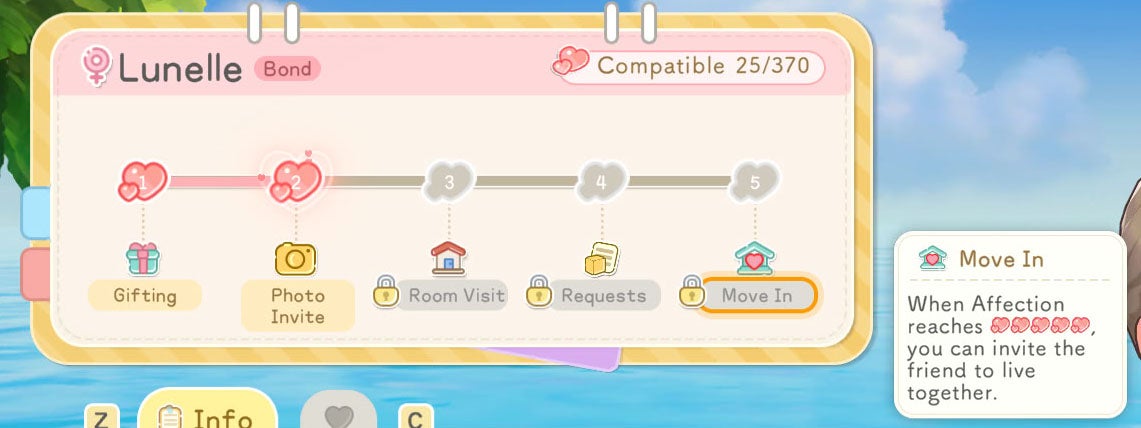 С каждым персонажем можно пройти пять уровней сердец, которые отображаются количеством сердец рядом с ним. В начале игры у вас будет ноль сердец со всеми, даже с другом детства. Повышая Привязанность персонажа, вы будете постепенно подниматься по уровням.