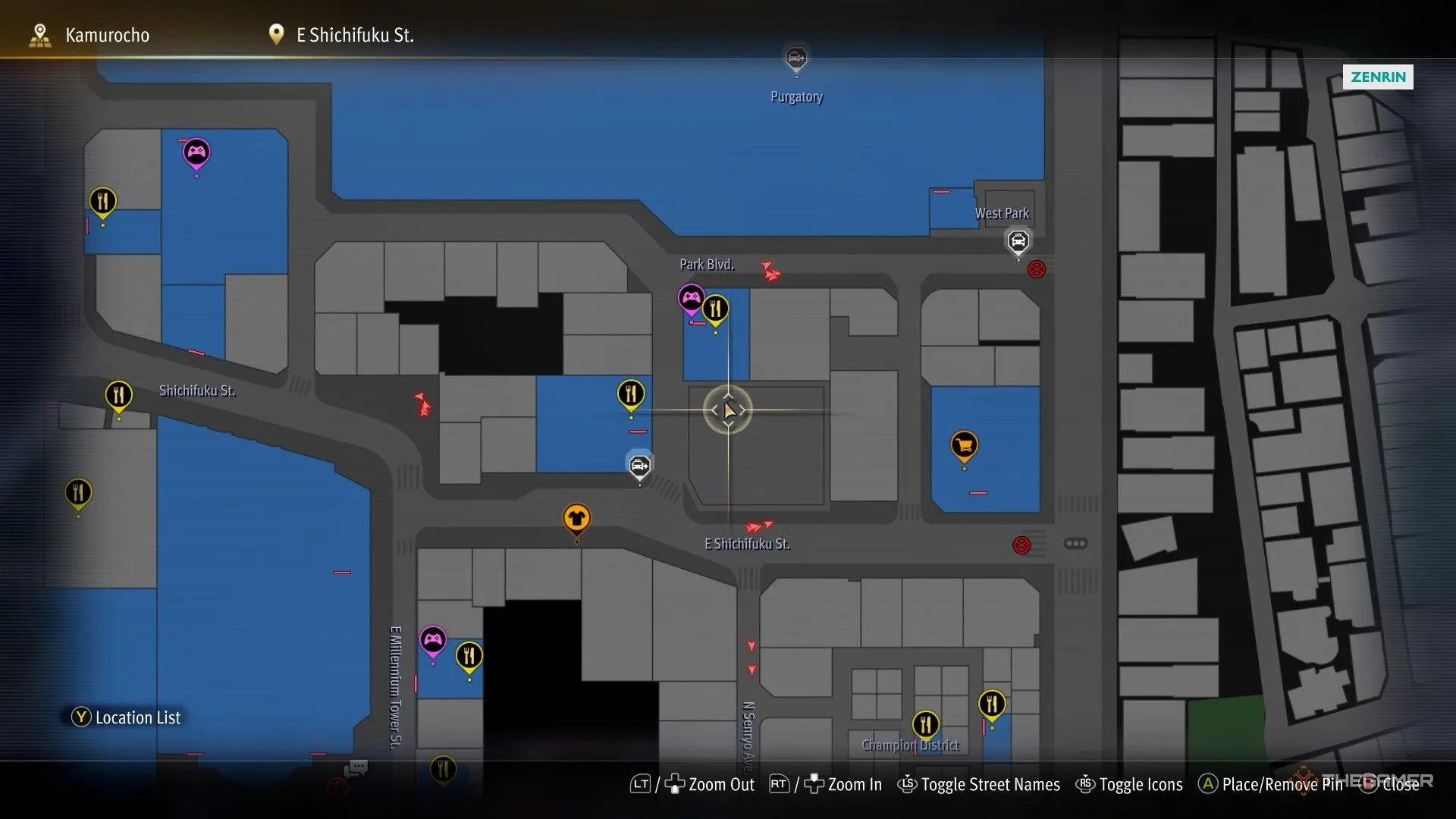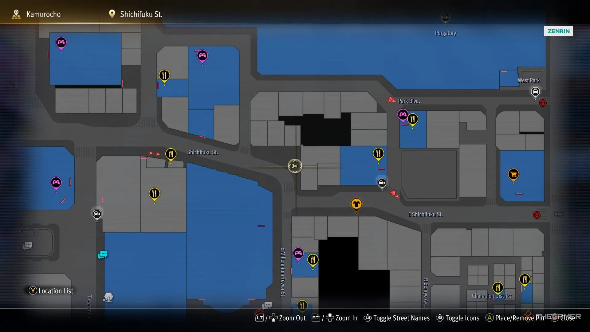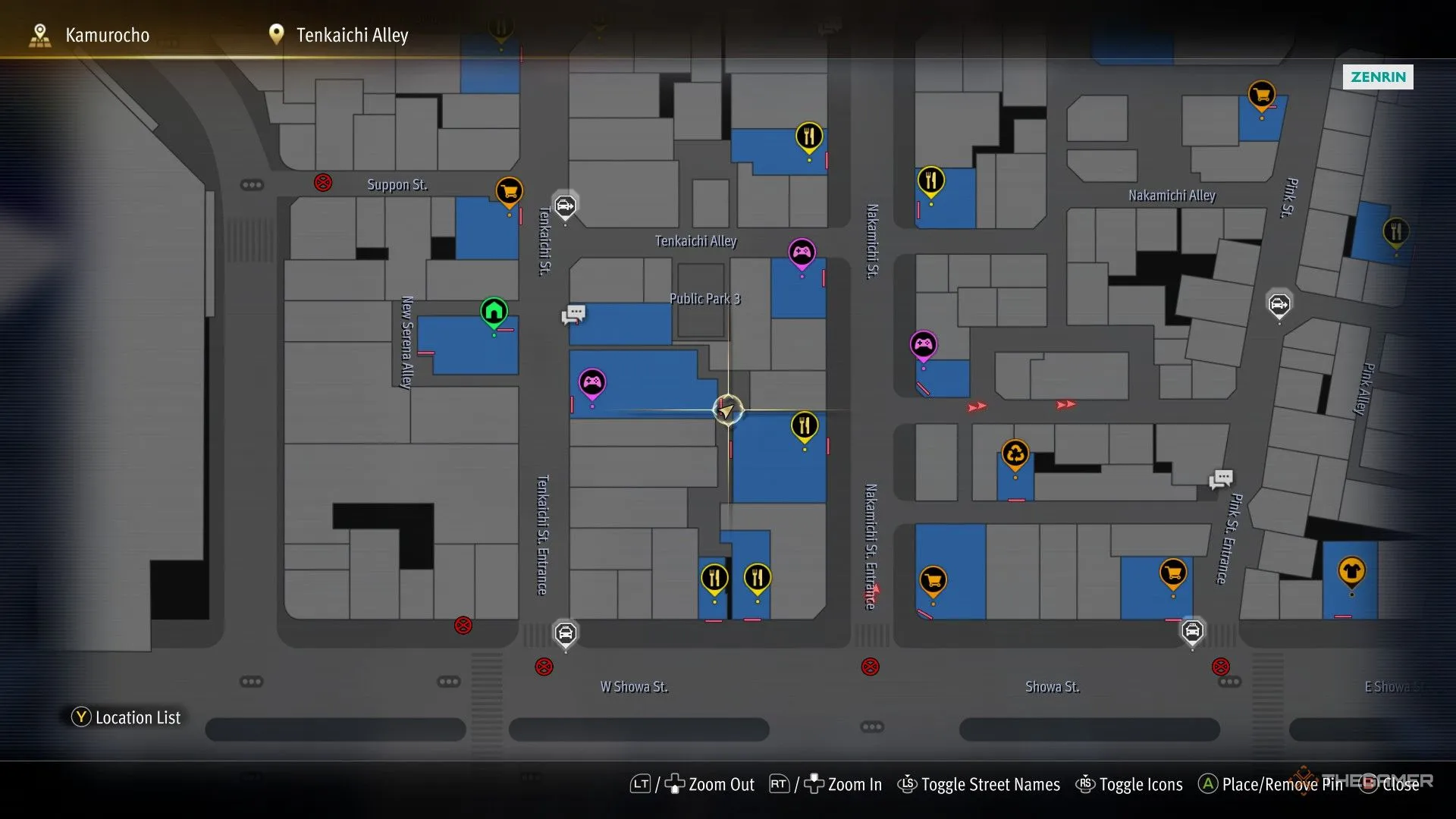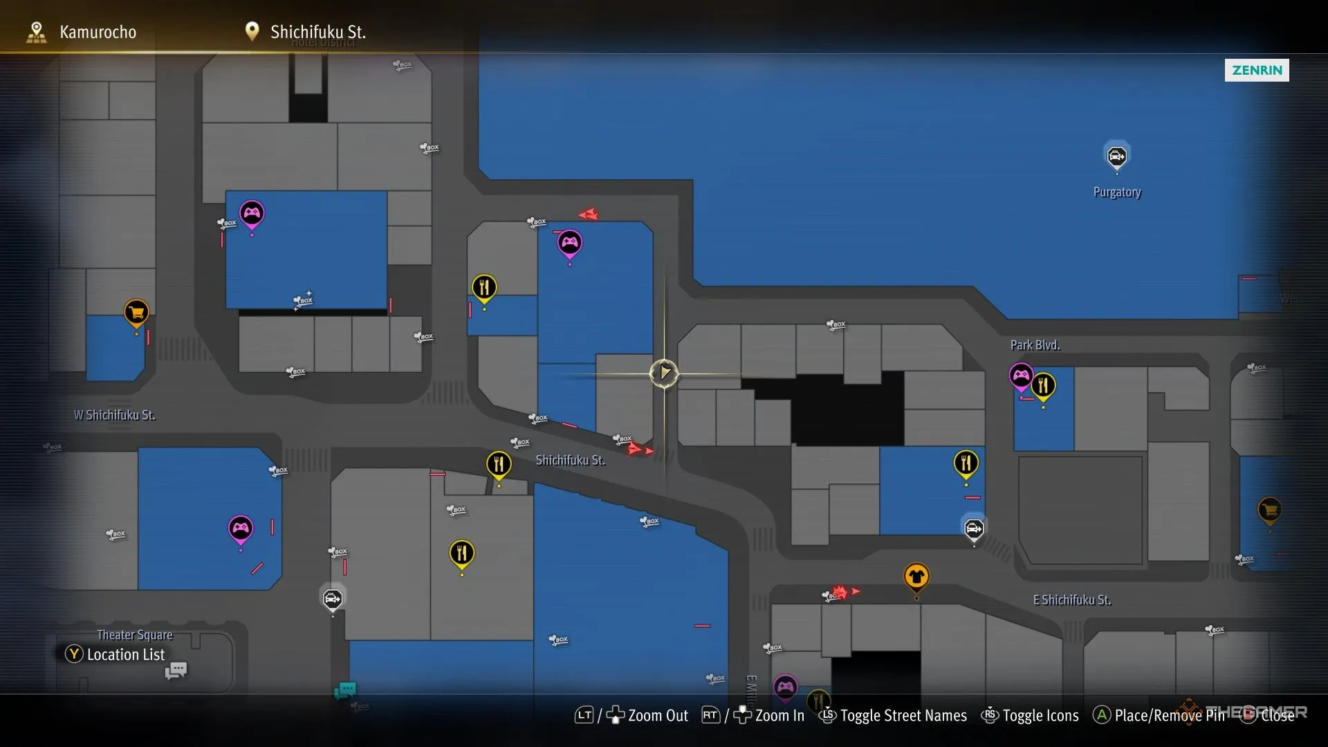 Находится примерно на середине пути от улицы Ситифуку к игорному залу, на синей вертикальной вывеске с западной стороны дороги.
