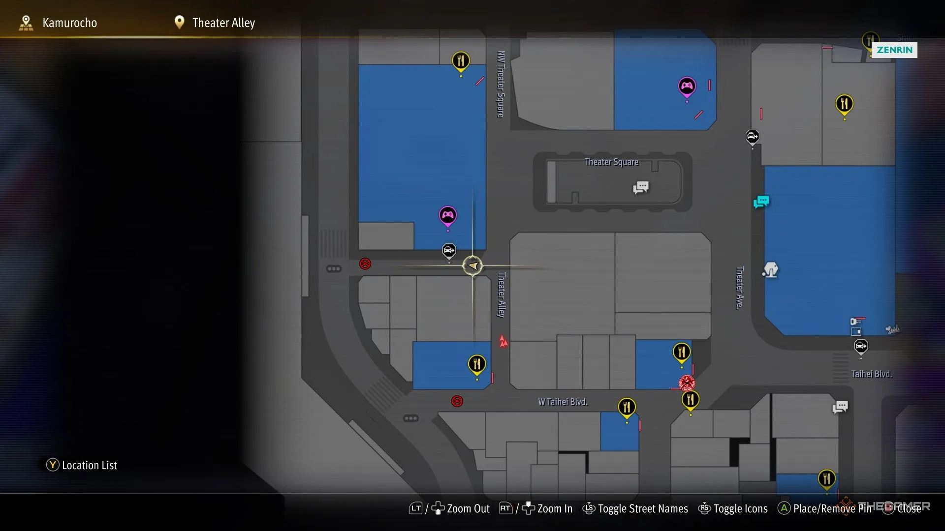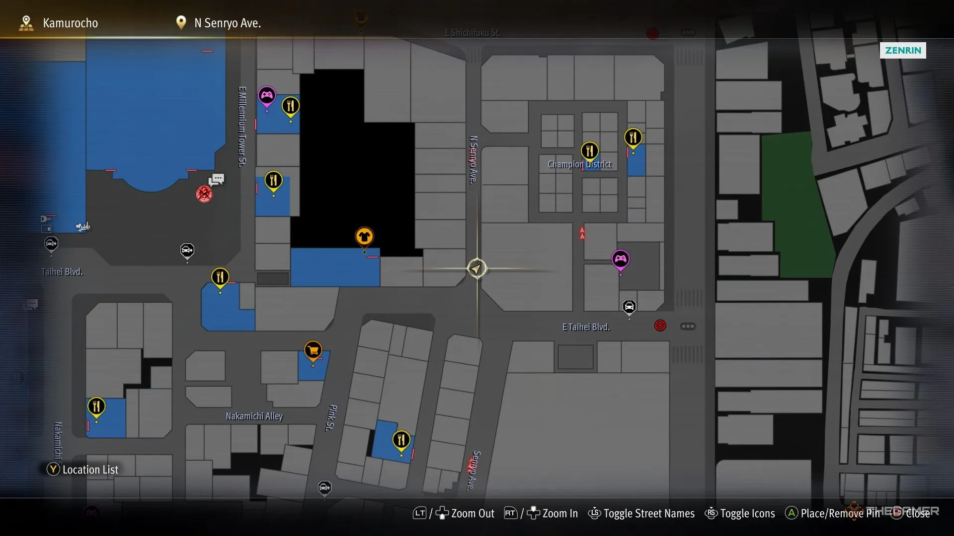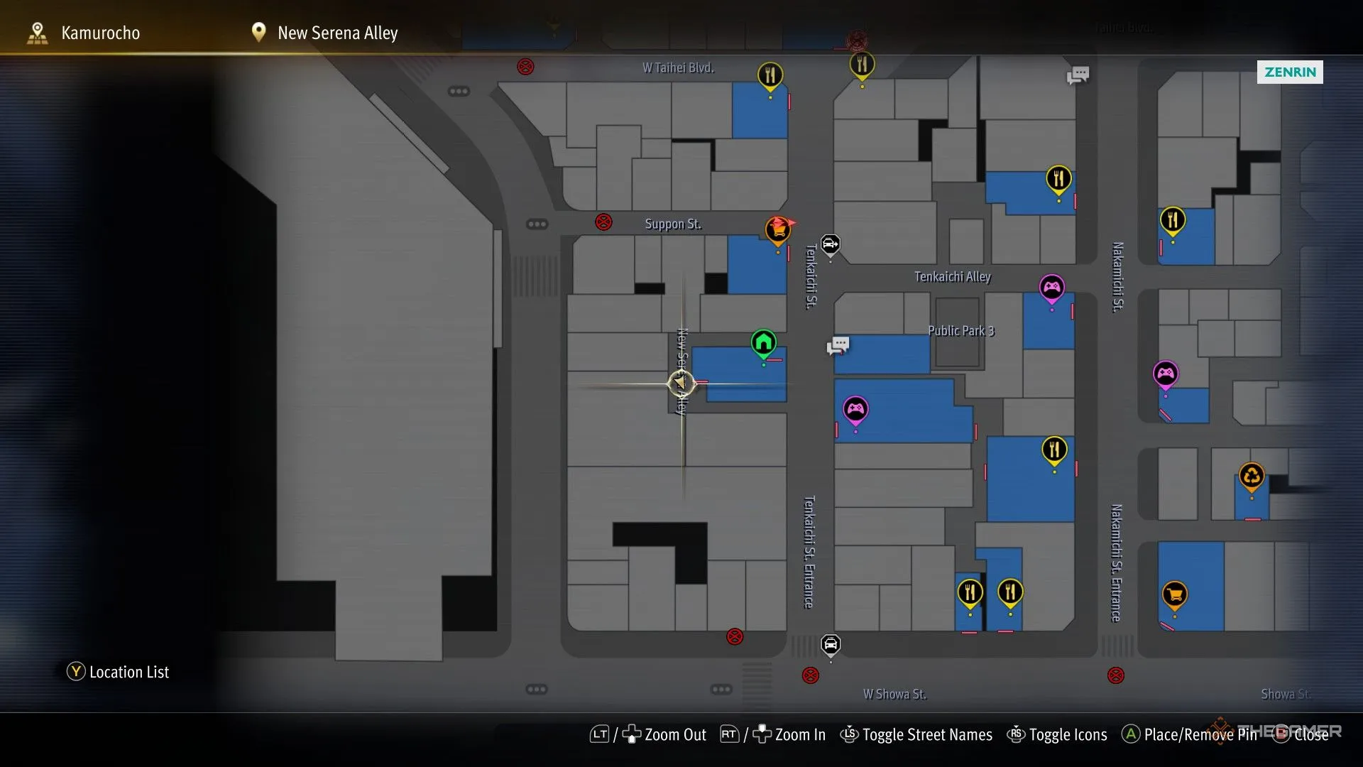 Находится примерно на середине пути от улицы Ситифуку к игорному залу, на синей вертикальной вывеске с западной стороны дороги.