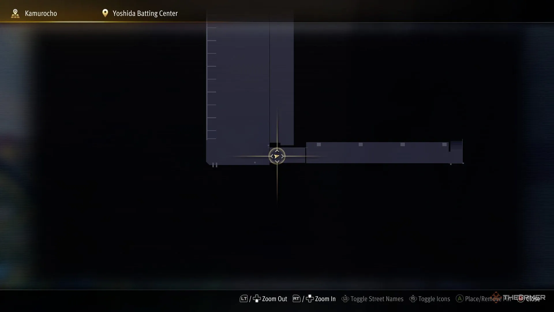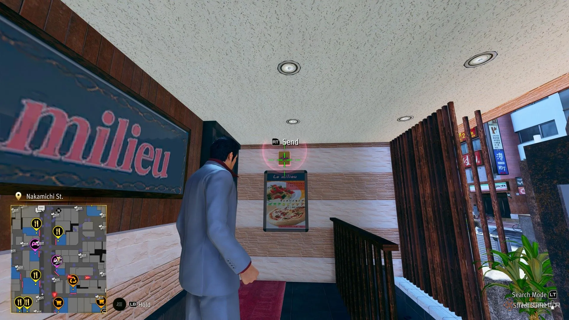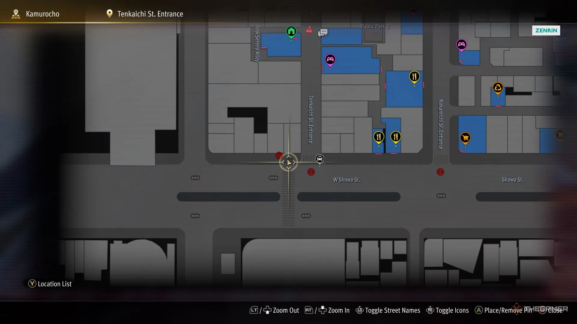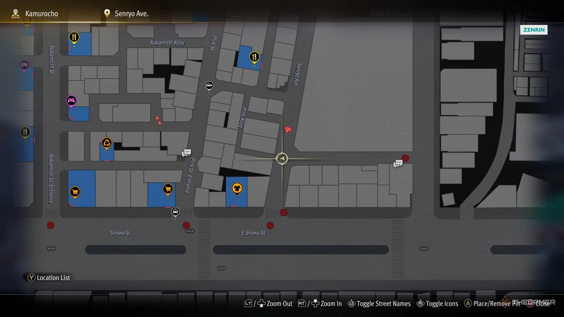 Находится примерно на середине пути от улицы Ситифуку к игорному залу, на синей вертикальной вывеске с западной стороны дороги.