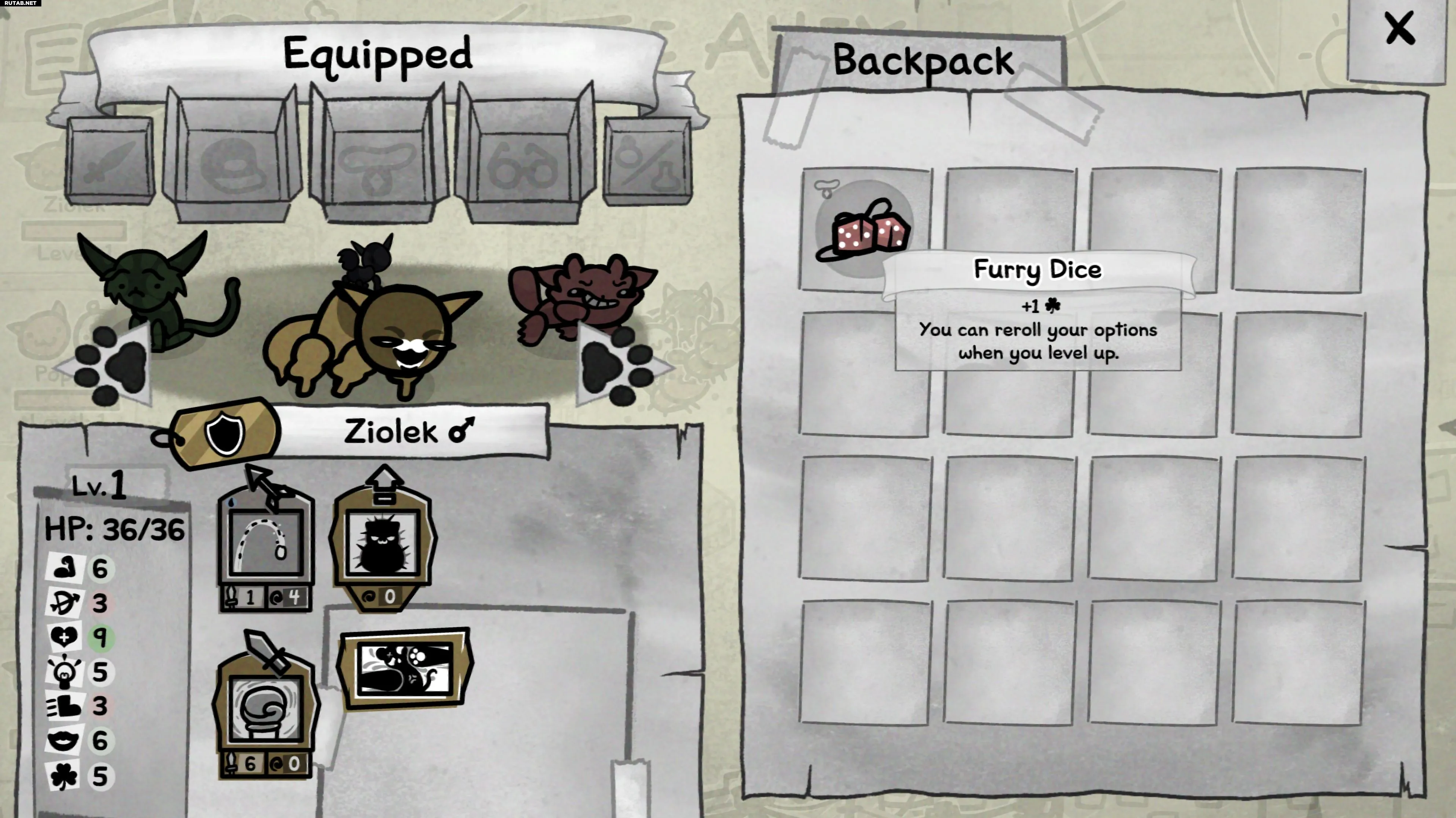 «Пушистые кости» занимают слот шейной брони, а «D6» — слот аксессуара. «Пушистые кости» позволяют перебрасывать варианты каждый раз, когда этот конкретный кот повышает уровень, а также дают +1 к характеристике Удачи. Удача влияет на базовый шанс критического удара и все случайные элементы в игре, поэтому этот бонус также будет полезен.