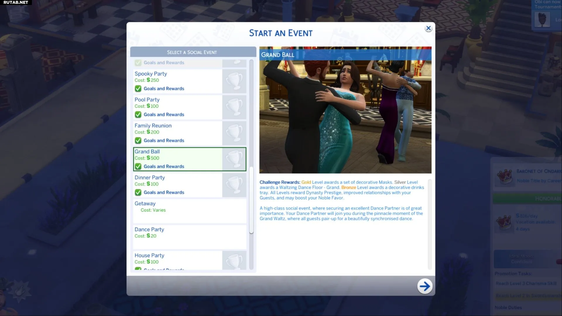 Вы можете создать событие «Большой Бал» с целями и наградами или без них. Организация бала приносит хозяину Престиж Династии, повышает Королевскую благосклонность и улучшает отношения с гостями. Если вы выберете событие с целями, то по его окончании получите дополнительные награды в зависимости от заработанной медали.