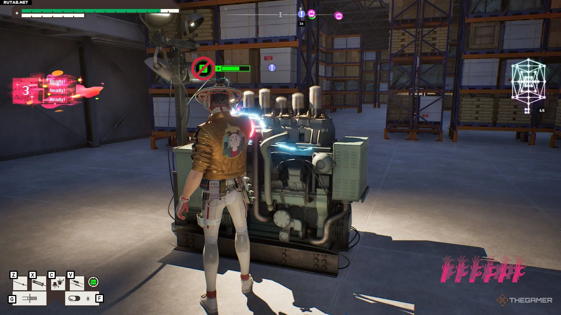Этот телевизор перенесёт вас на склад на первом этаже. Последний генератор находится в конце этого пути, который кишит врагами. Здесь же, немного попрыгав по верхушкам стеллажей, можно добраться до значка.После активации последнего генератора рядом появится новый телевизор.