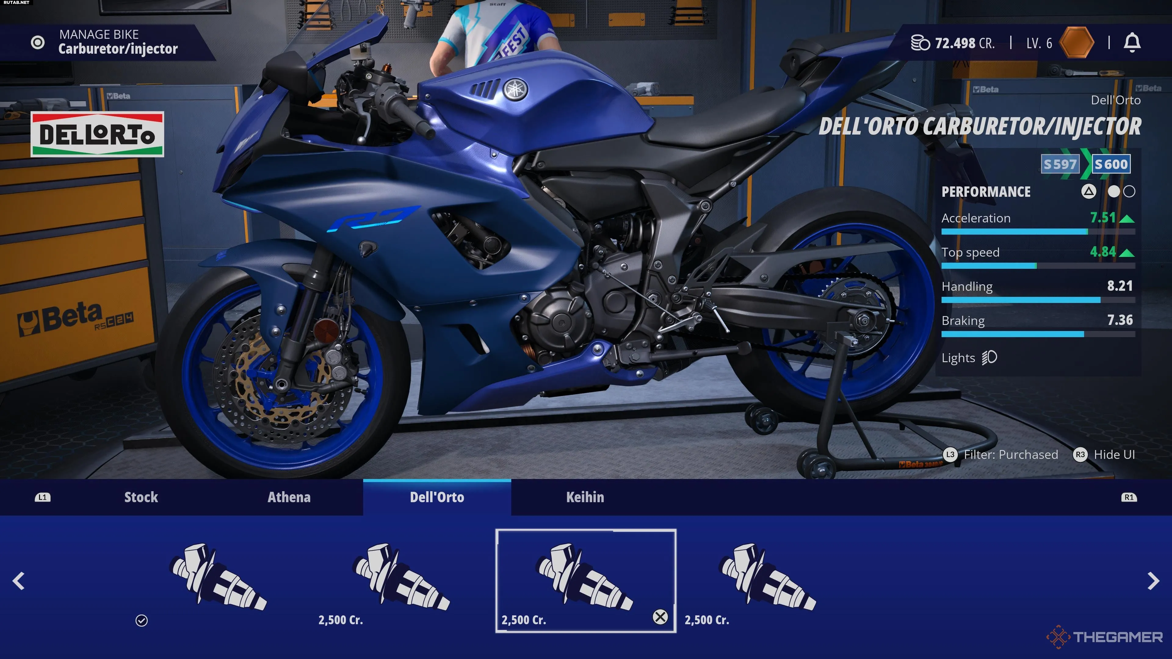 Как только будете готовы, отправляйтесь в гараж, чтобы поработать над стандартным байком. Улучшение деталей также изменит рейтинг мотоцикла, который показывает его конкурентоспособность.