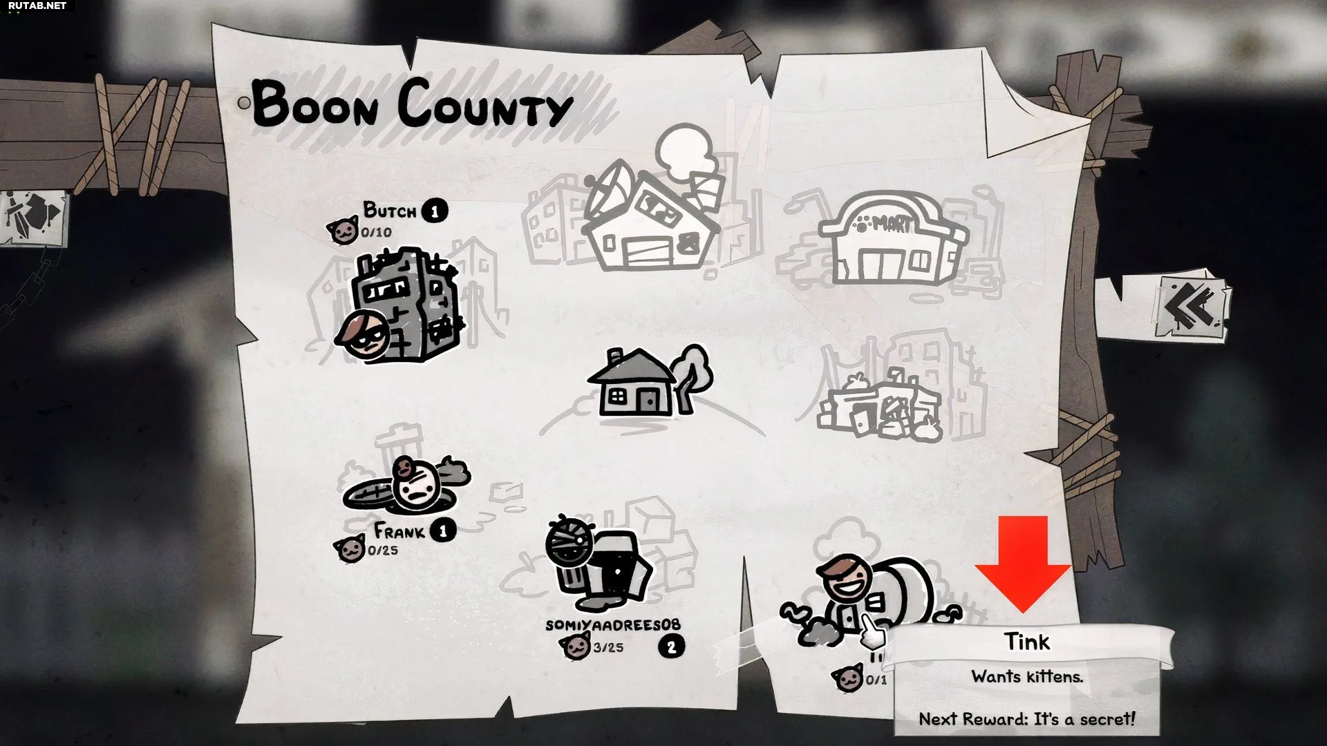 Мистер Тинклс, известный в городе как Тинк, предлагает шесть уникальных улучшений, а также одно дополнительное, которое можно получать бесконечно. Он женат, но у него пока нет детей, поэтому он планирует завести кошачью семью и просит у вас котят. К счастью, не бесплатно.