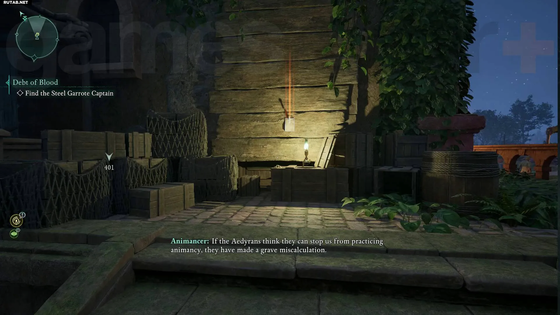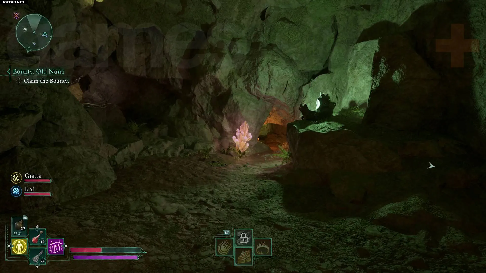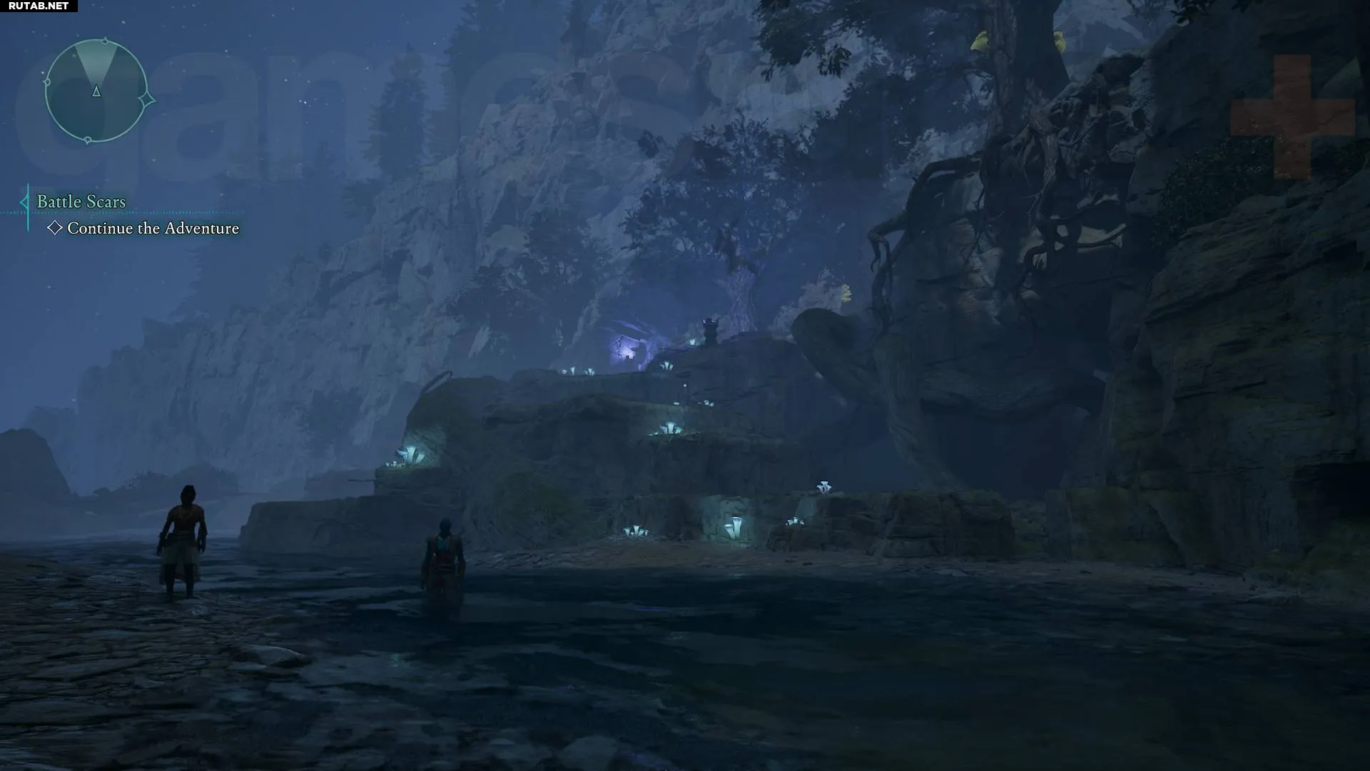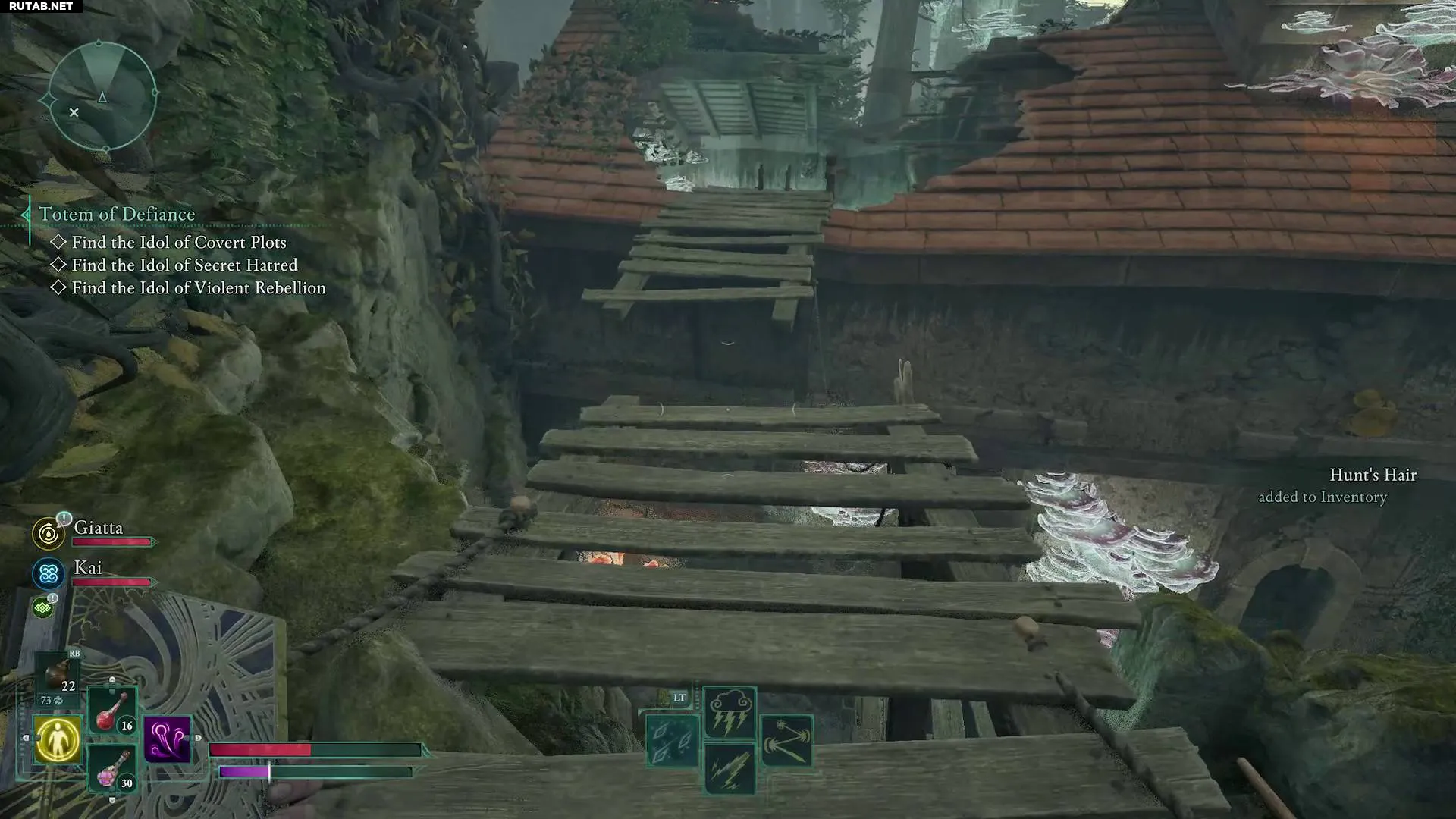 Следуйте по тропе вверх и налево, пройдите под перекинутым над тропой древесным корнем, затем развернитесь и заберитесь на него. Отсюда вы сможете подняться на каменный уступ, а затем прыгнуть на балкон разрушенной стены, где рядом с чётками лежит скелет.