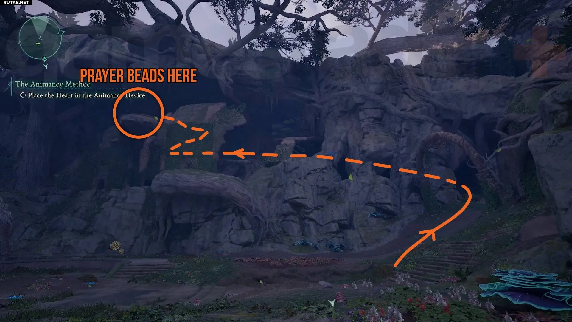 От места, где вы взяли основу тотема, пройдите по мосту из древесных корней в саму рощу. С главной поляны вы заметите руины на вершине скального образования на западе. Чётки лежат на этих руинах, но чтобы забраться наверх, нужно пройти по тропе через арку справа.