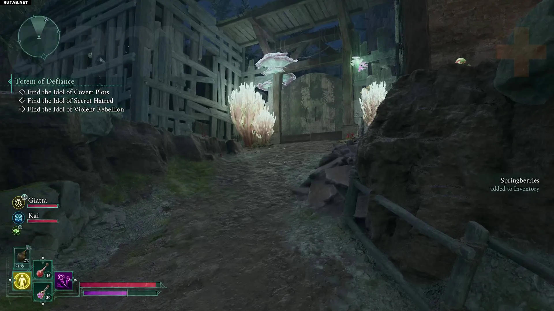 Пройдите через них, затем поверните направо и поднимитесь на холм. Это приведёт вас к лагерю, кишащему споралингами. На краю обрыва вы заметите разрушенный мост, ведущий прямо к дыре в крыше церкви. Перепрыгните через него, спуститесь вниз и соберите идол со святилища. После этого вы сможете отпереть главные двери, чтобы выбраться.