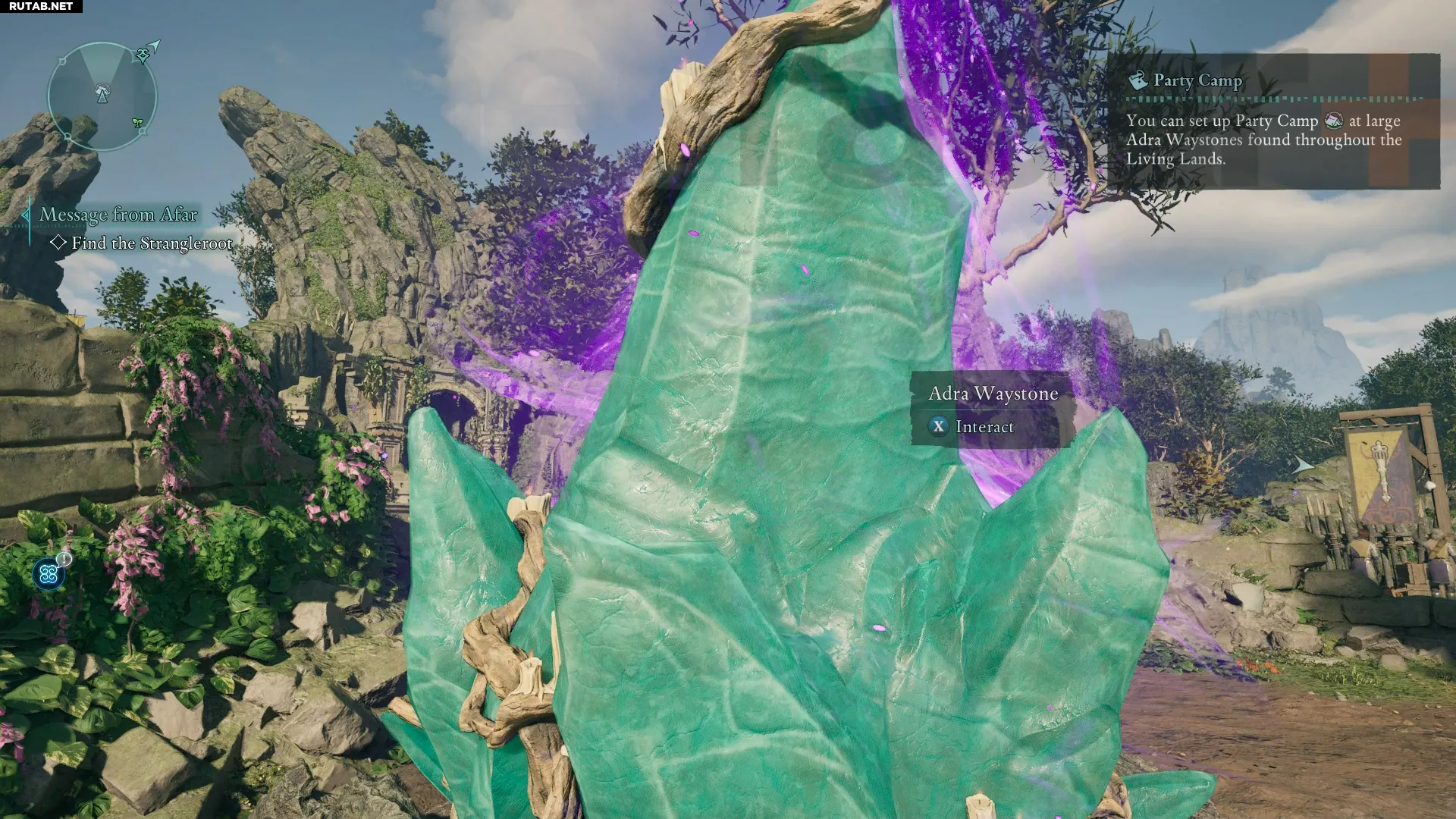 Во время путешествия обращайте внимание на большие камни Адры, разбросанные по ландшафту. Они выглядят как огромные зеленые скалы с фиолетовым сиянием, уходящим в небо. Эти камни служат основой для лагеря. Поскольку установка лагеря бесплатна, делайте это при каждой возможности. Каждая новая стоянка становится точкой быстрого перемещения, что упрощает навигацию по миру.