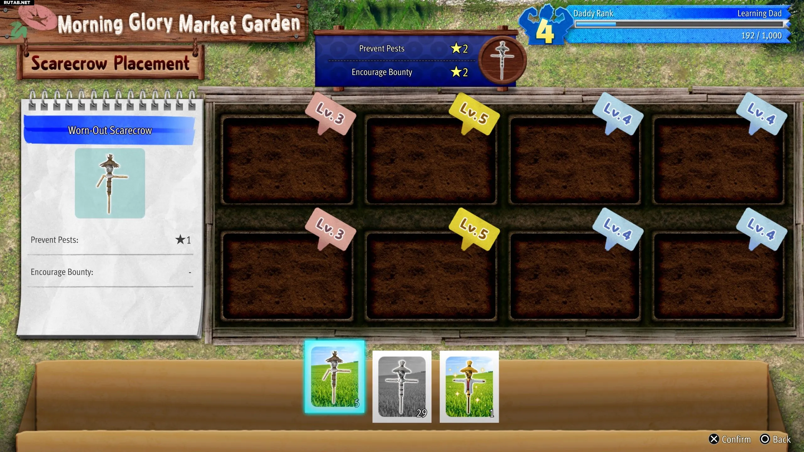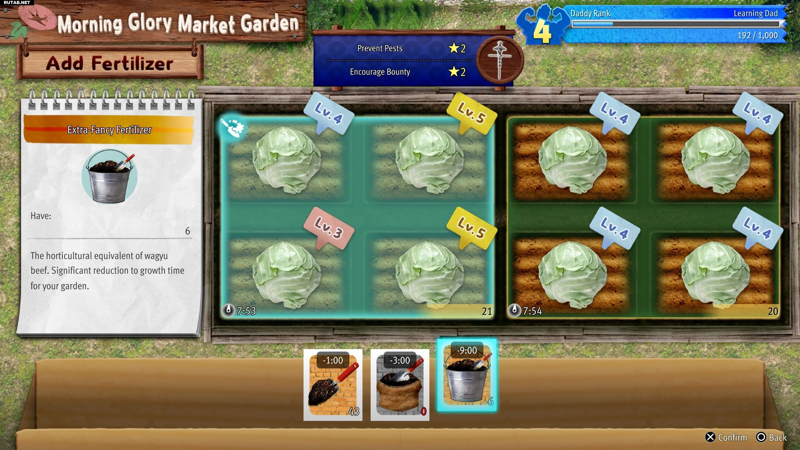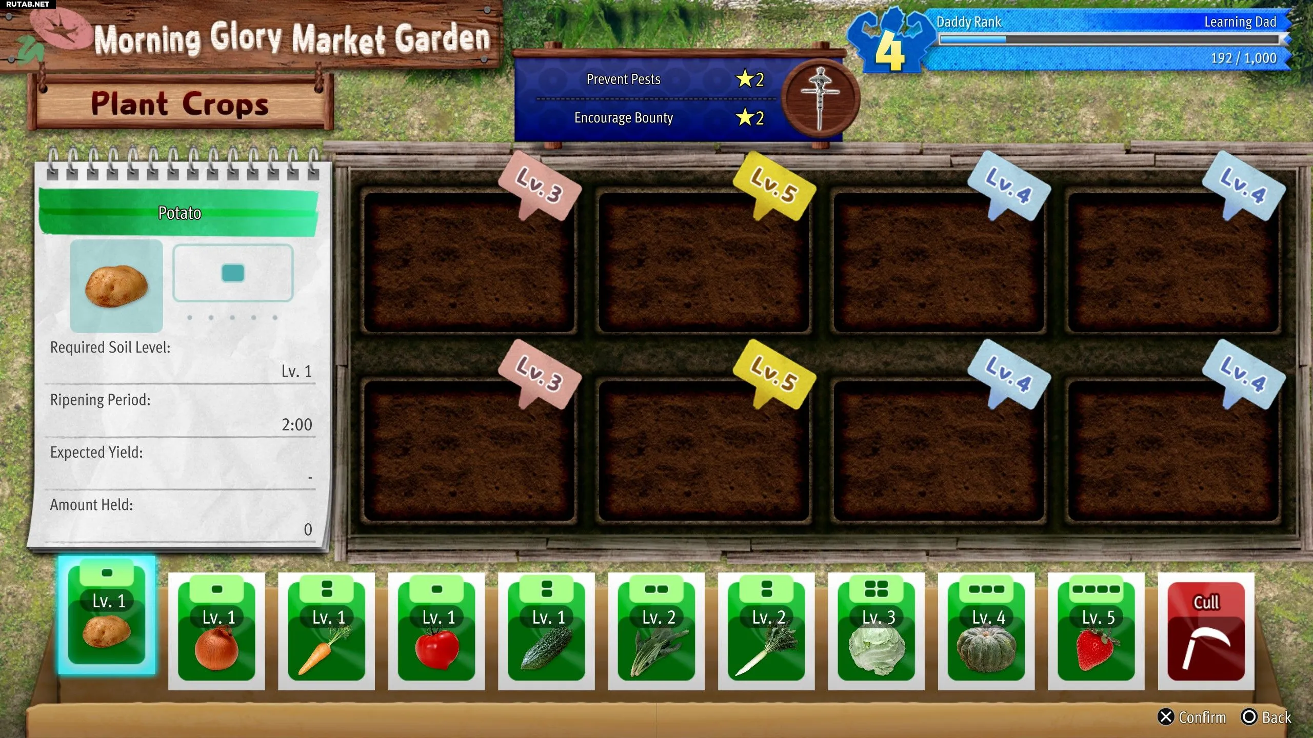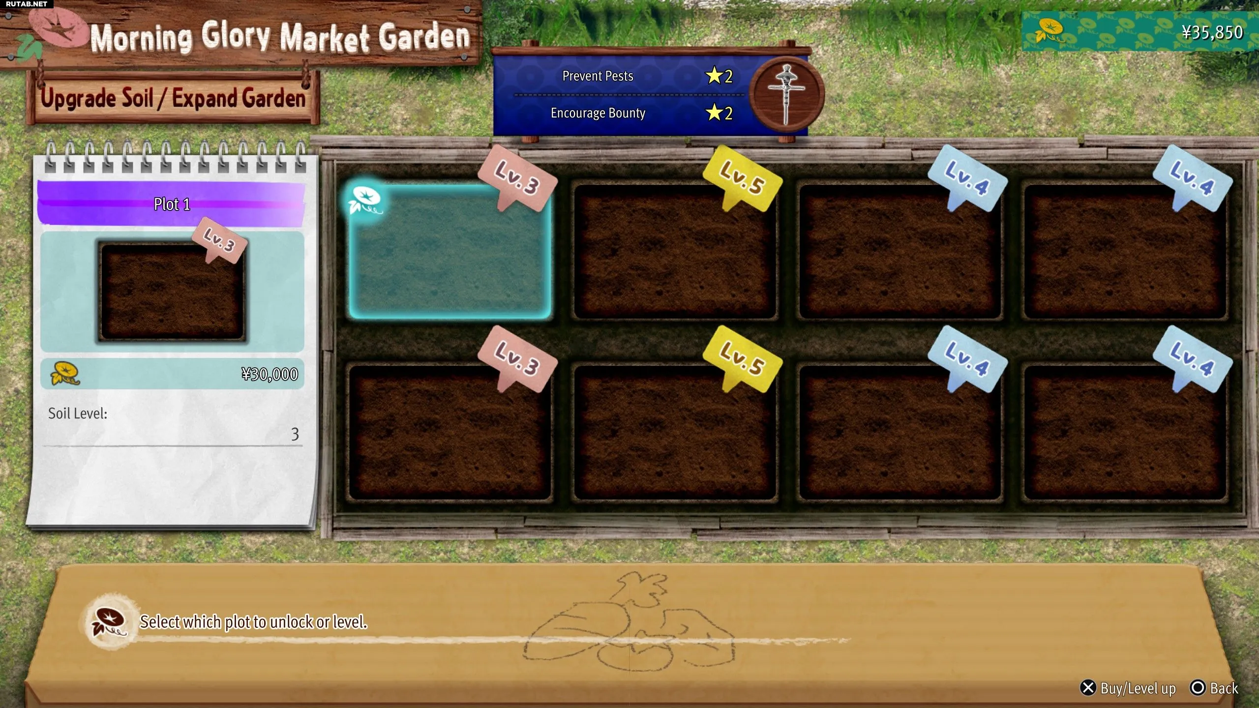 Игроки получают Фонды, выполняя задания на доске объявлений. Обычно они связаны с помощью детям или выращиванием определенных культур для соседей. Собрав достаточно Фондов, выберите табличку «Ухаживать за огородом», затем «Управлять огородом» и «Улучшить почву / Расширить огород». Стоимость улучшения каждого участка увеличивается на 10 000 иен: улучшение до 2 уровня обойдется в 20 000 иен, а до 5 уровня — в 50 000 иен.