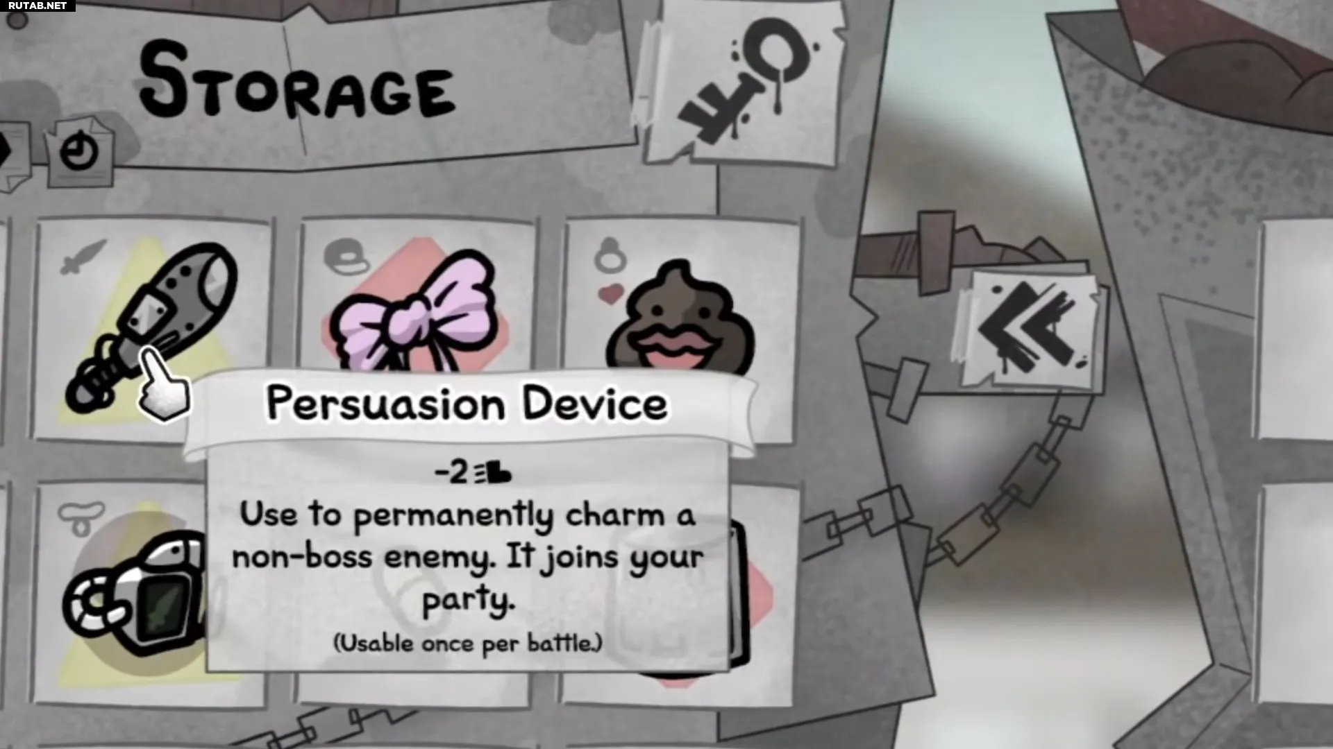 Устройство убеждения, будучи надетым на кота, снижает его показатель скорости на два. Однако его можно использовать, чтобы навсегда очаровать не-босса, после чего тот присоединится к вашему отряду и будет сражаться на вашей стороне.