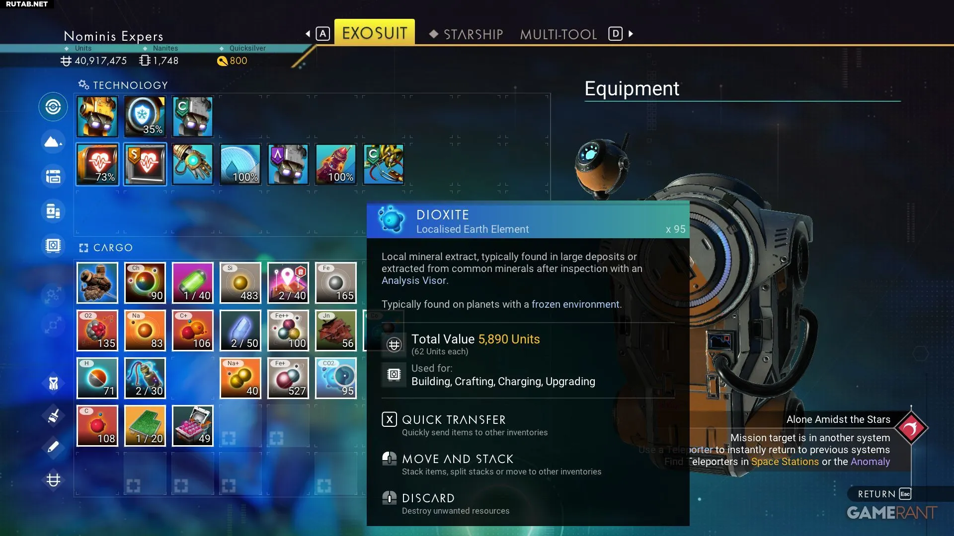 Обнаружив месторождение, переключите мультиинструмент с помощью G, чтобы активировать манипулятор рельефа. Затем можно начать добычу диоксита. Сканируя обычные минералы аналитическим визором, вы иногда обнаружите, что они также содержат небольшое количество диоксита.