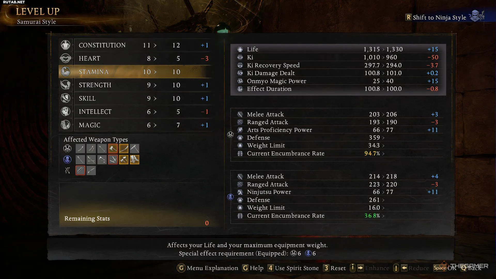 Кроме того, Мастерство и Магия в совокупности увеличивают здоровье, силу ниндзюцу, урон в ближнем бою и мощь оммёдо. Это позволяет комбинировать элементальный урон от талисманов и оммёдо с быстрыми ударами тонфы, чтобы максимально быстро накапливать водяной урон и накладывать статус Промокание.