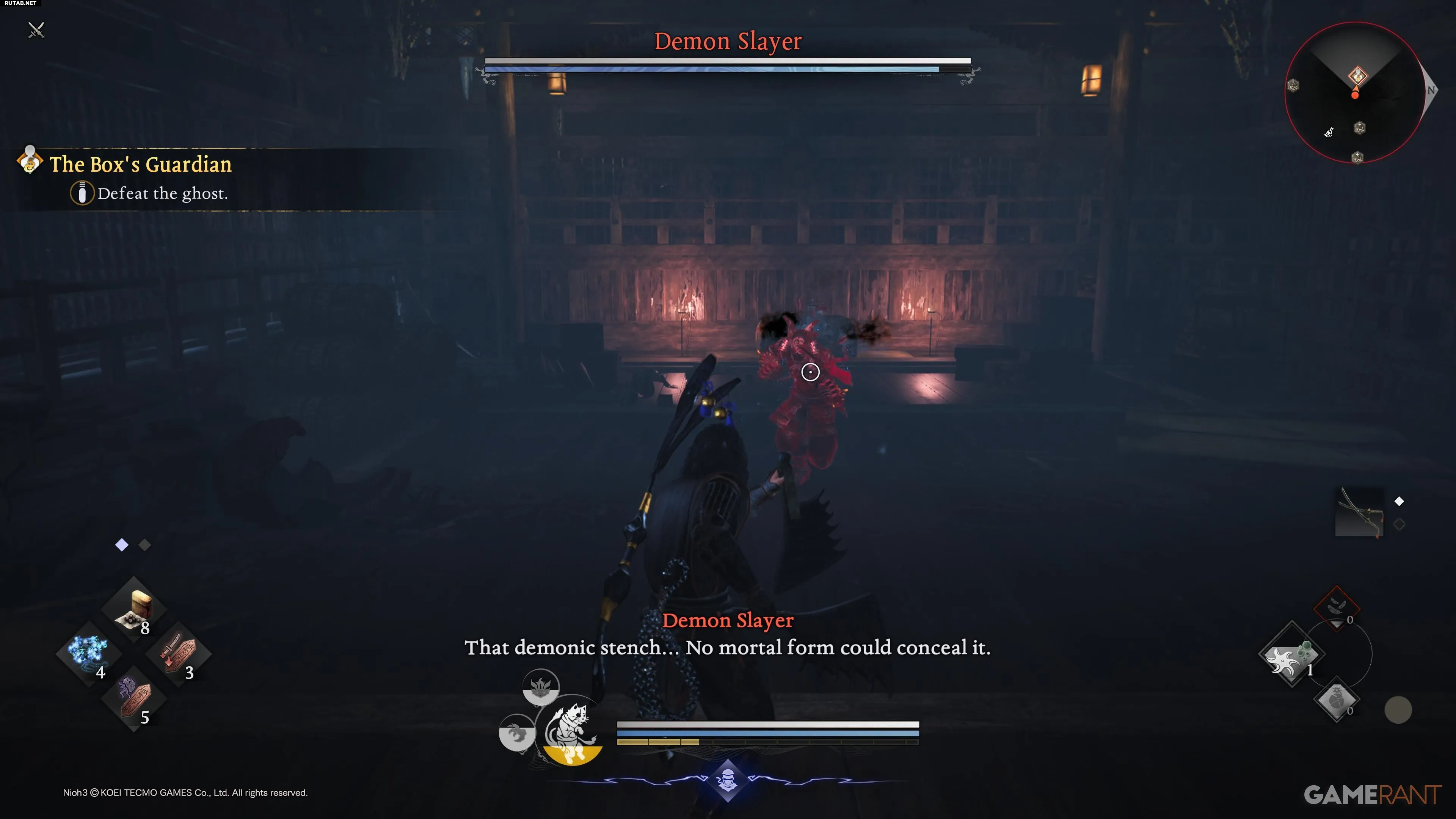 Победив Истребителя демонов, взаимодействуйте с сундуком, чтобы поговорить с Тэнгу с Курамы. После разговора появится оммёдзи, и вам предстоит сразиться с Ниндзя-ёкаем и Циклопом-они. Одолейте обоих, чтобы завершить квест и получить награду: снаряжение, Запоры ниндзя и Чертёж кузнеца: Доспехи отважного охотника на демонов.