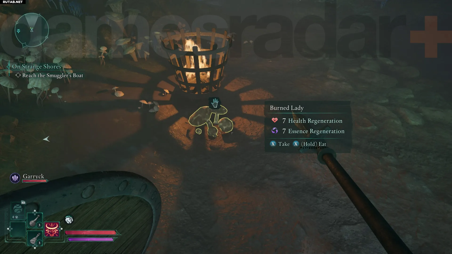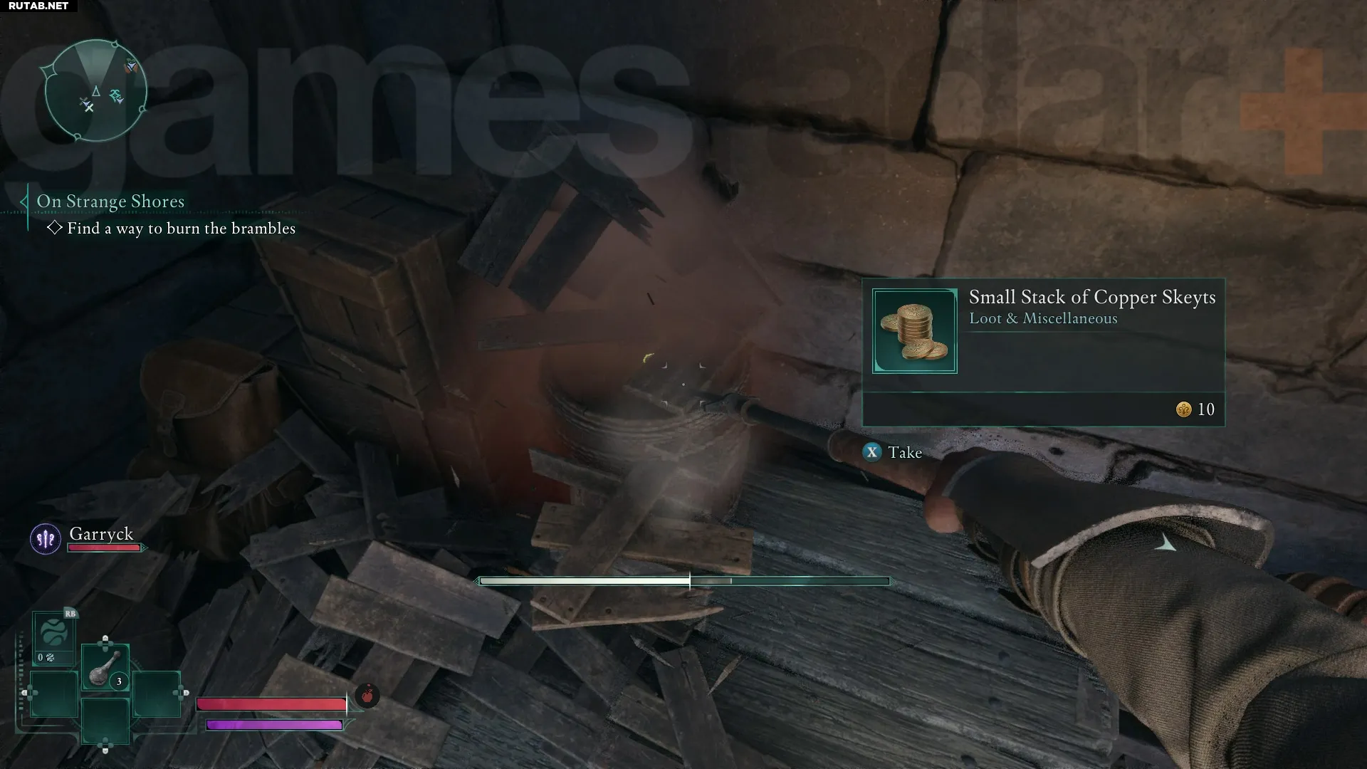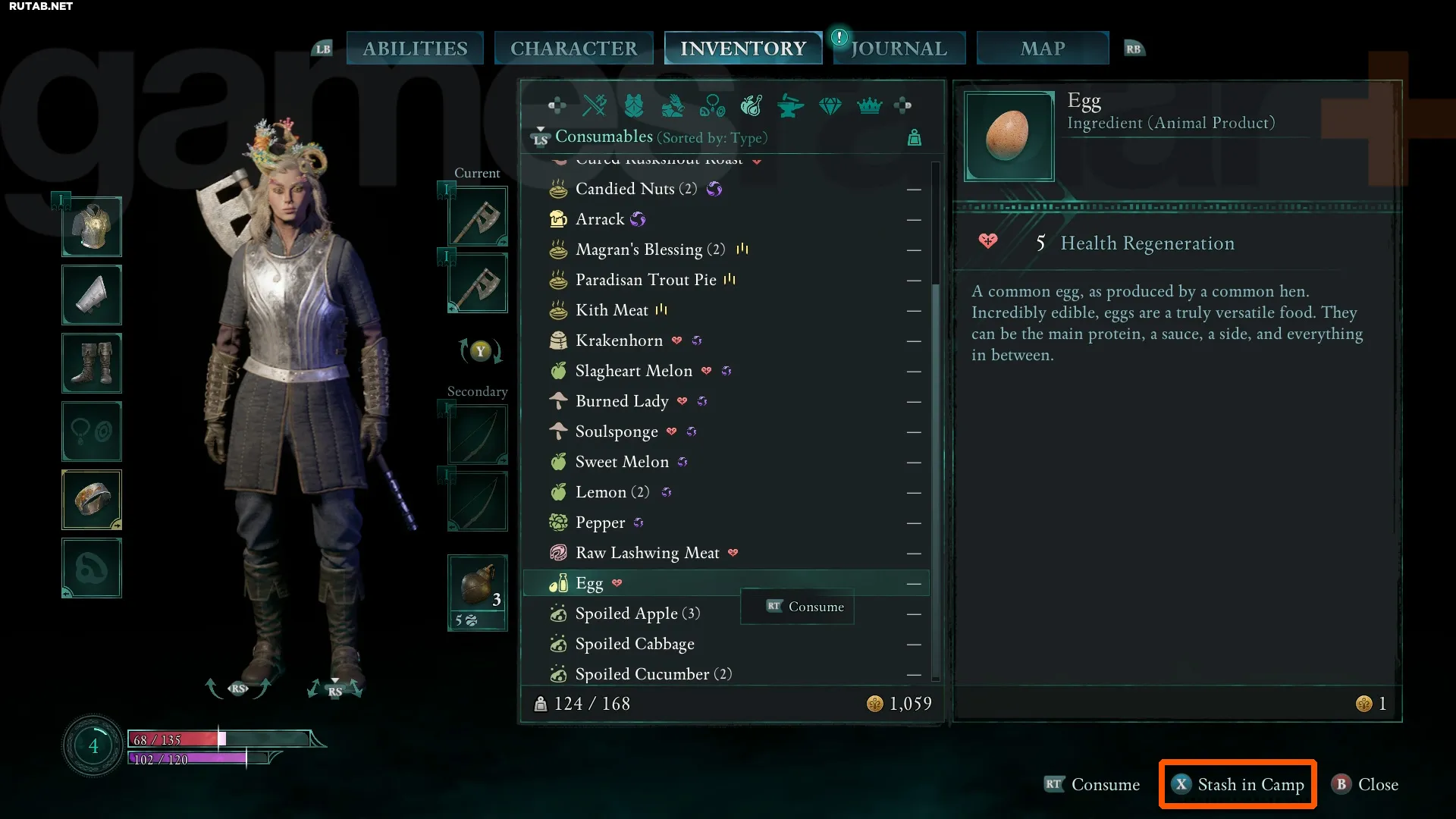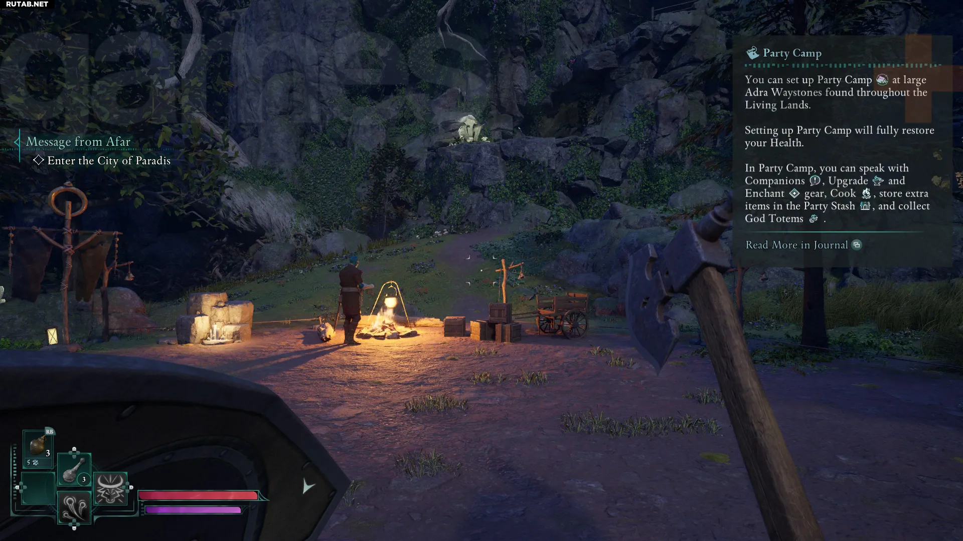 Если вы, как и положено в RPG, подбираете всё подряд, рано или поздно столкнётесь с перегрузом. Эту проблему легко решить: откройте инвентарь, наведите курсор на ненужные в данный момент предметы и выберите опцию «Спрятать в лагере» в углу экрана. Вещи волшебным образом отправятся в тайник вашего лагеря в Проклятых для последующего извлечения.