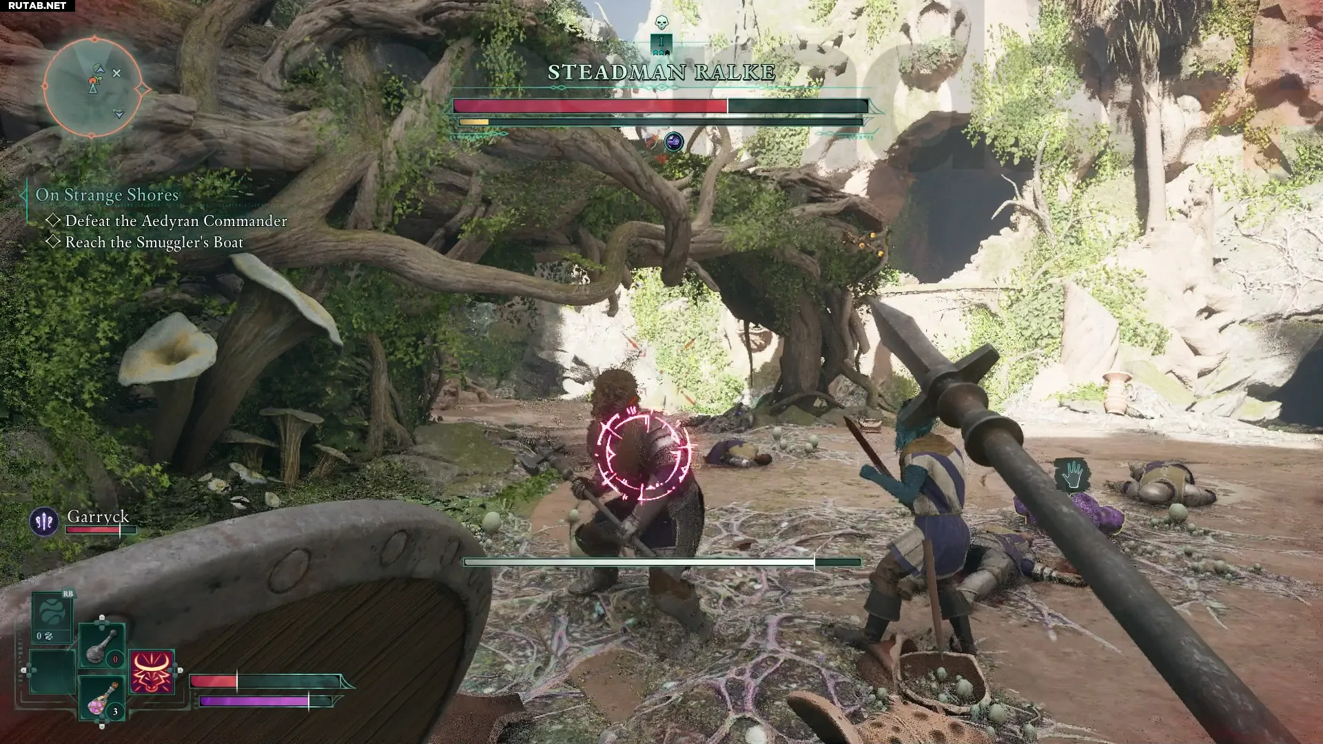 В бою вы можете удерживать кнопку блока, чтобы парировать атаки, но только если ваша вторая рука свободна или вы держите щит — то есть блокировка неэффективна для некоторых комплектов снаряжения. У некоторых врагов есть непрерываемые атаки, которые обозначаются красным кругом перед ударом, поэтому лучше всего научиться уворачиваться, чтобы гарантированно избежать урона. Для этого нажмите кнопку прыжка, двигаясь вбок или назад, чтобы совершить уворот в этом направлении. Часто это имеет дополнительное преимущество: противник на мгновение становится уязвимым после промаха, что позволяет вам нанести собственный удар.