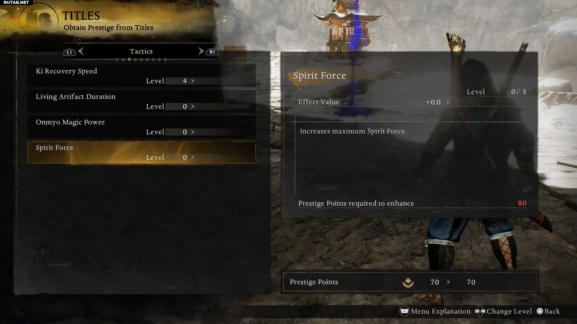 Максимальный запас Духовной силы можно увеличить, тратя очки Престижа во вкладке «Тактика» в меню «Титулы».